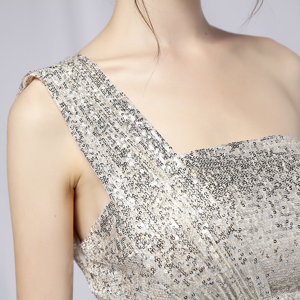 A sequined sheath with an asymmetric hem and a slim silhouette. The sleeveless cut lends a refined, modern line.