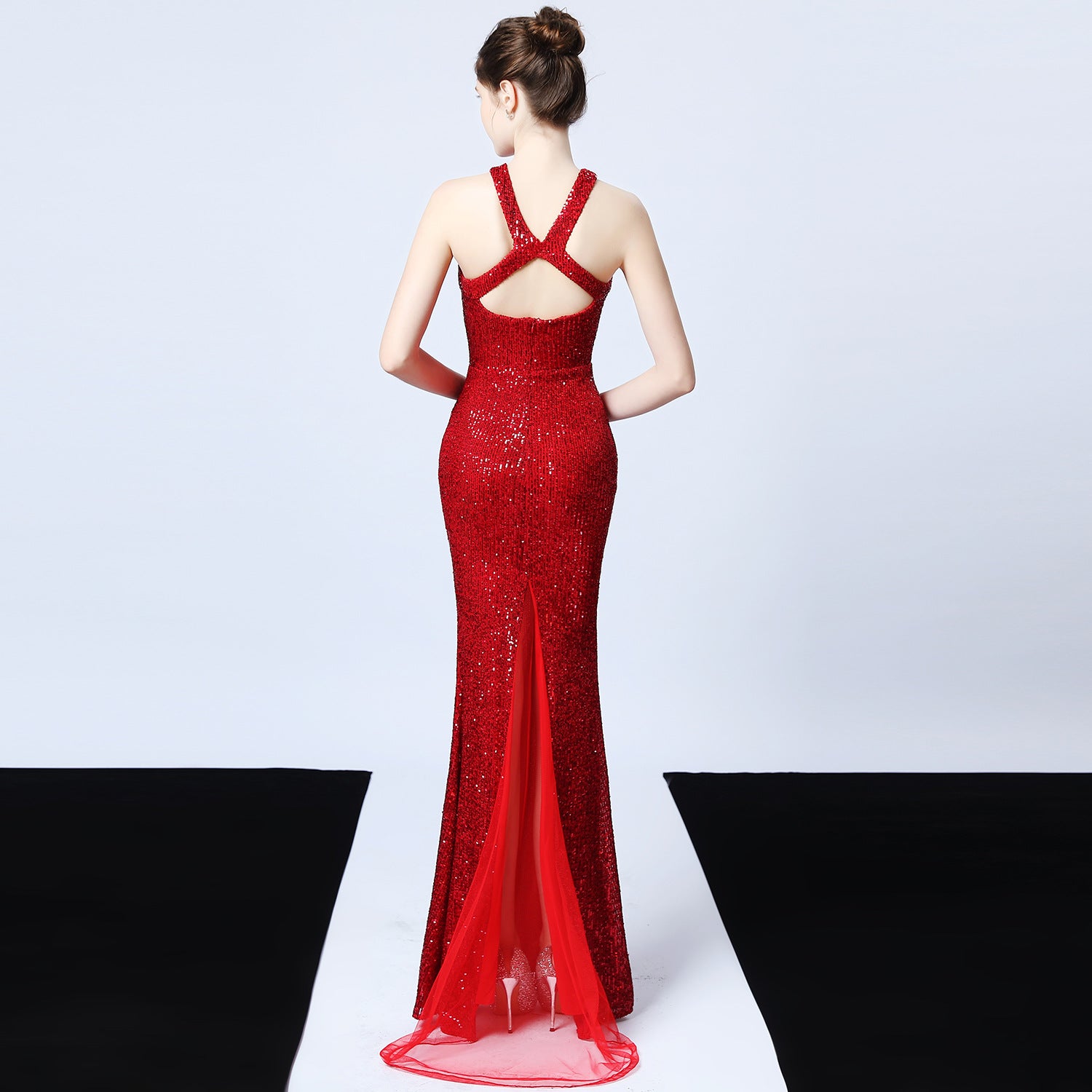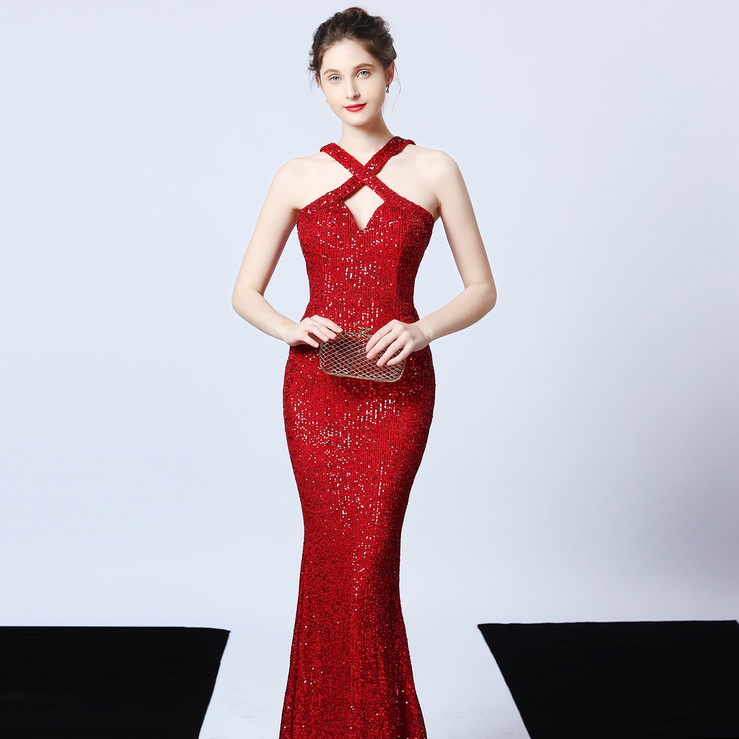 A halter-neck maxi with a slim, fitted silhouette. Sequins and cutouts add understated glamour.