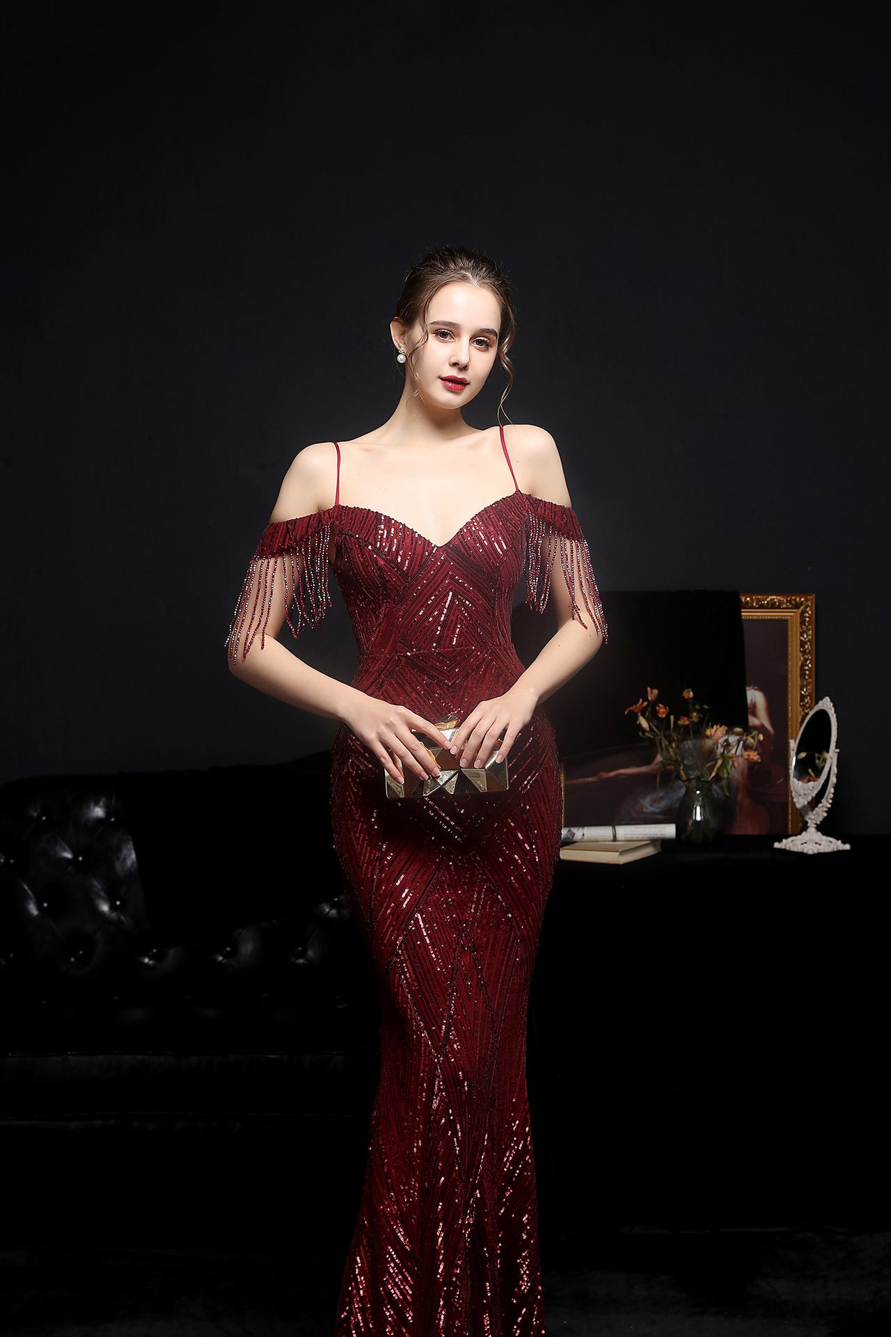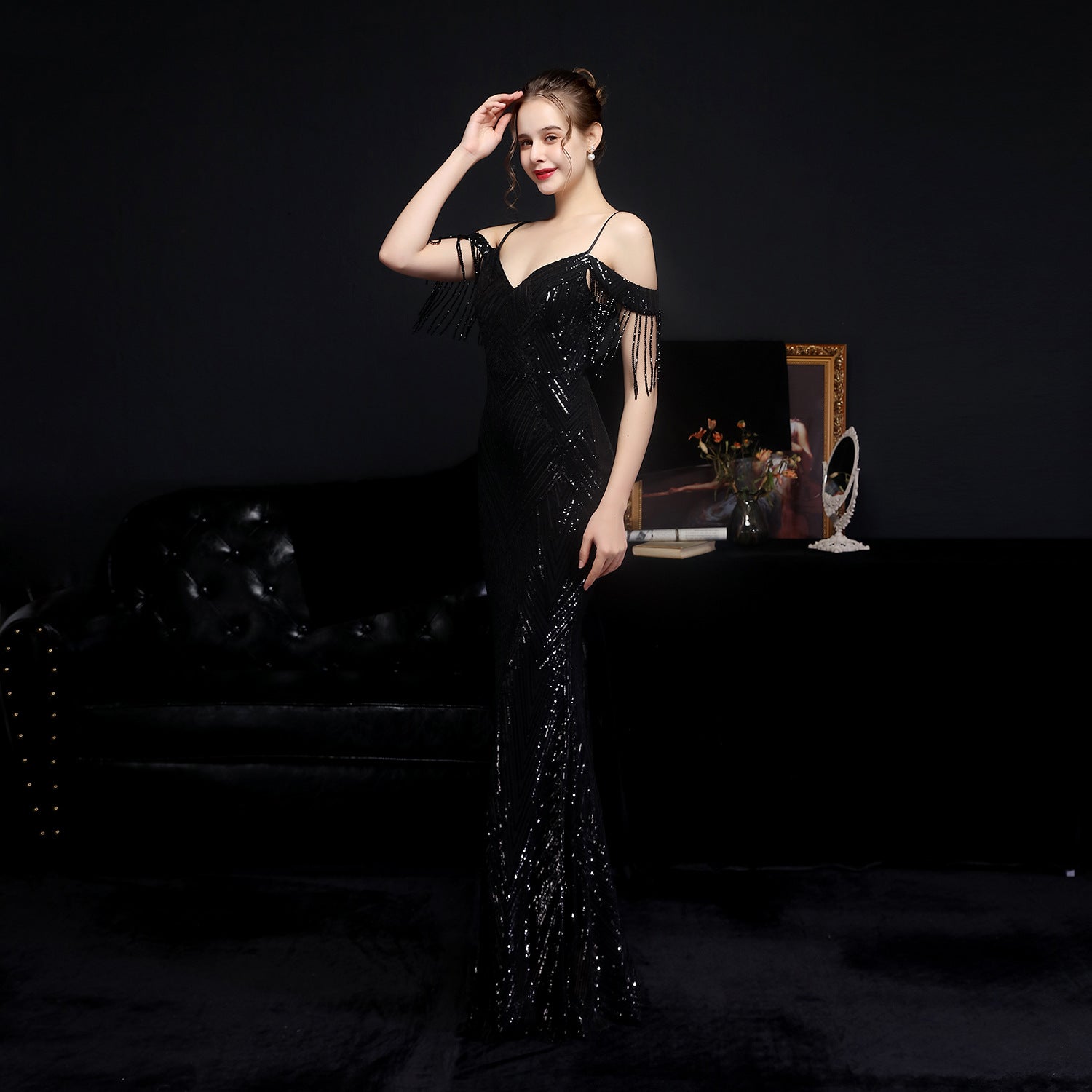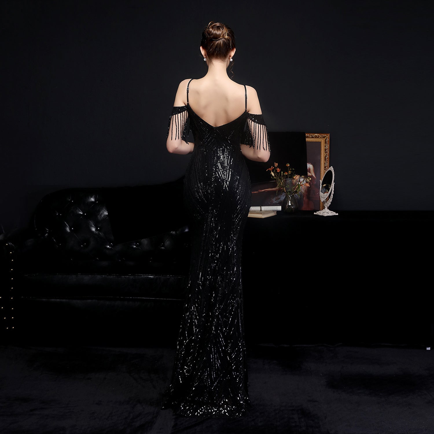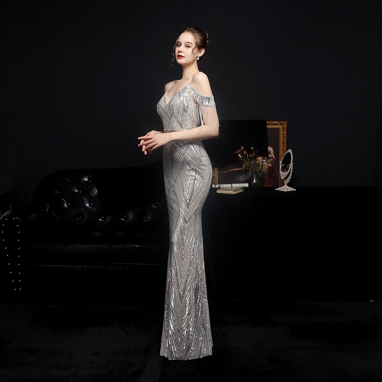 The sequined fishtail dress presents a streamlined formal silhouette. A V-neckline and sleeveless cut frame the embellishment along the bodice.