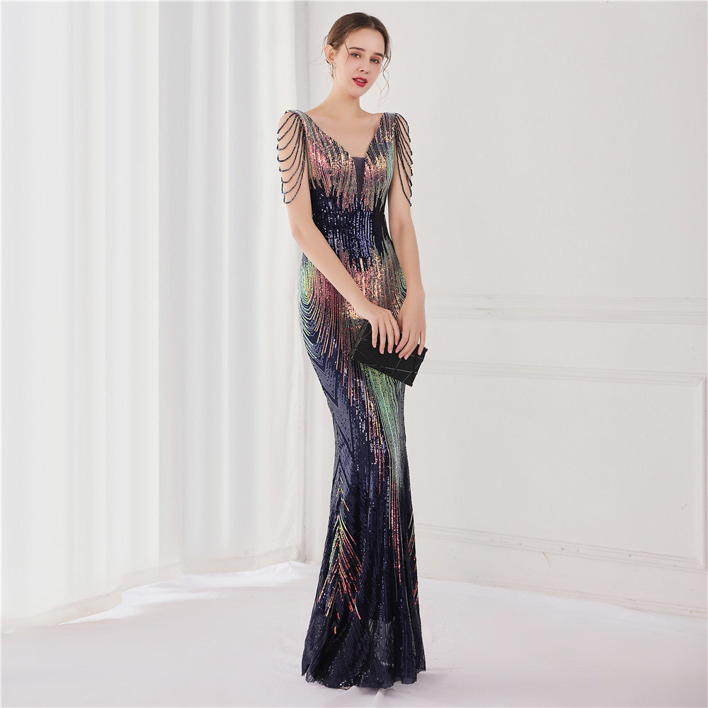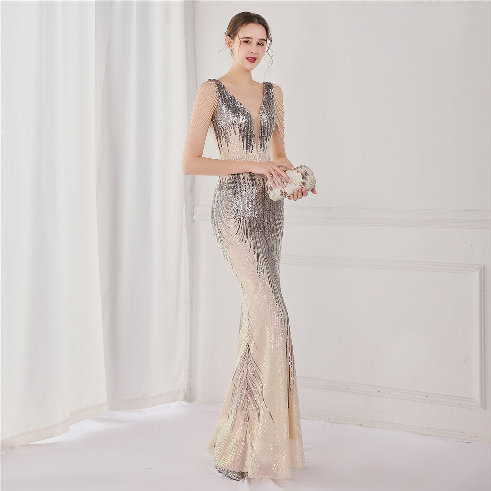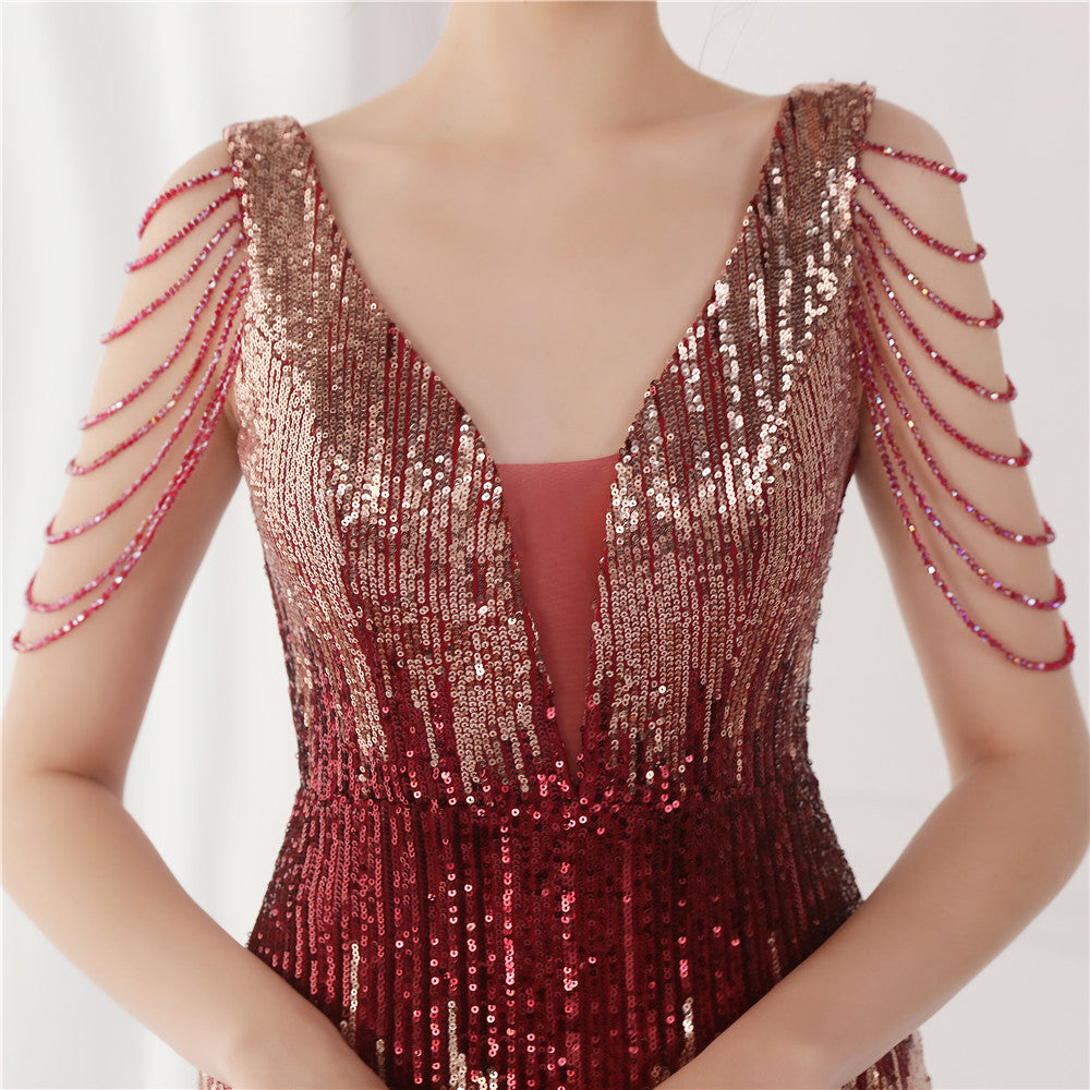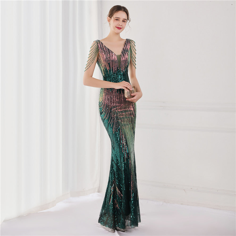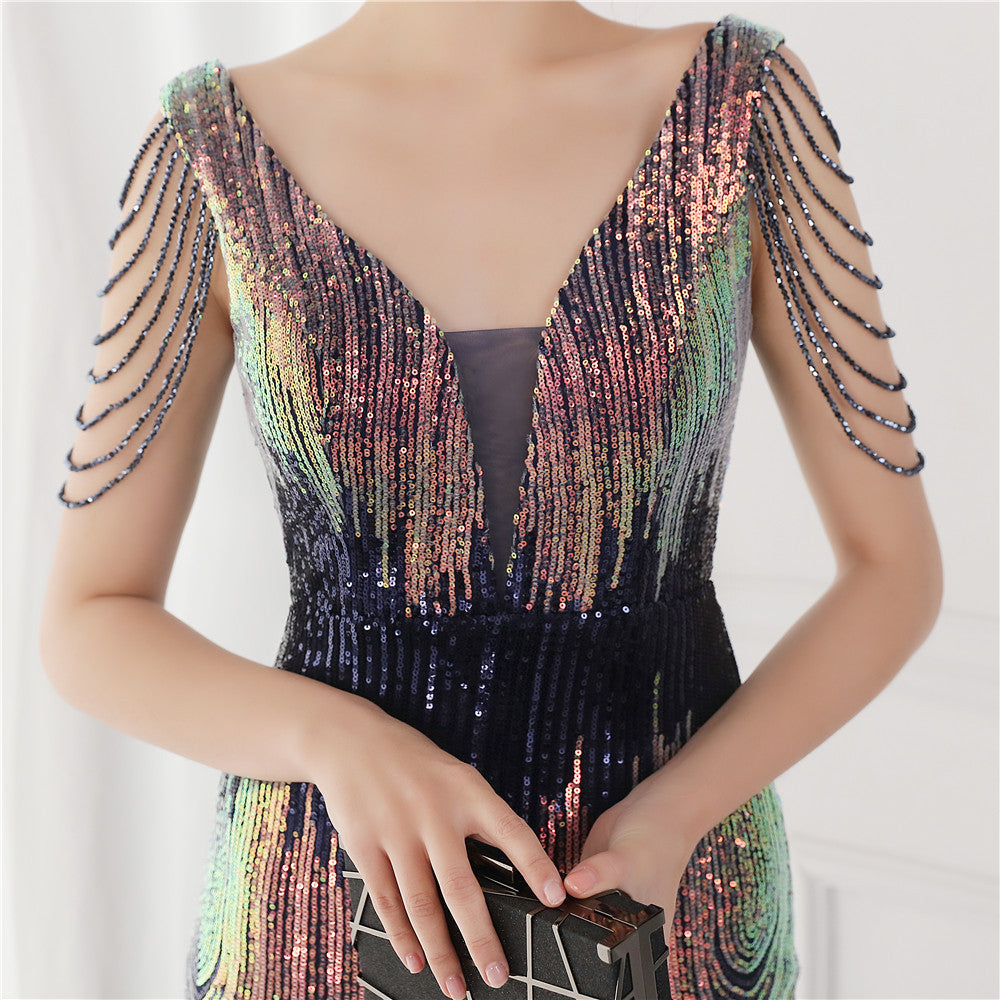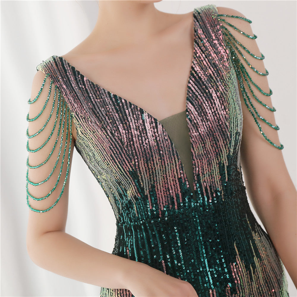An elongated, slim silhouette hugs the figure. A V-neckline with sequins and subtle lace/tulle accents along a fishtail hem define the look.