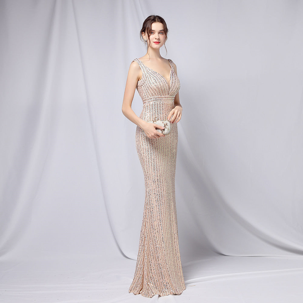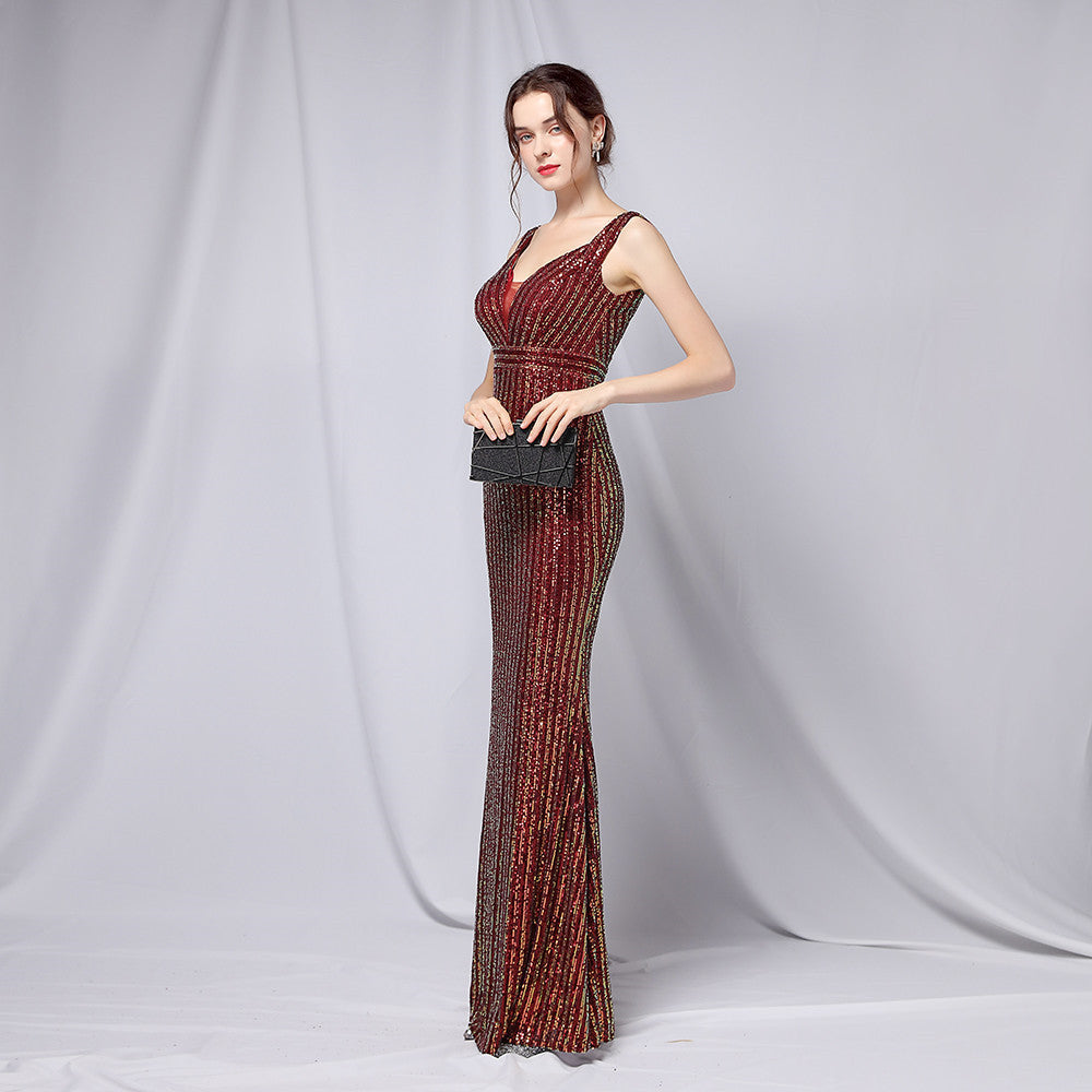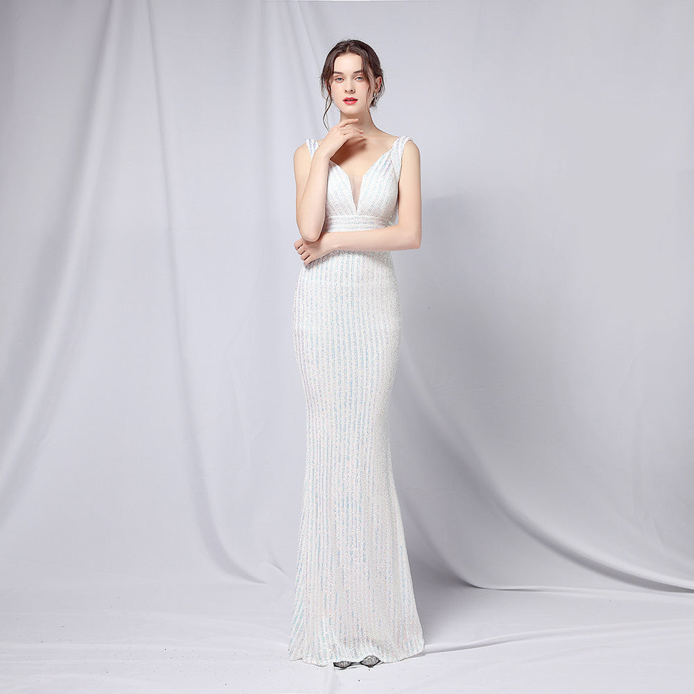 Refined fishtail maxi with a slim silhouette. The V-neckline and sequin embellishment add subtle sparkle.