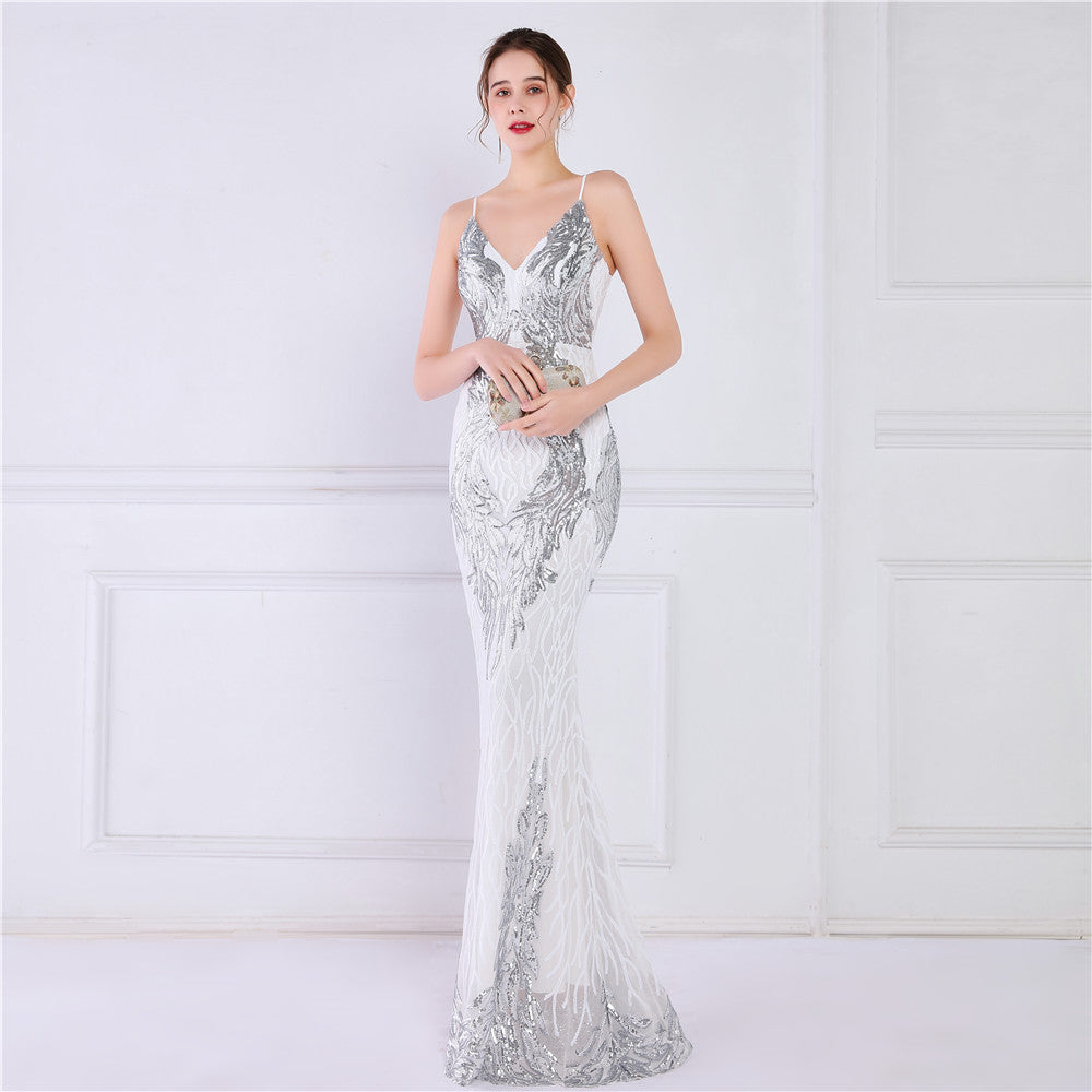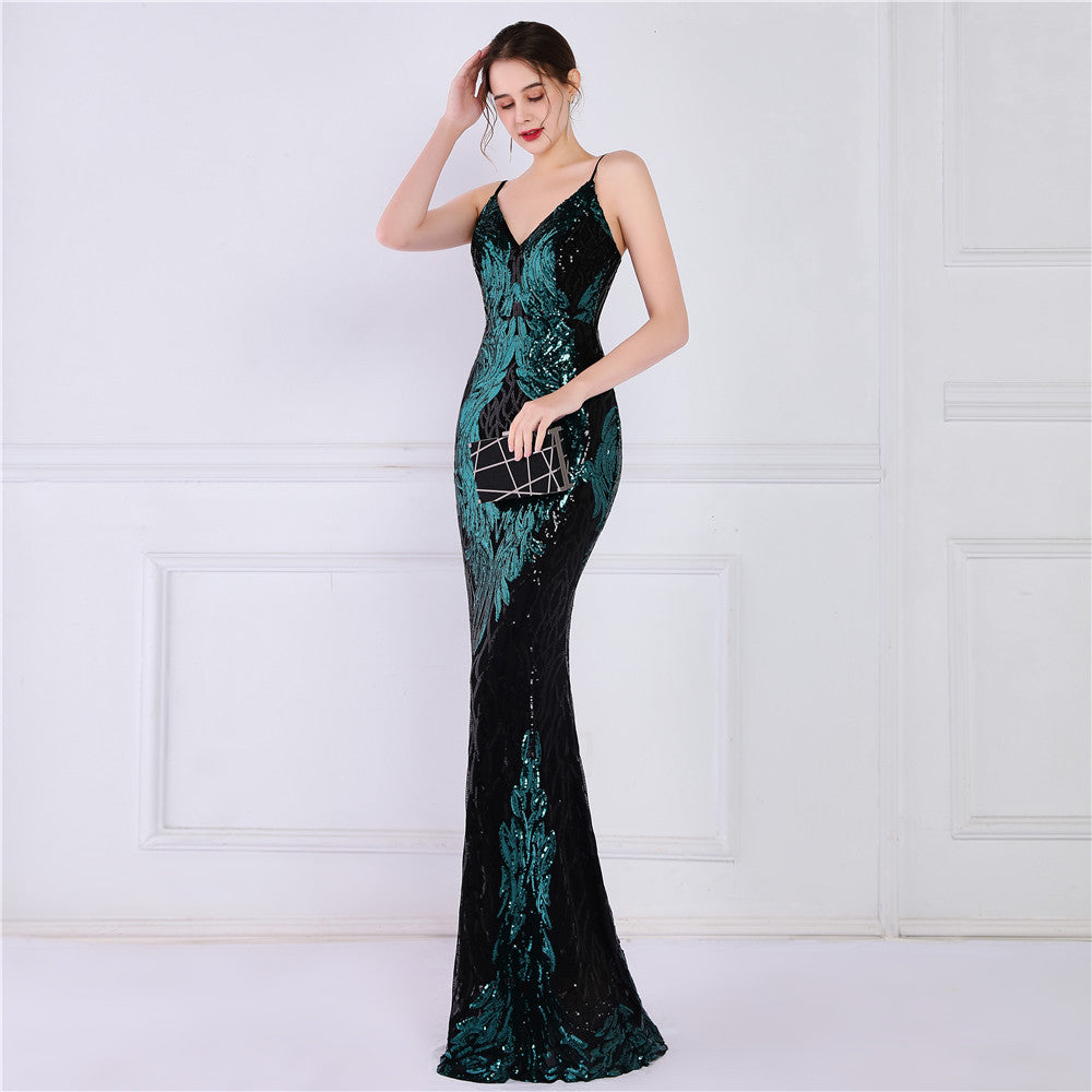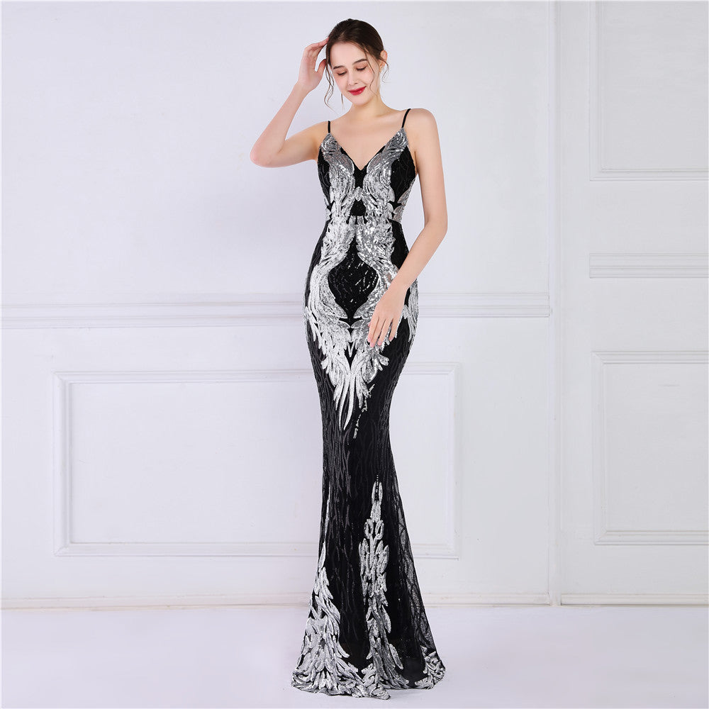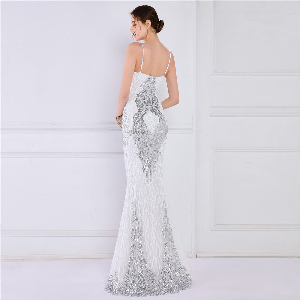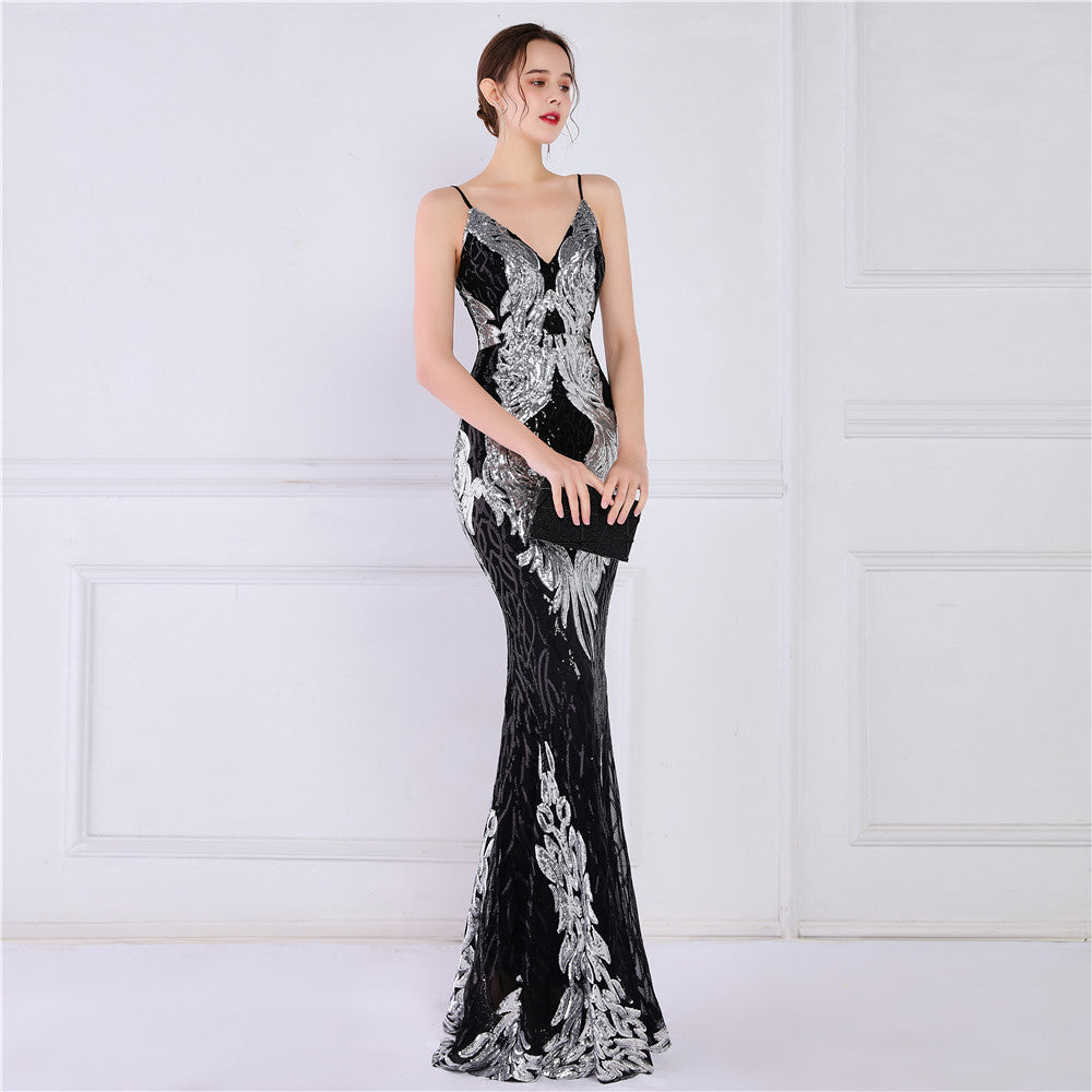 The sequined fishtail maxi offers a slim silhouette. It features a V-neck, sleeveless bodice and a discreet zipper for a clean line.