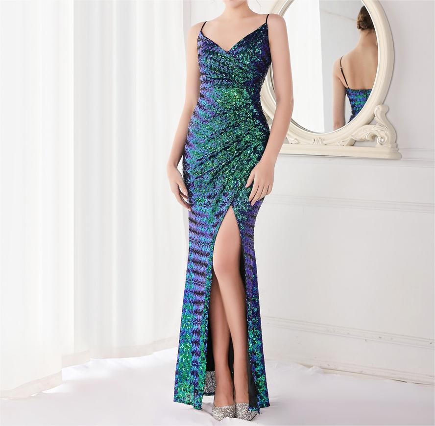 Elegant sequined maxi with a fishtail silhouette. It features a V-neck, ruched panels, a side split and a discreet back zipper.
