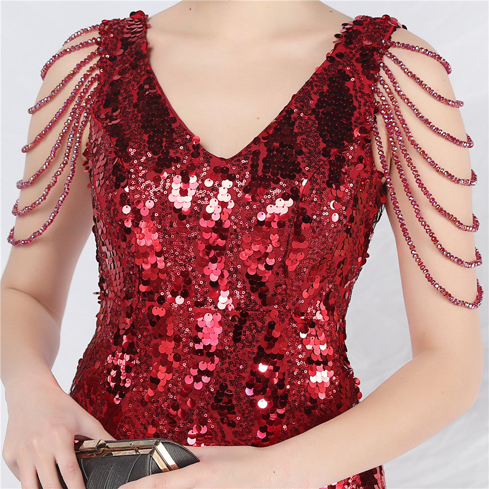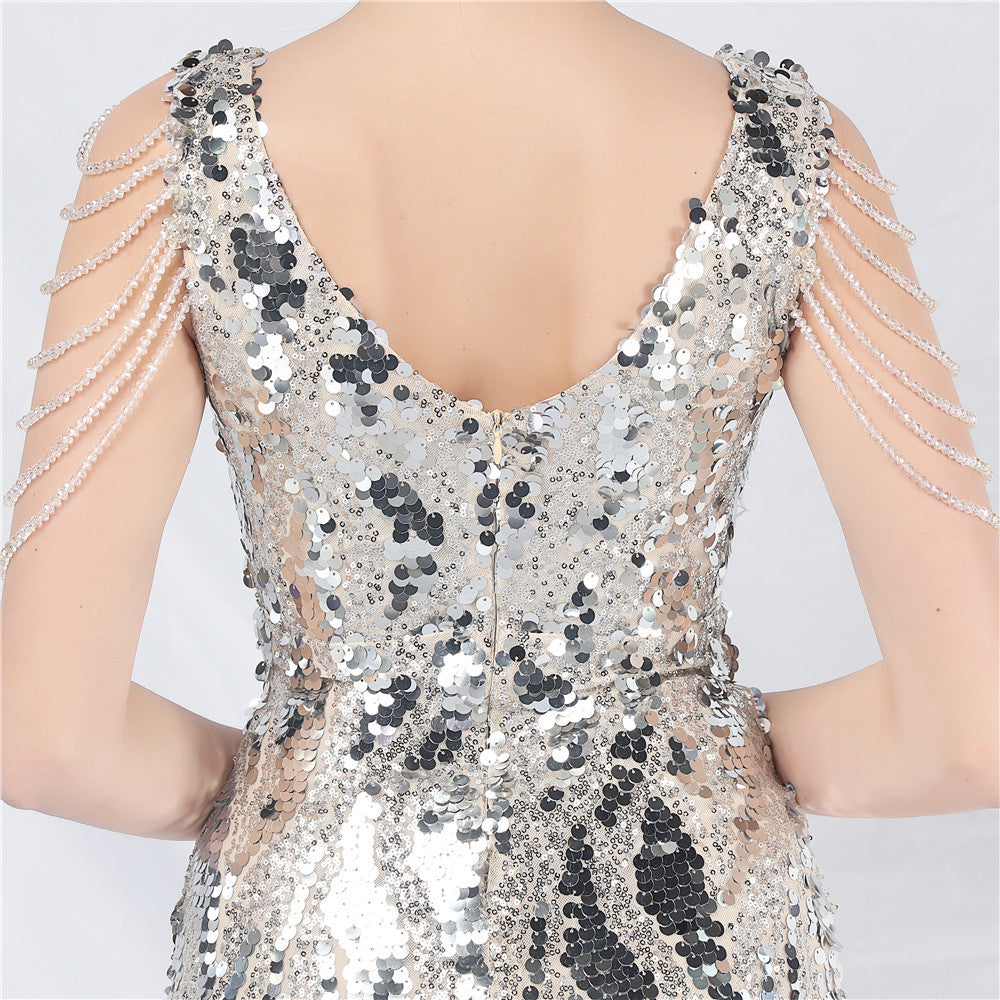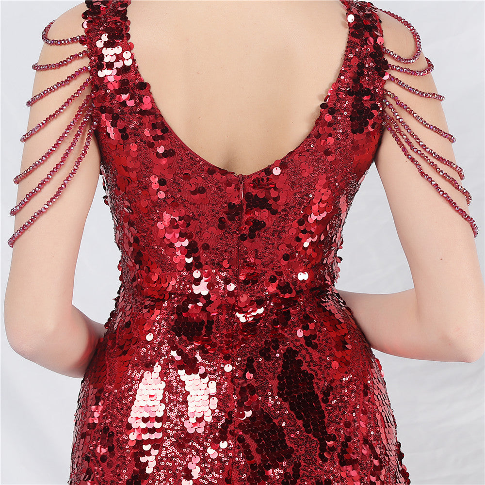 The dress is a sequined V-neck bodycon with a short, sleek silhouette. A discreet zipper finishes the design.