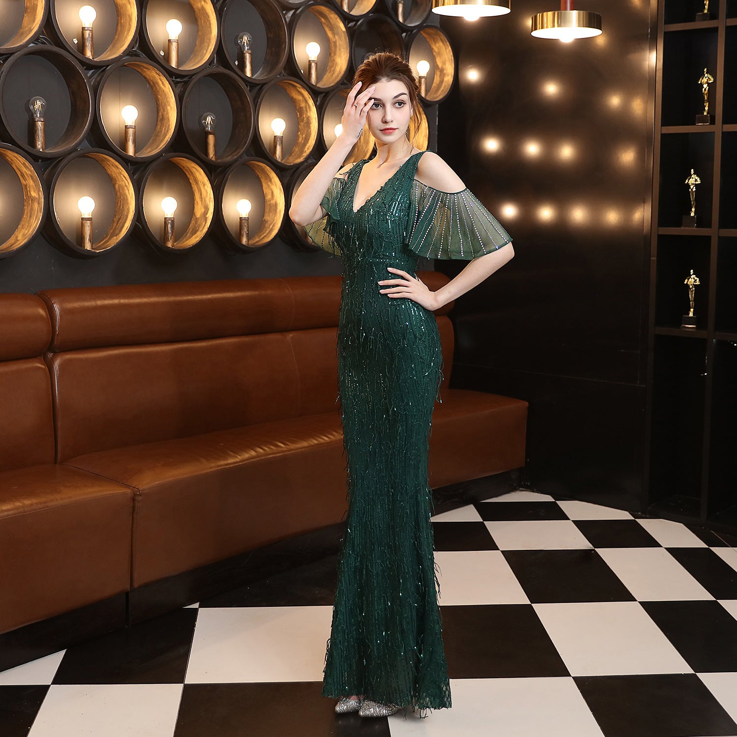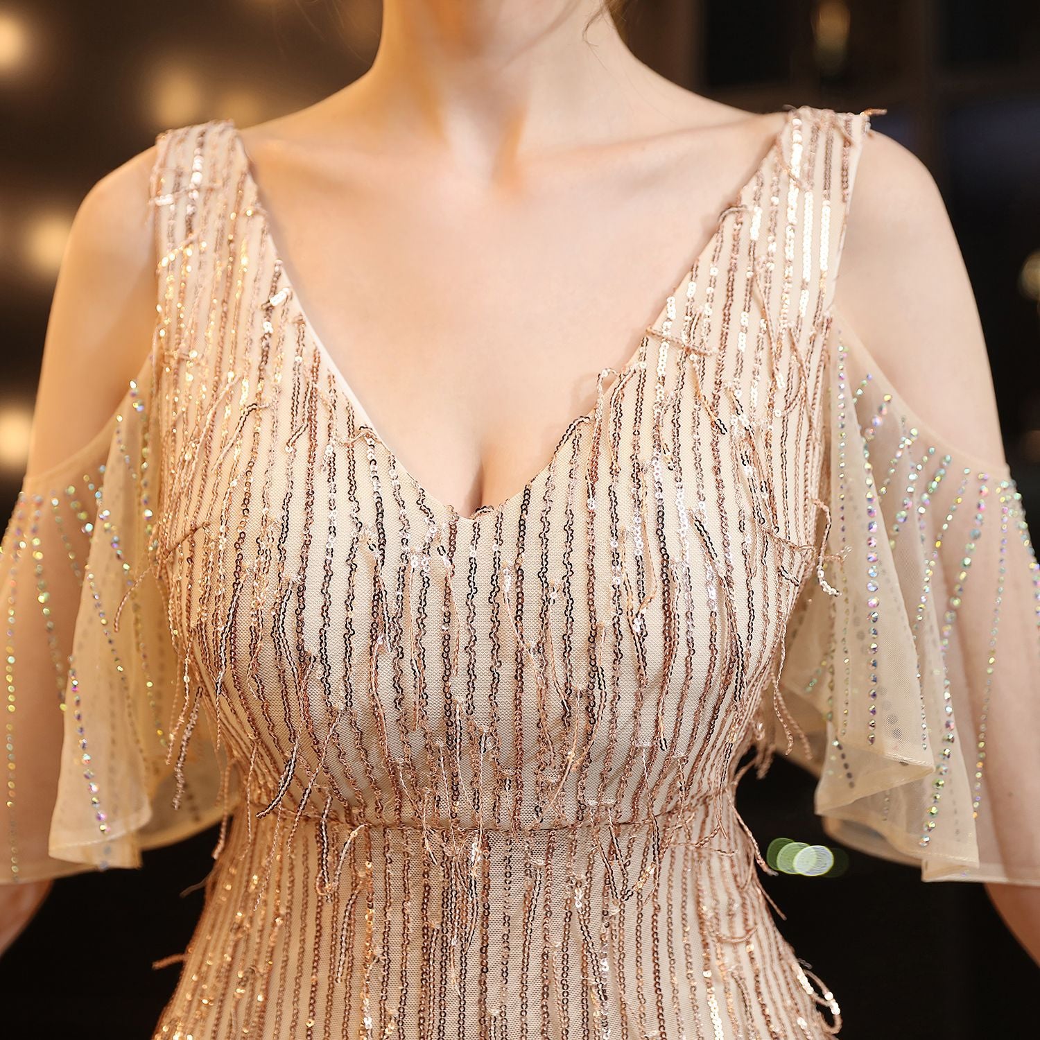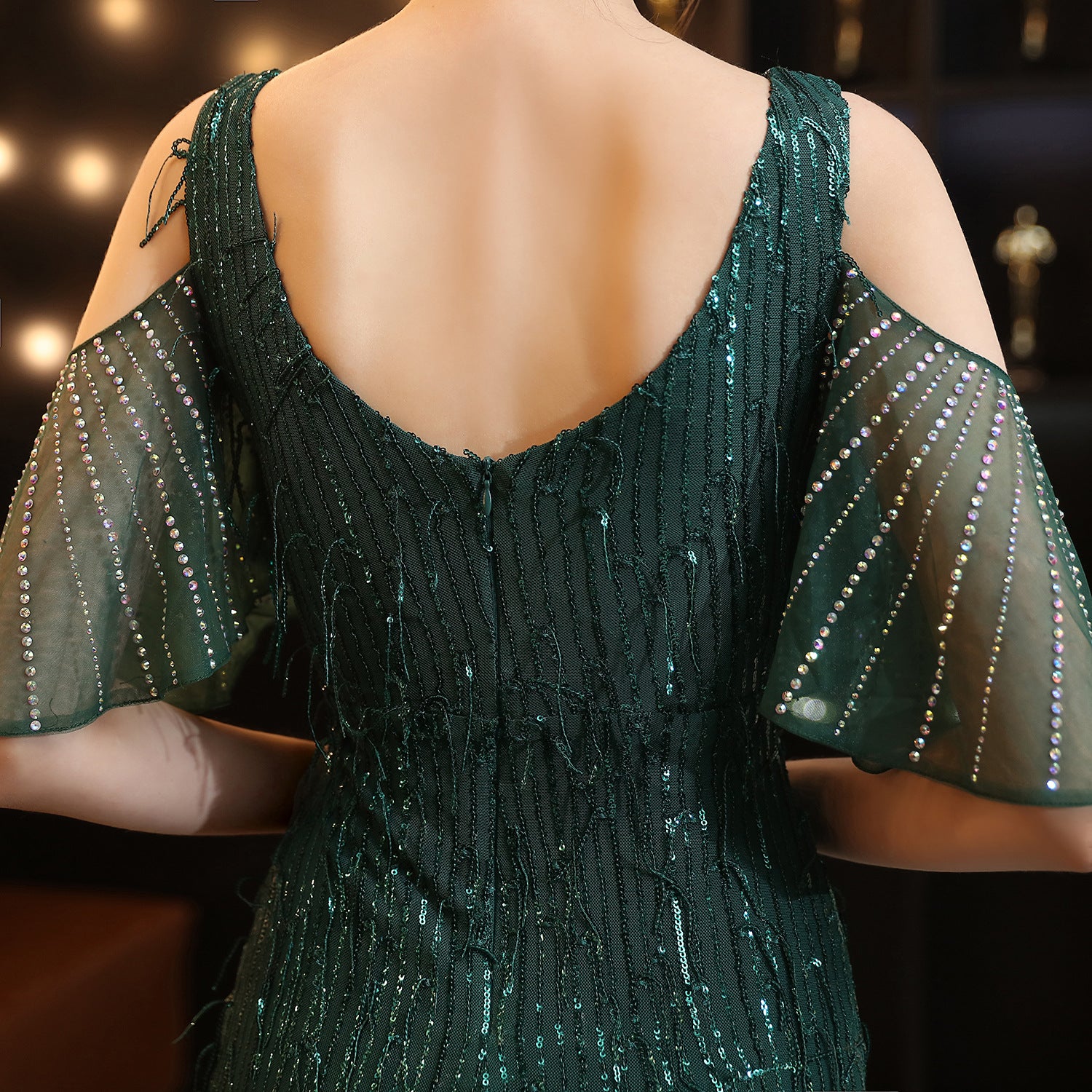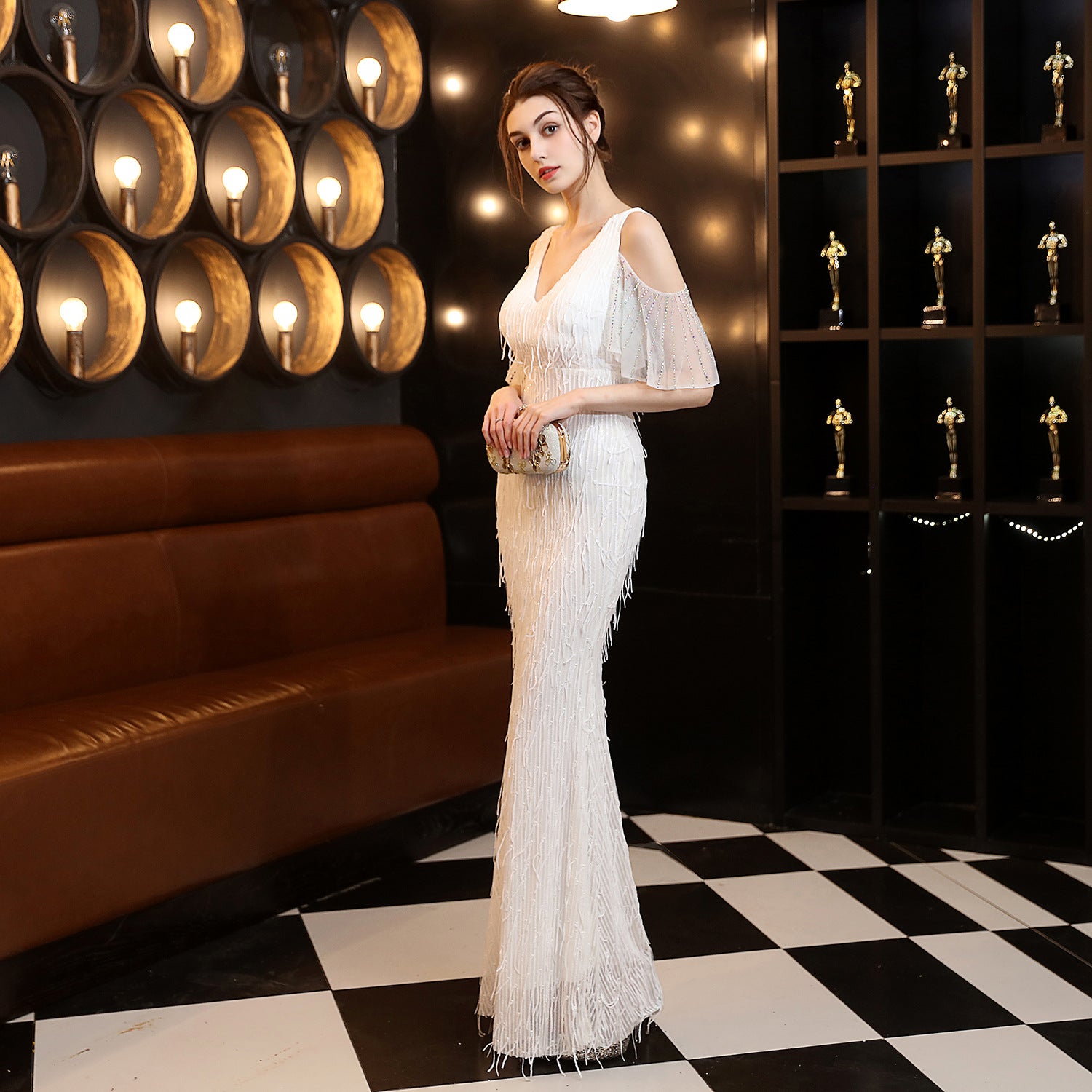 A sequined maxi with a refined fishtail silhouette. A V-neckline and butterfly sleeves frame the tassel fringe at the hem.