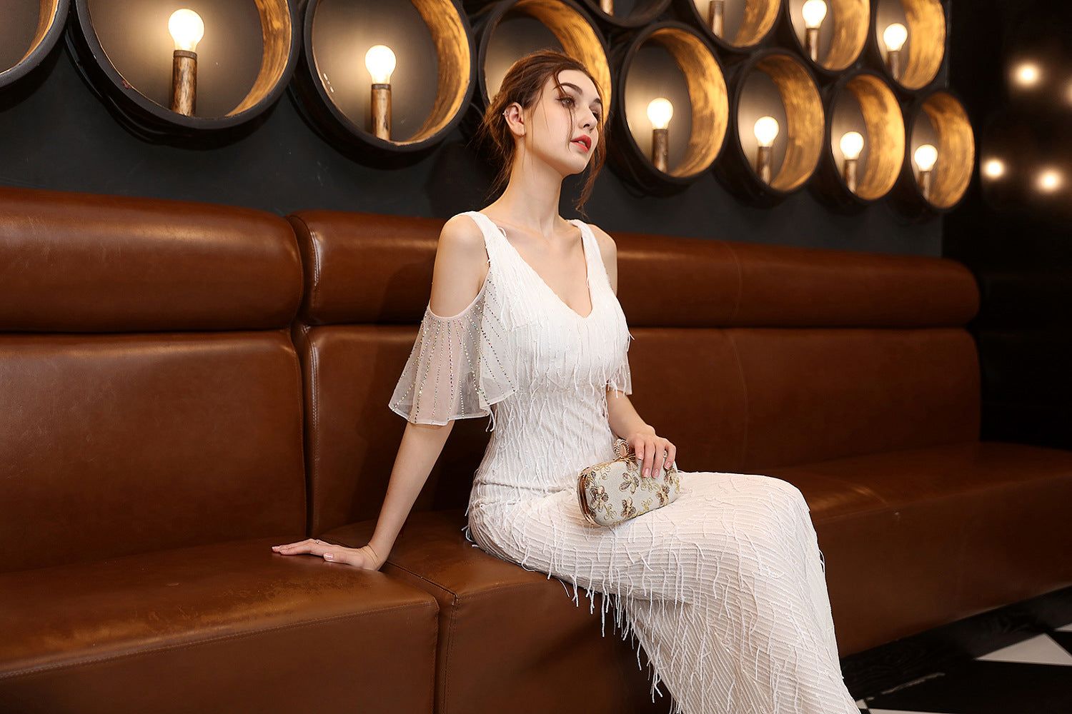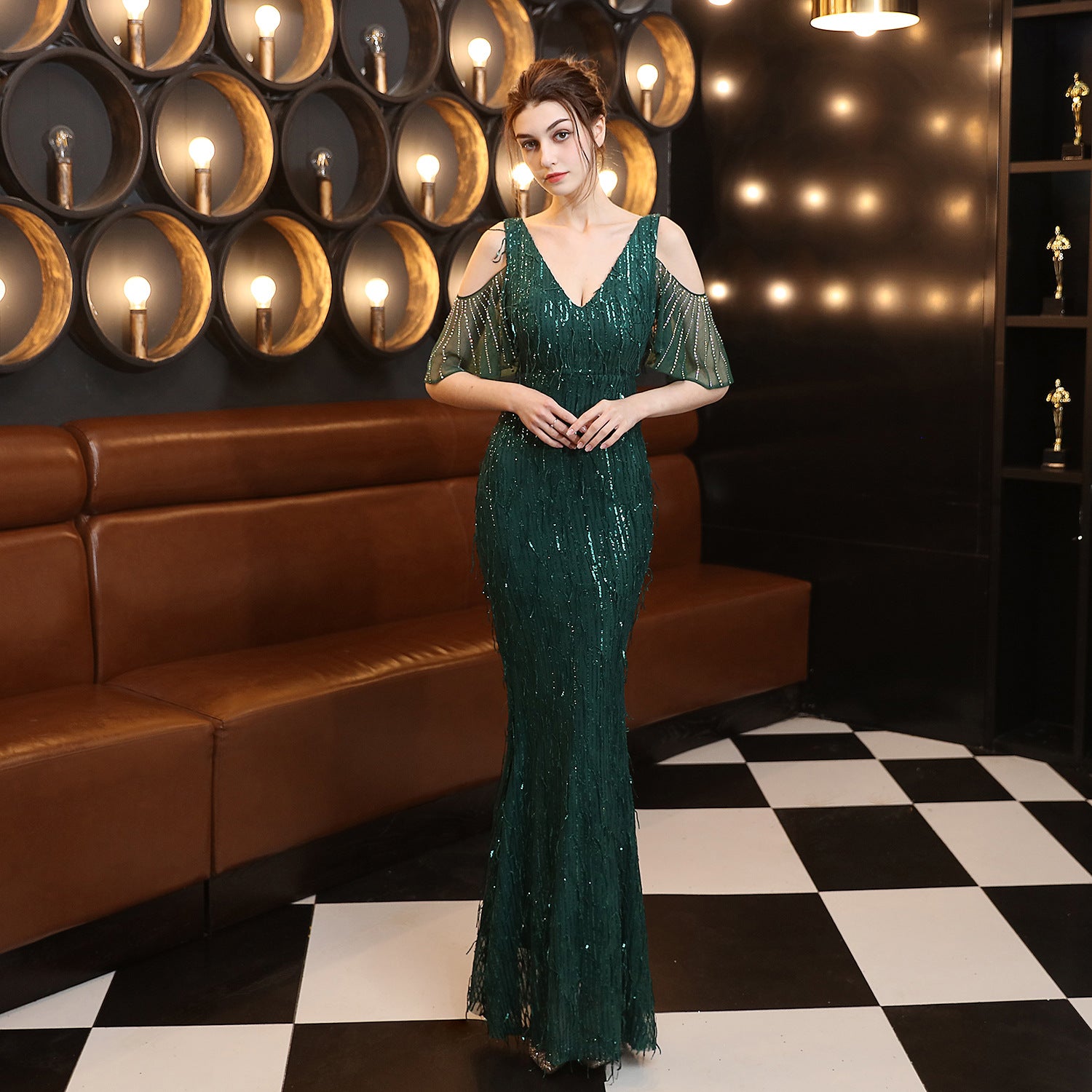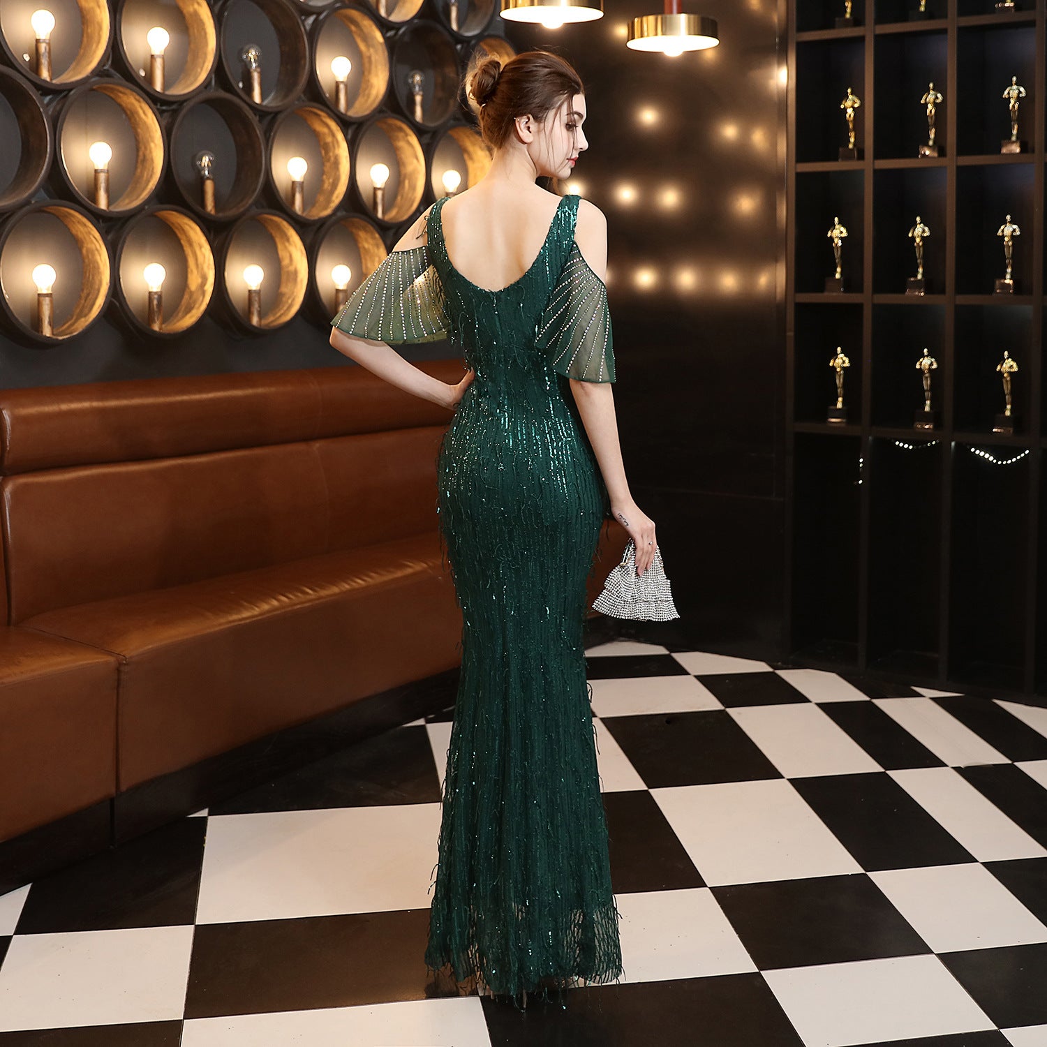 A sequined maxi with a refined fishtail silhouette. A V-neckline and butterfly sleeves frame the tassel fringe at the hem.