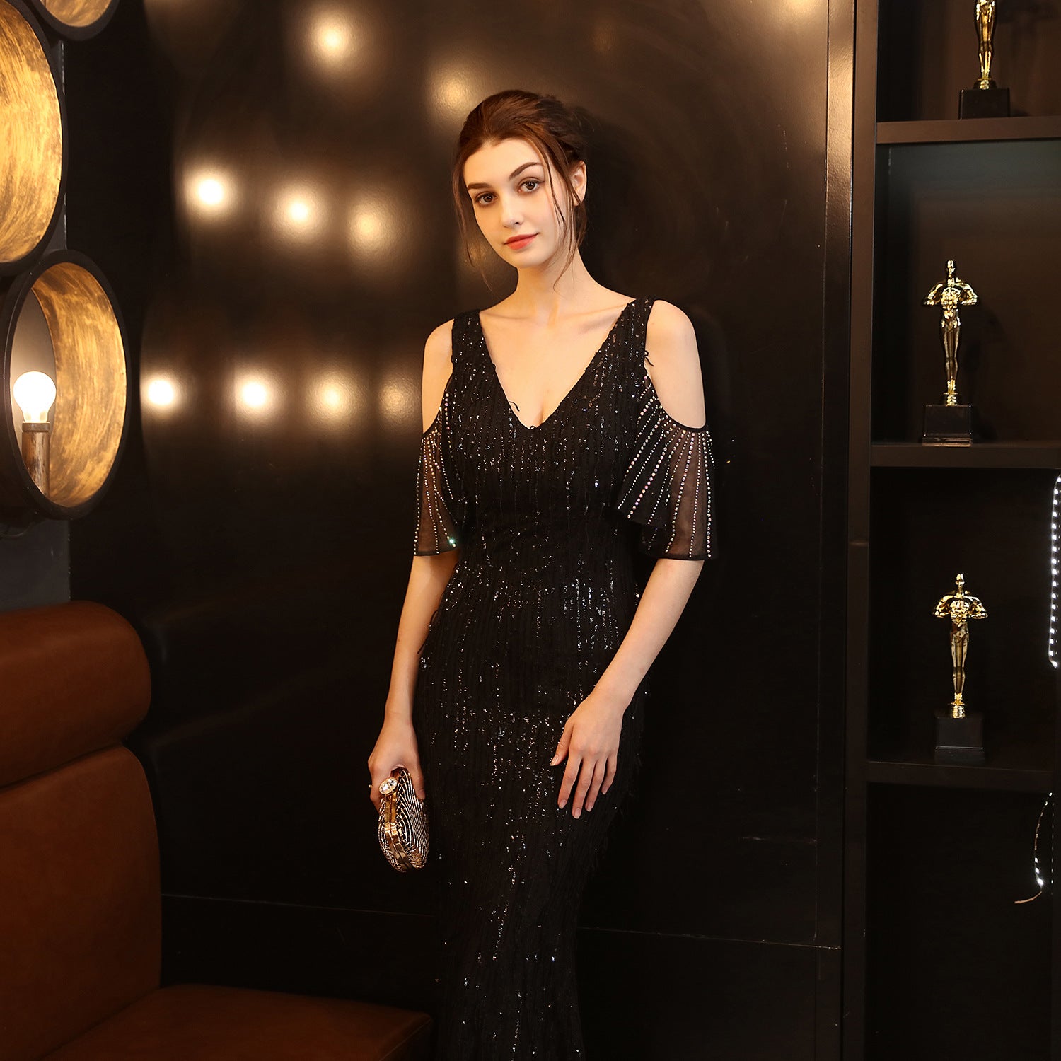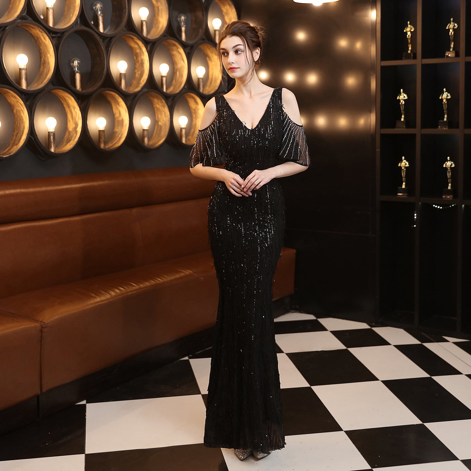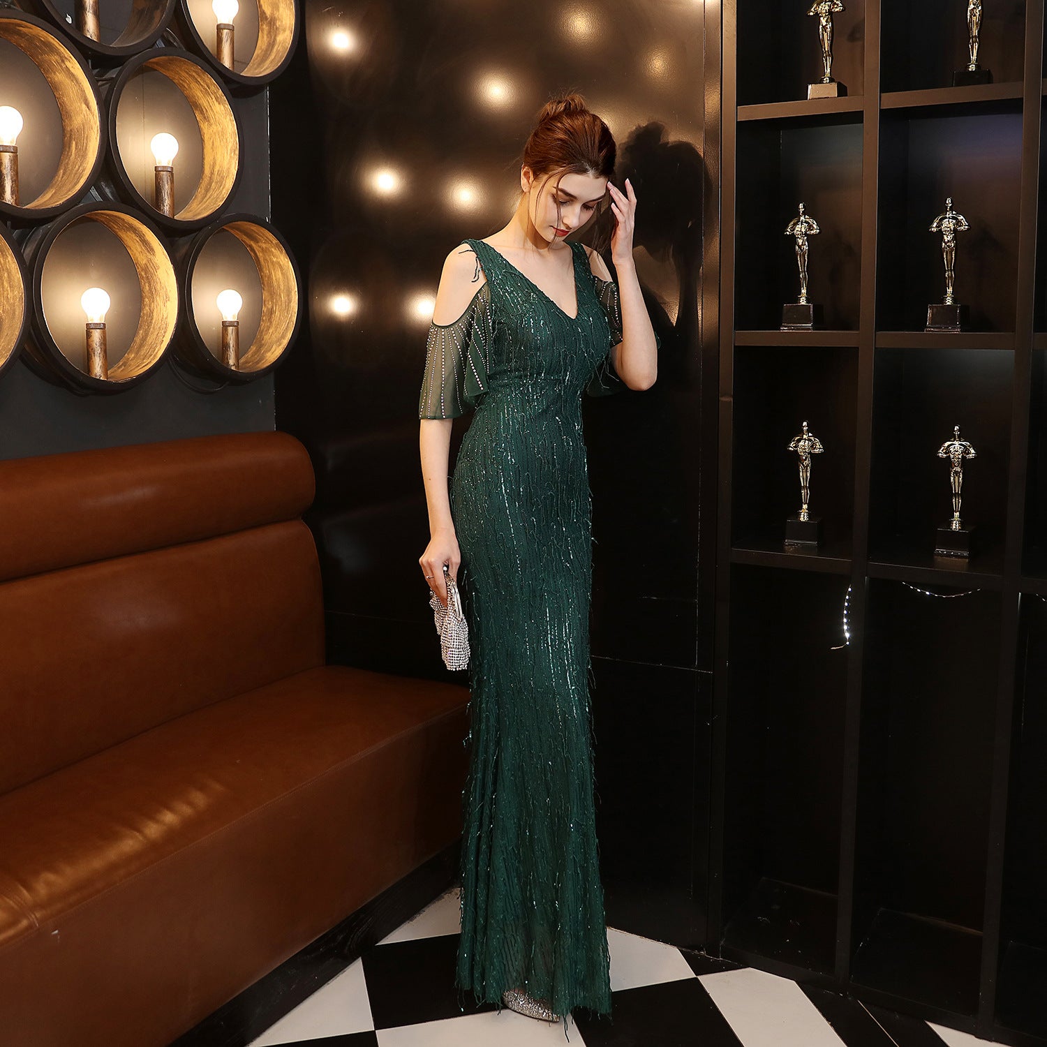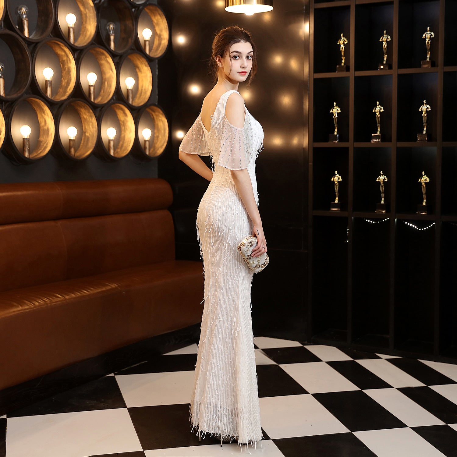 A sequined maxi with a refined fishtail silhouette. A V-neckline and butterfly sleeves frame the tassel fringe at the hem.