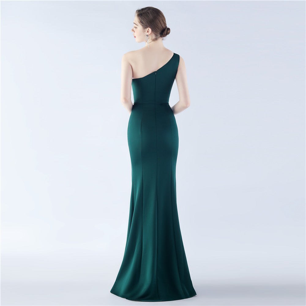 The dress presents a sleek maxi silhouette with a one-shoulder neckline. An asymmetric line and a front split finish the look.