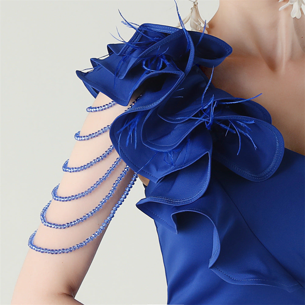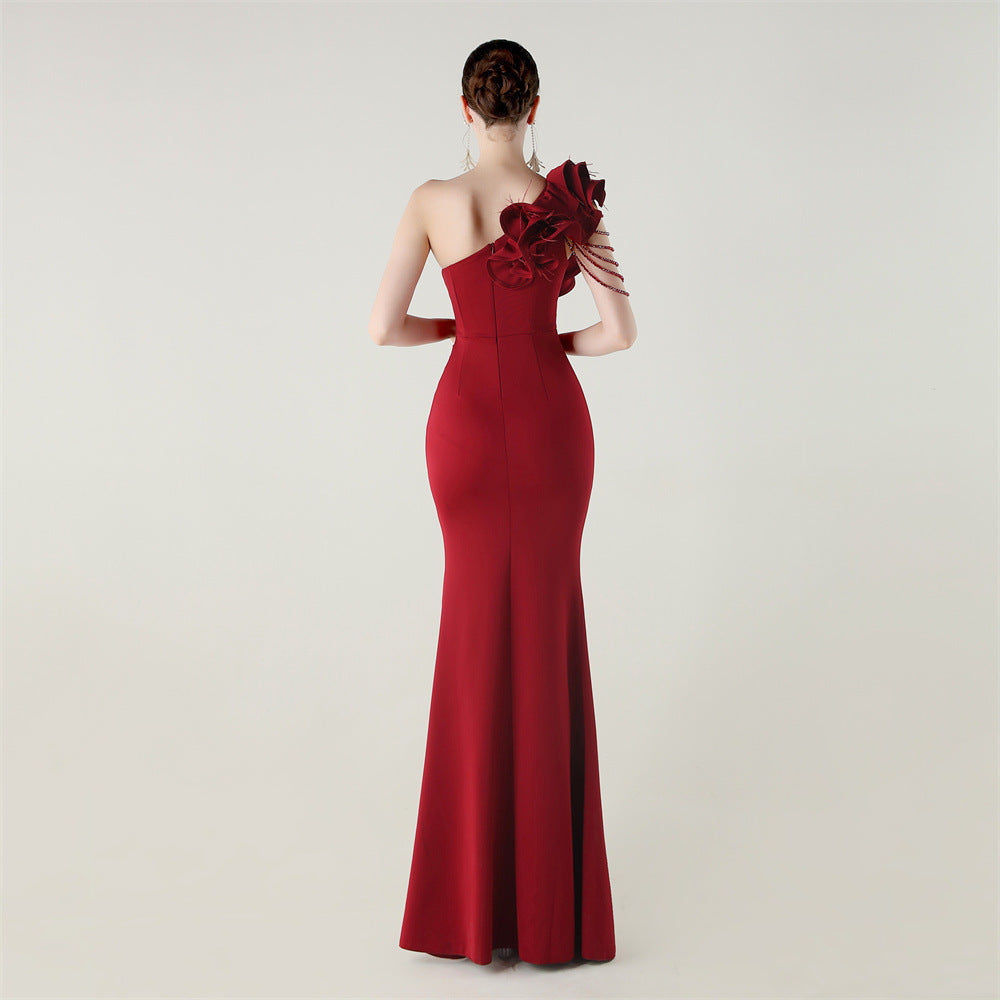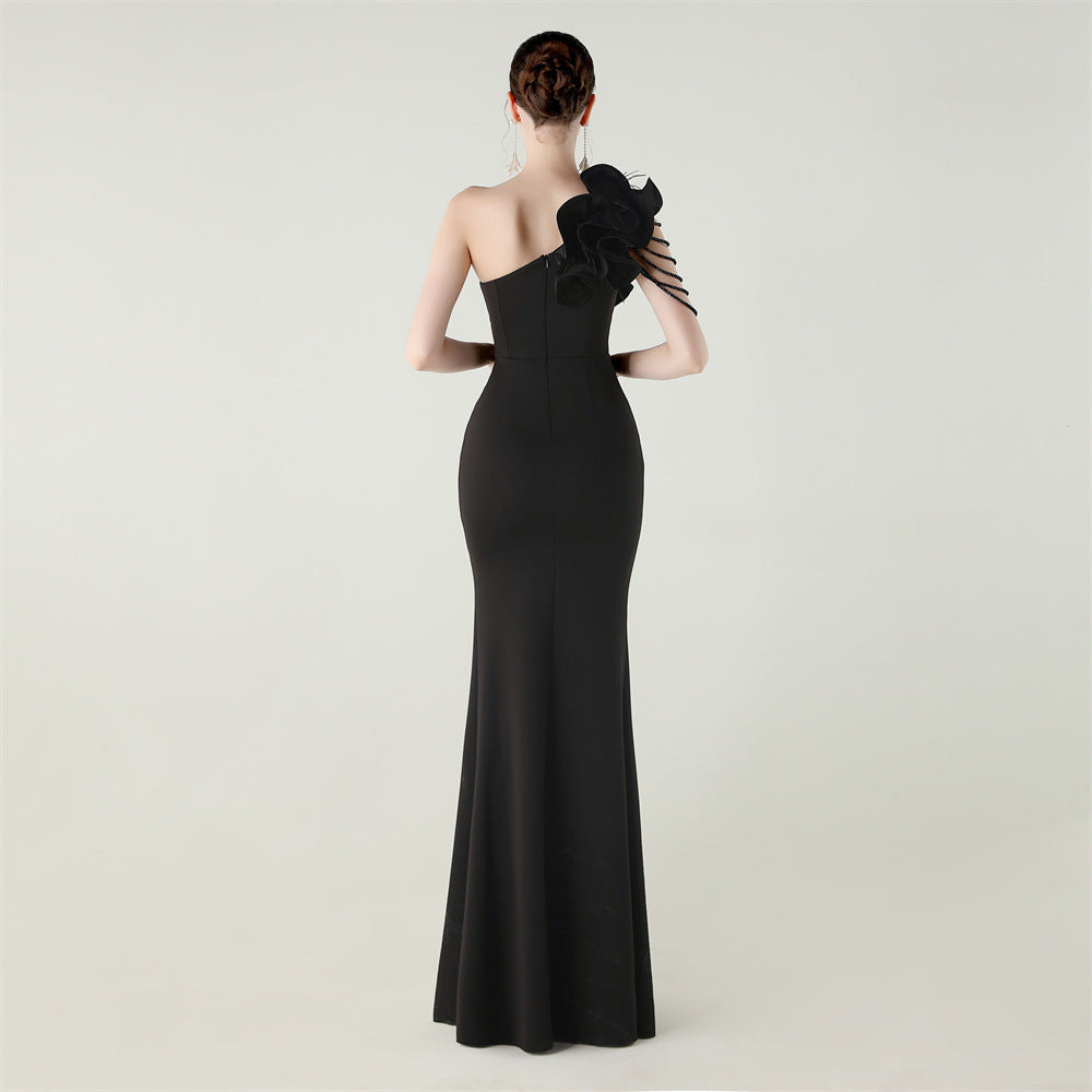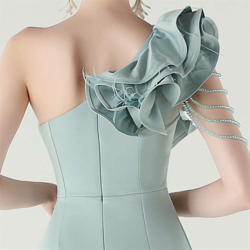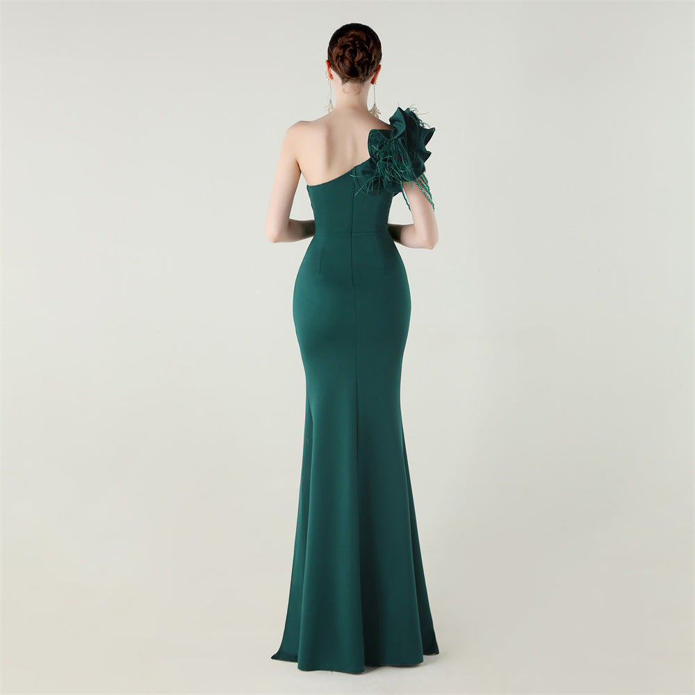 One-shoulder maxi dress with a clean, column silhouette. The neckline is asymmetric and features subtle 3D decoration with feather accents.