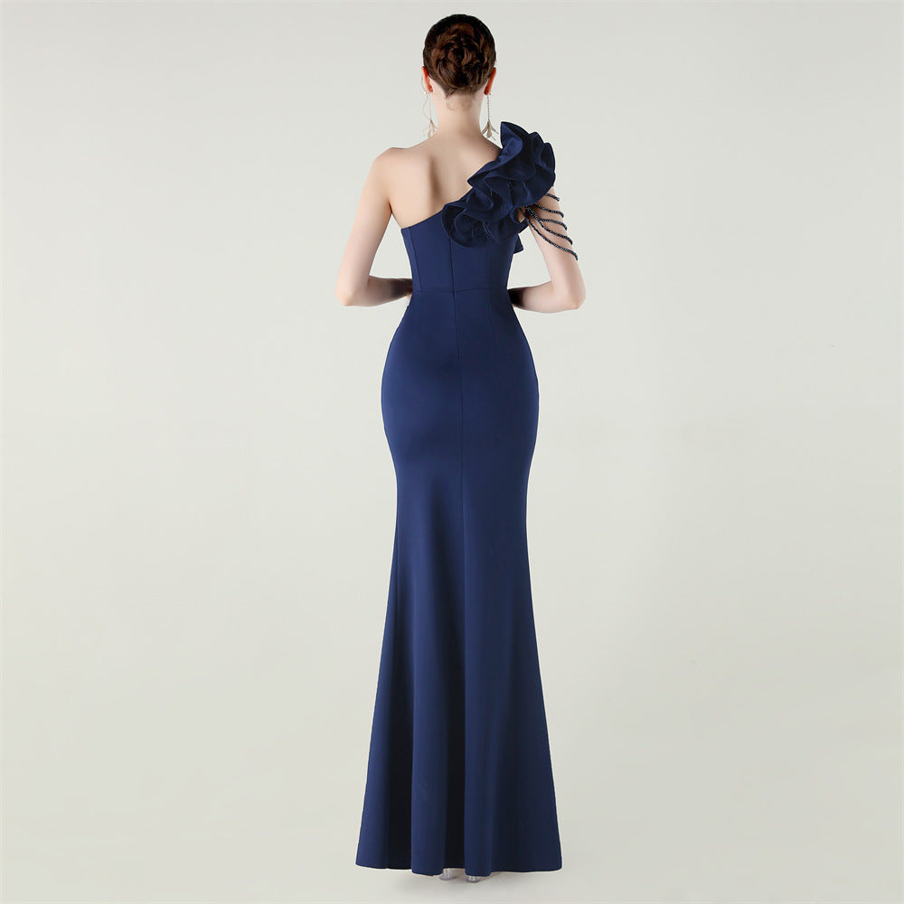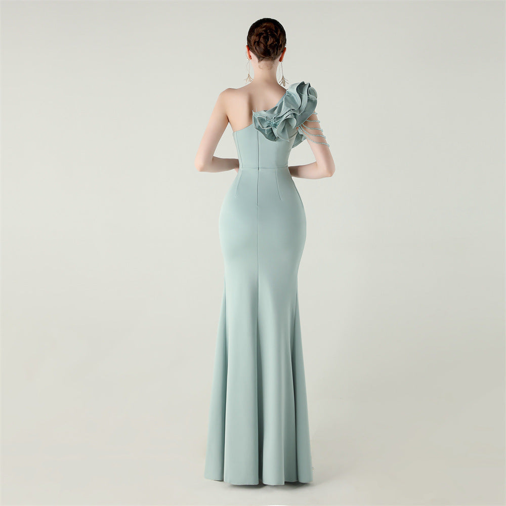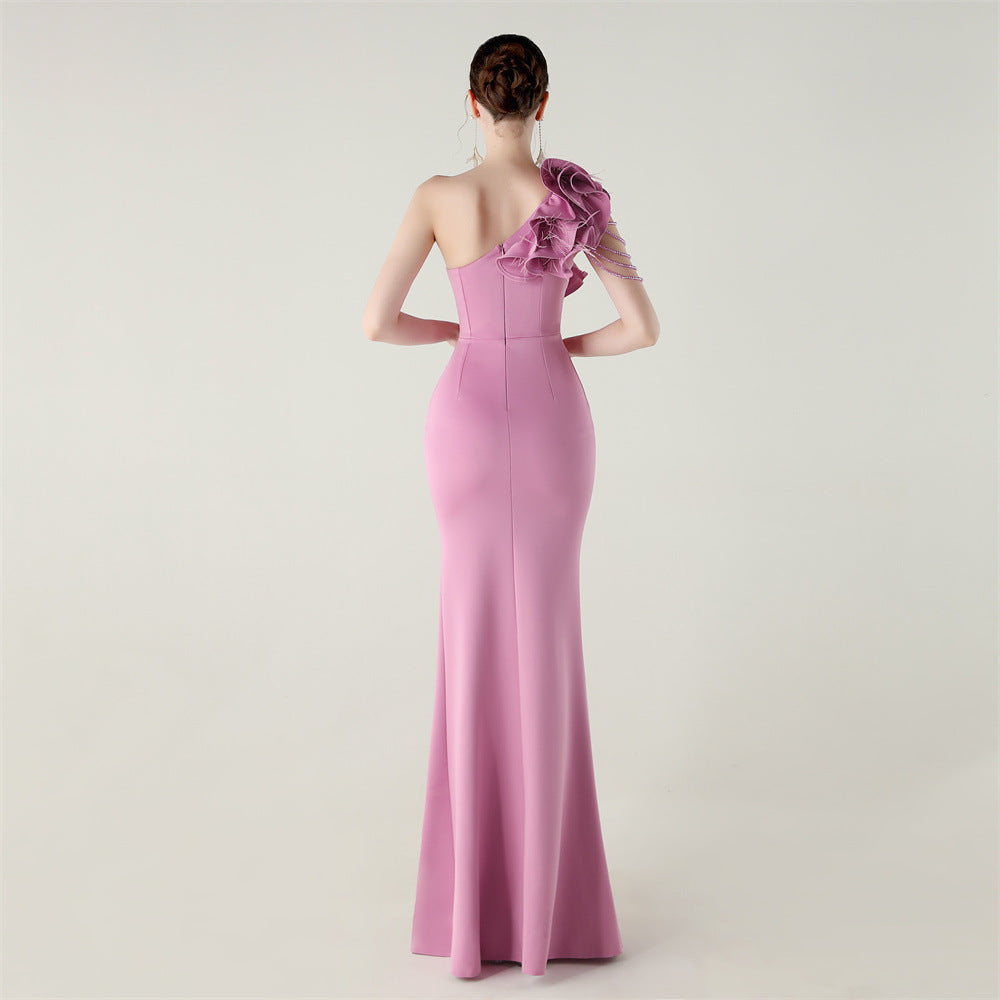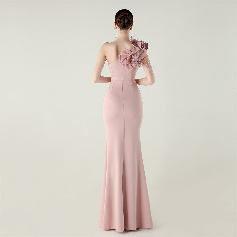 One-shoulder maxi dress with a clean, column silhouette. The neckline is asymmetric and features subtle 3D decoration with feather accents.