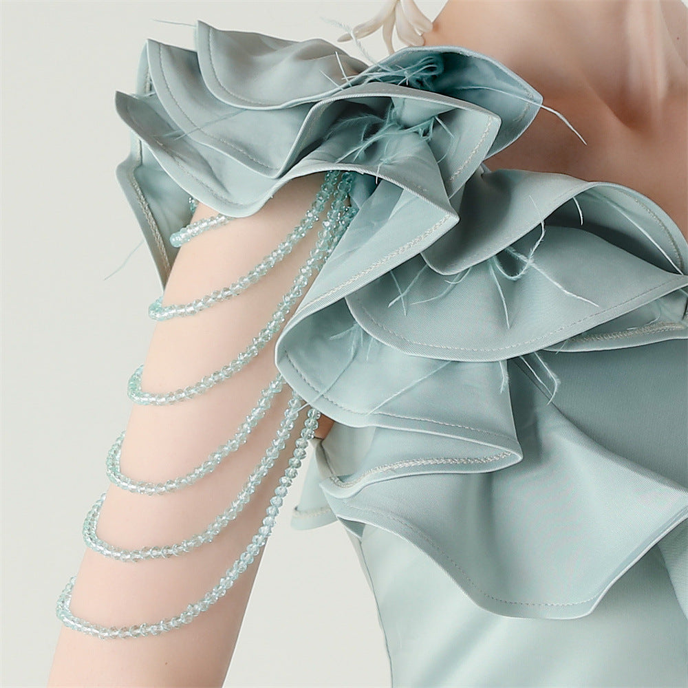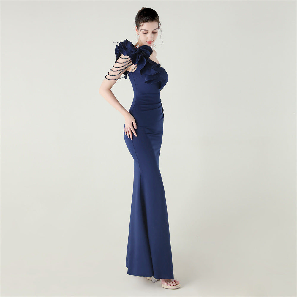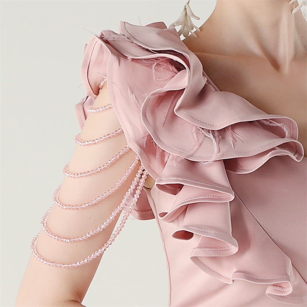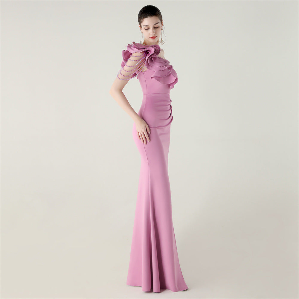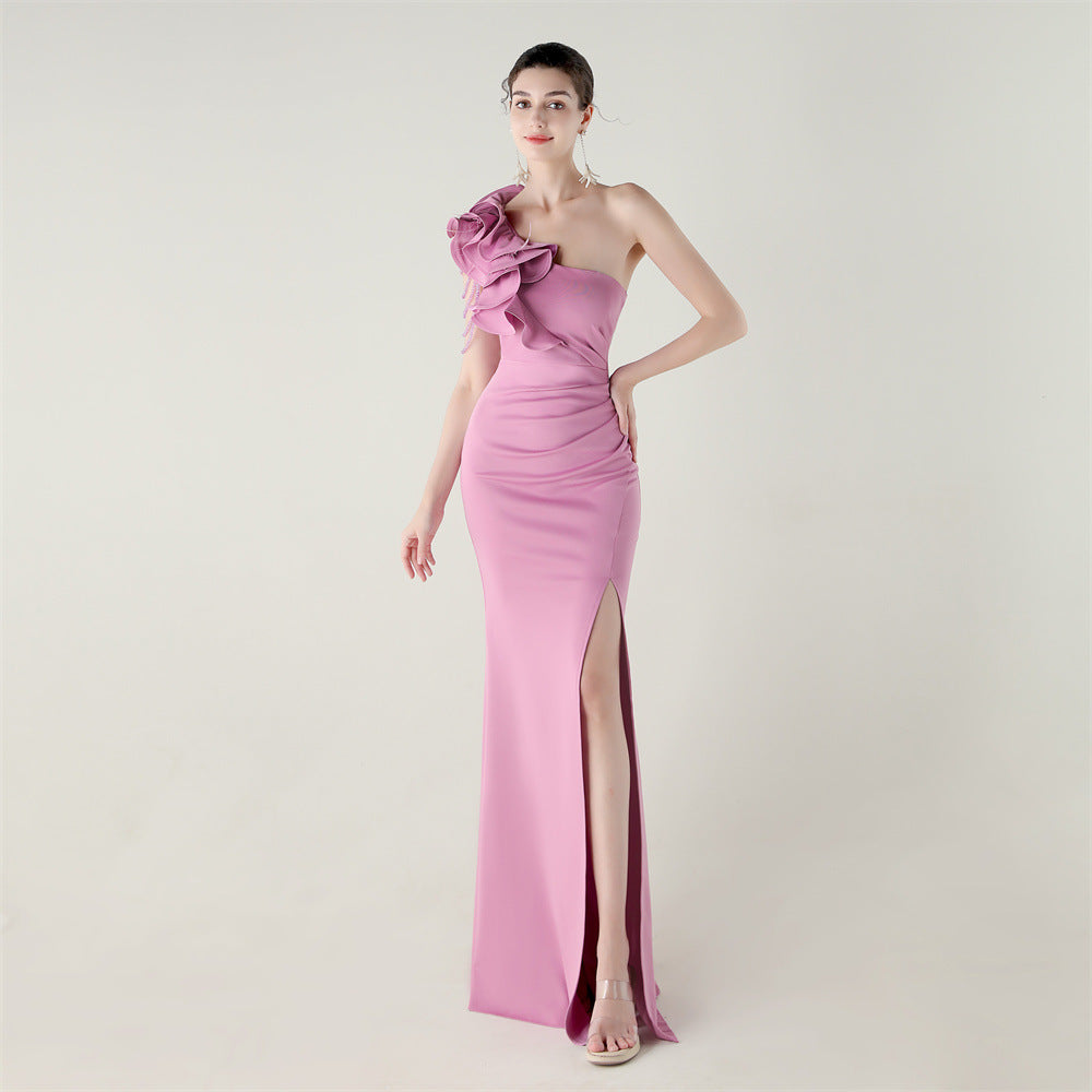 One-shoulder maxi dress with a clean, column silhouette. The neckline is asymmetric and features subtle 3D decoration with feather accents.