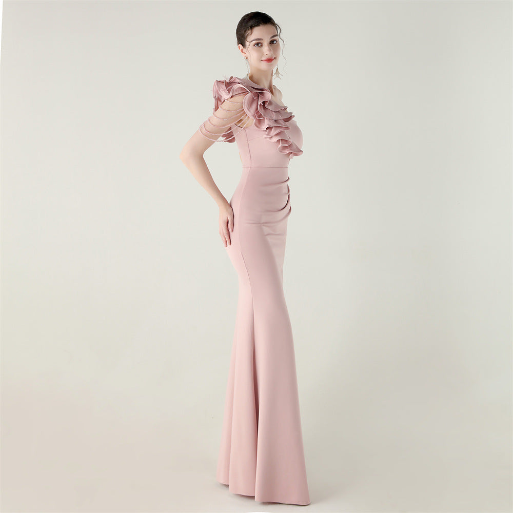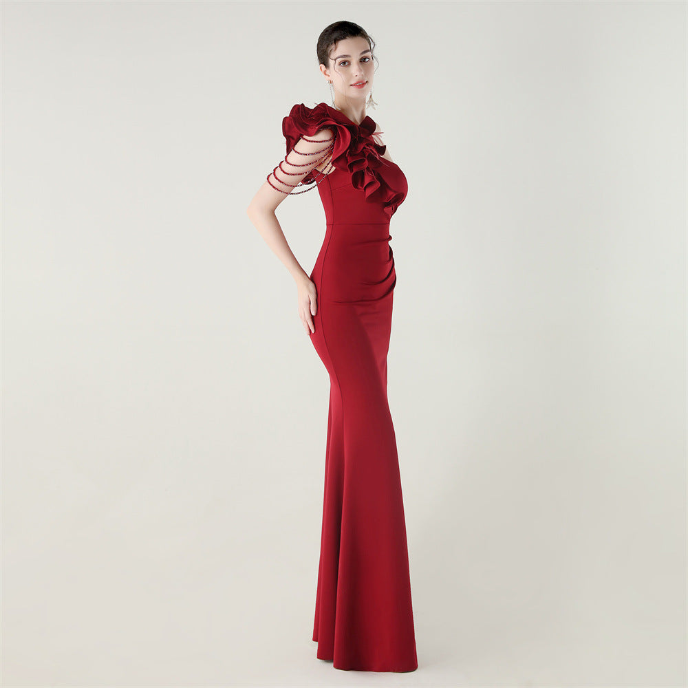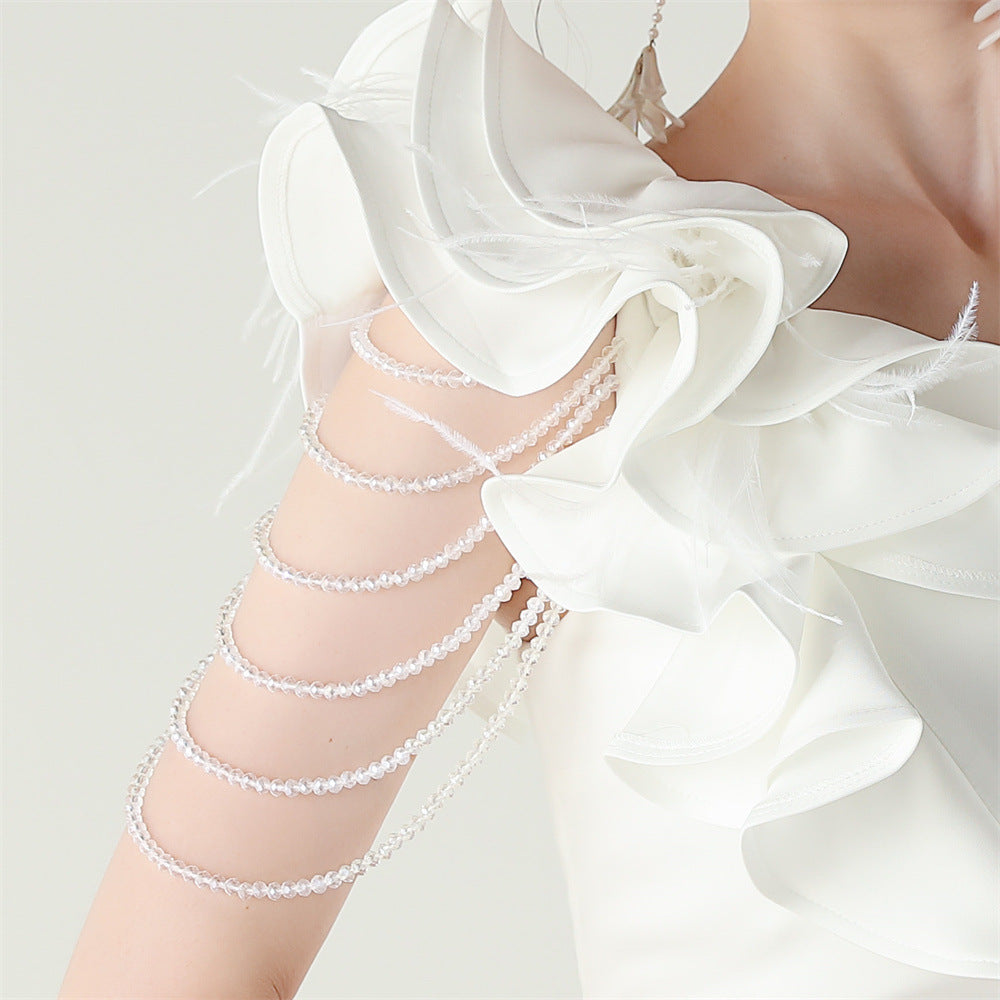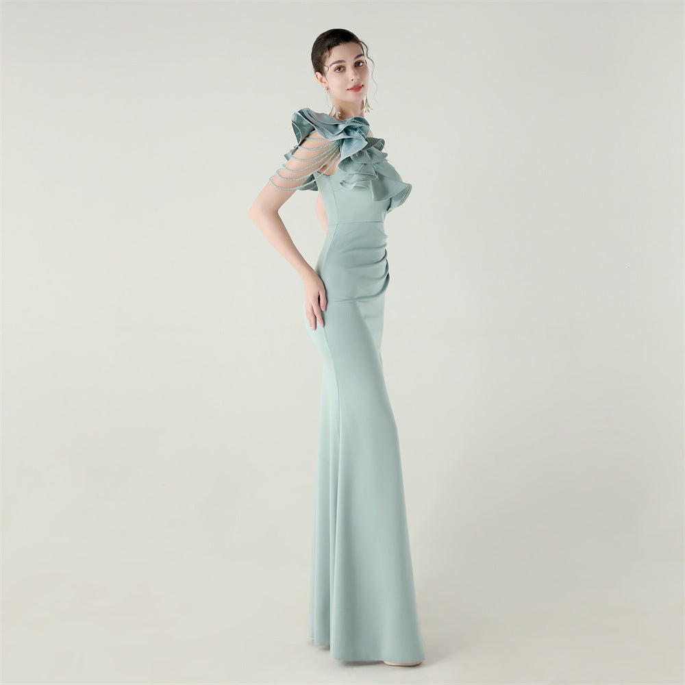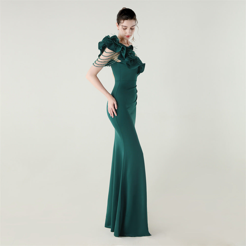 One-shoulder maxi dress with a clean, column silhouette. The neckline is asymmetric and features subtle 3D decoration with feather accents.