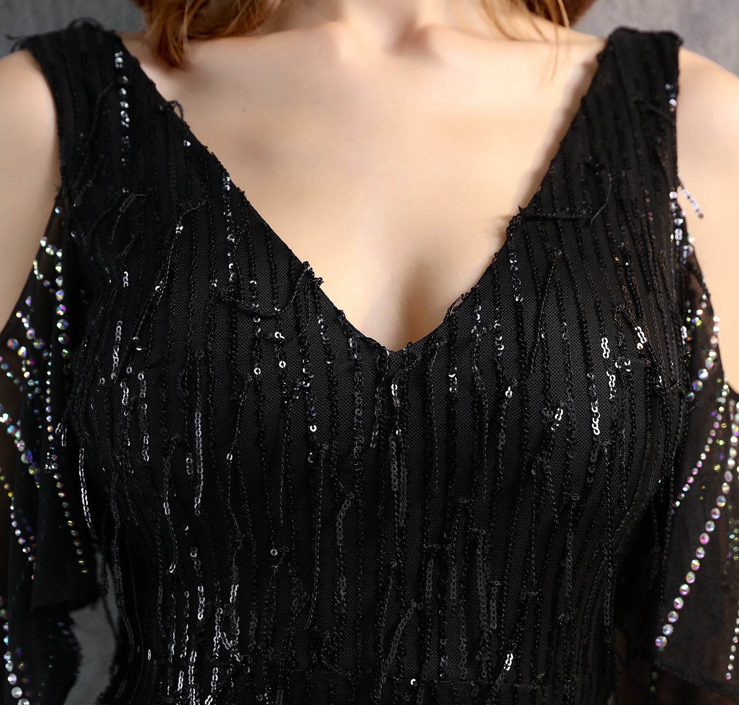 The dress follows a slim, knee-length silhouette. The V-neckline is accented with sequins and fringe, while rhinestones add subtle shimmer.