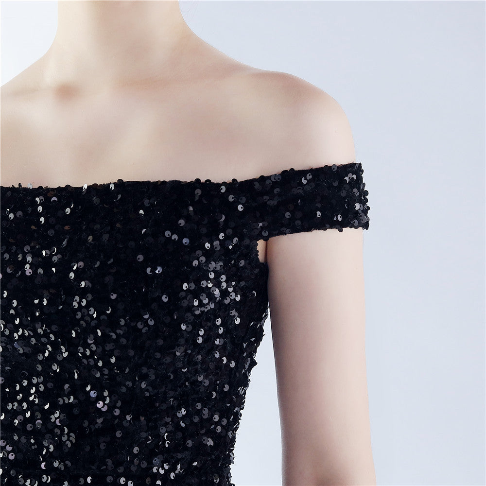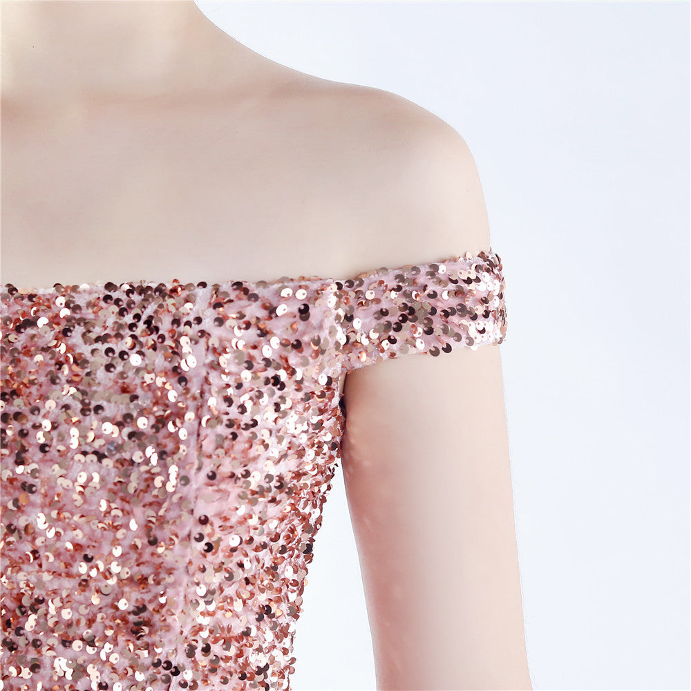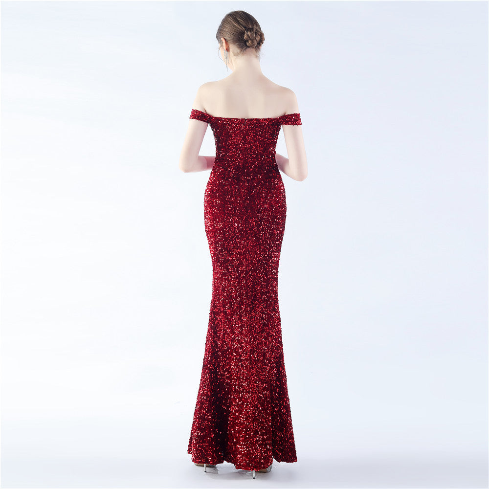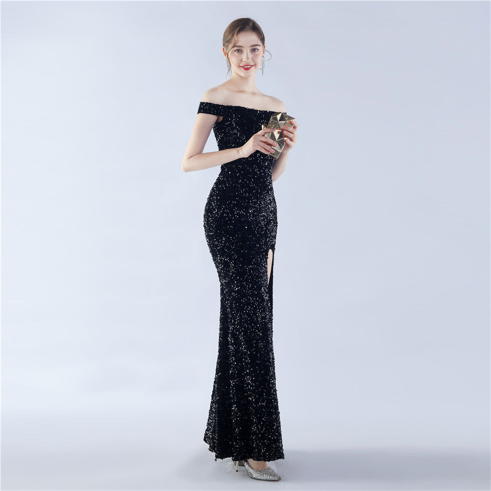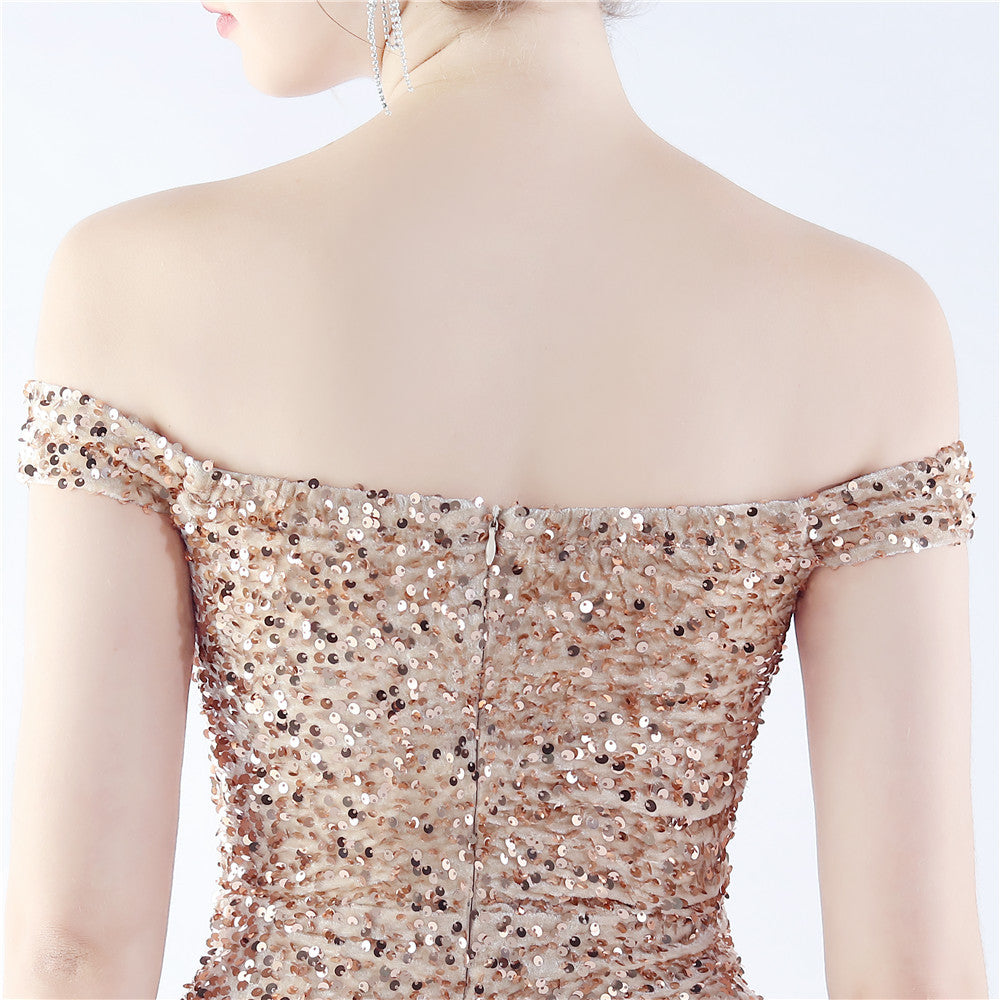 A sleek off shoulder maxi with a slim silhouette. Sequins shimmer along the bodice, with a hidden zipper and a side split.