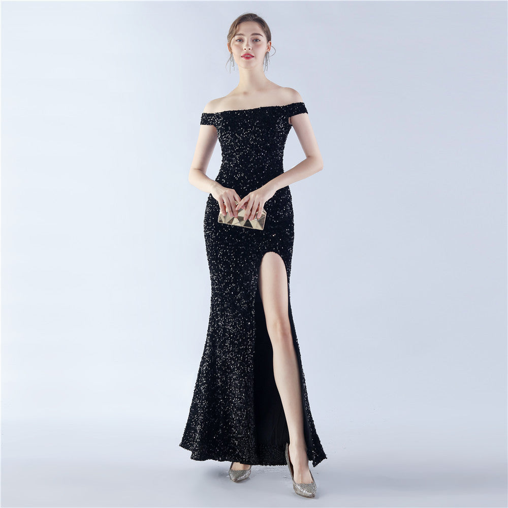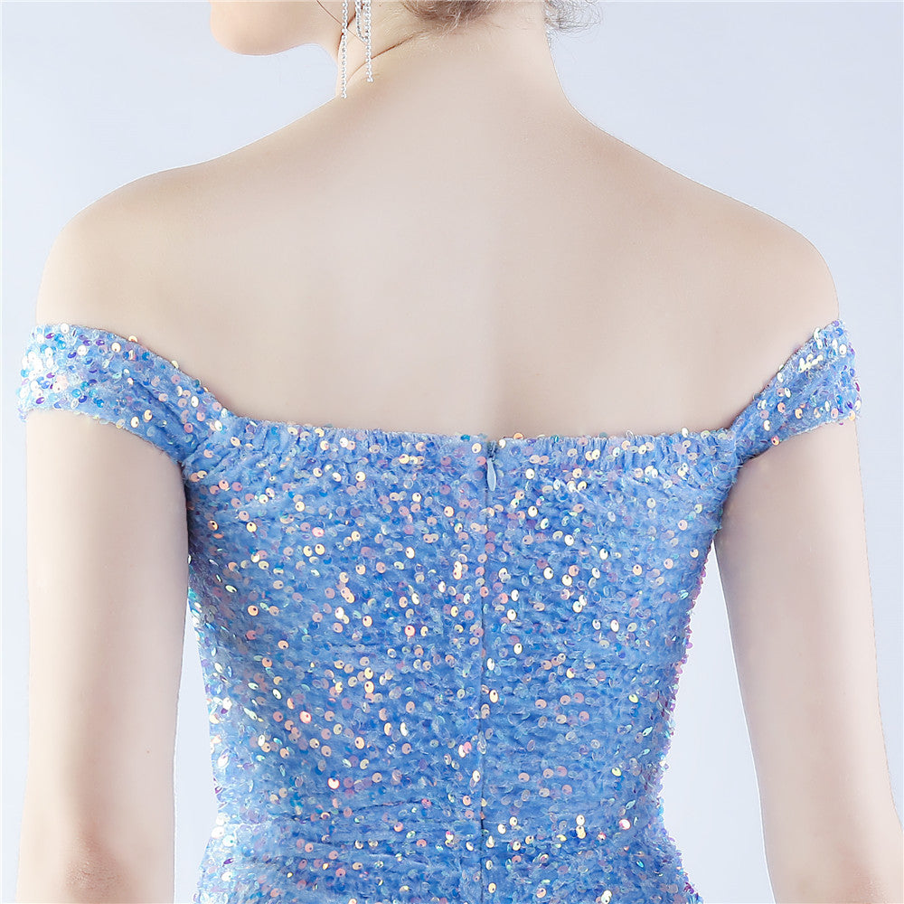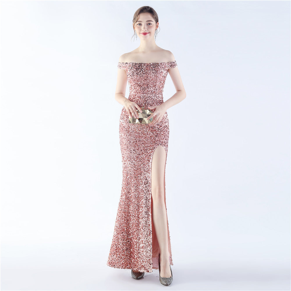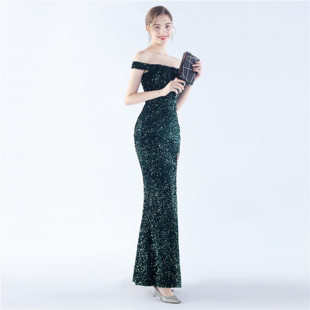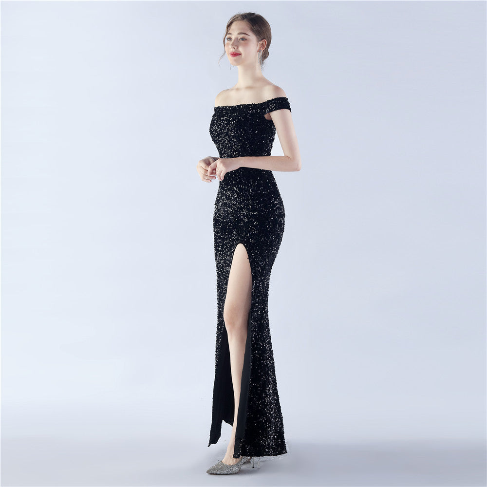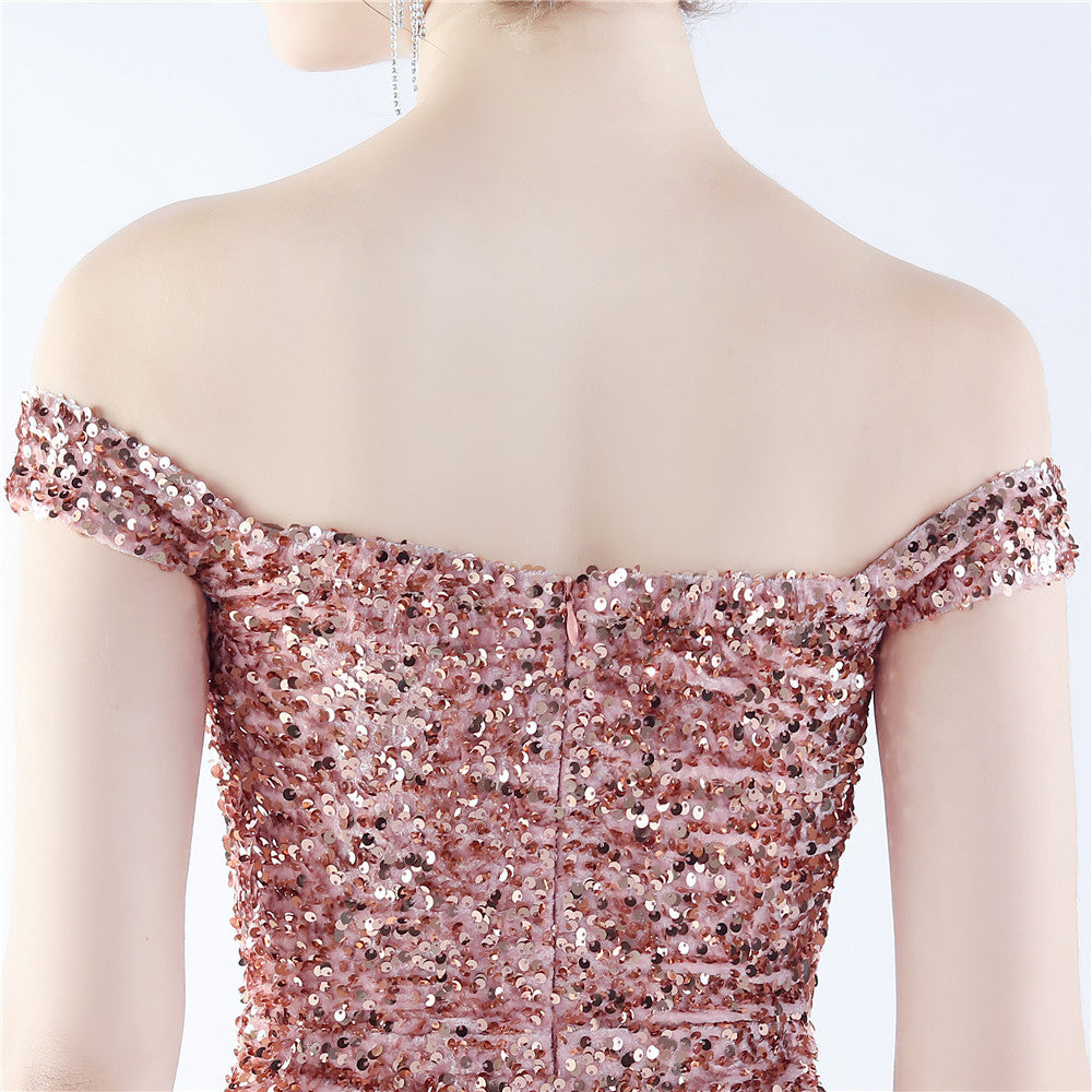 A sleek off shoulder maxi with a slim silhouette. Sequins shimmer along the bodice, with a hidden zipper and a side split.