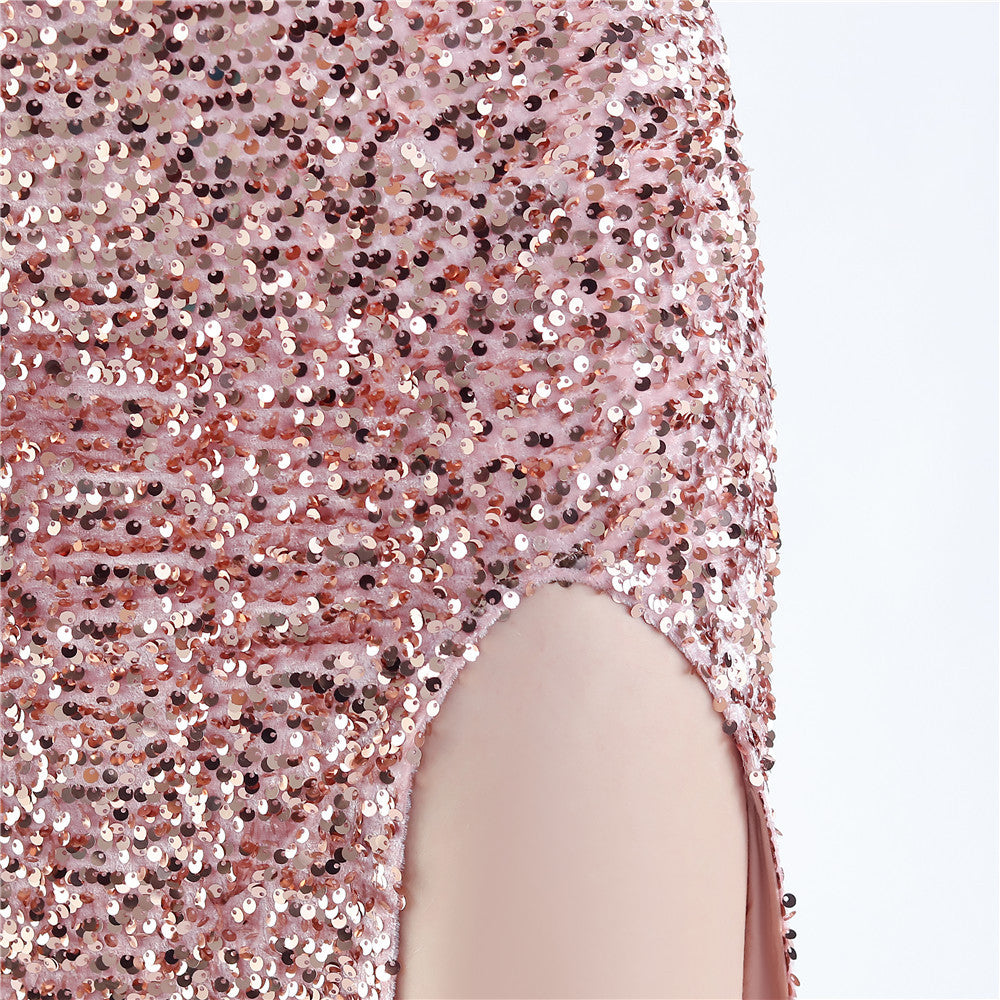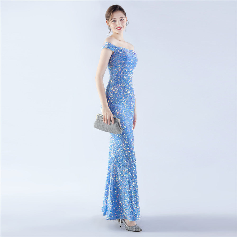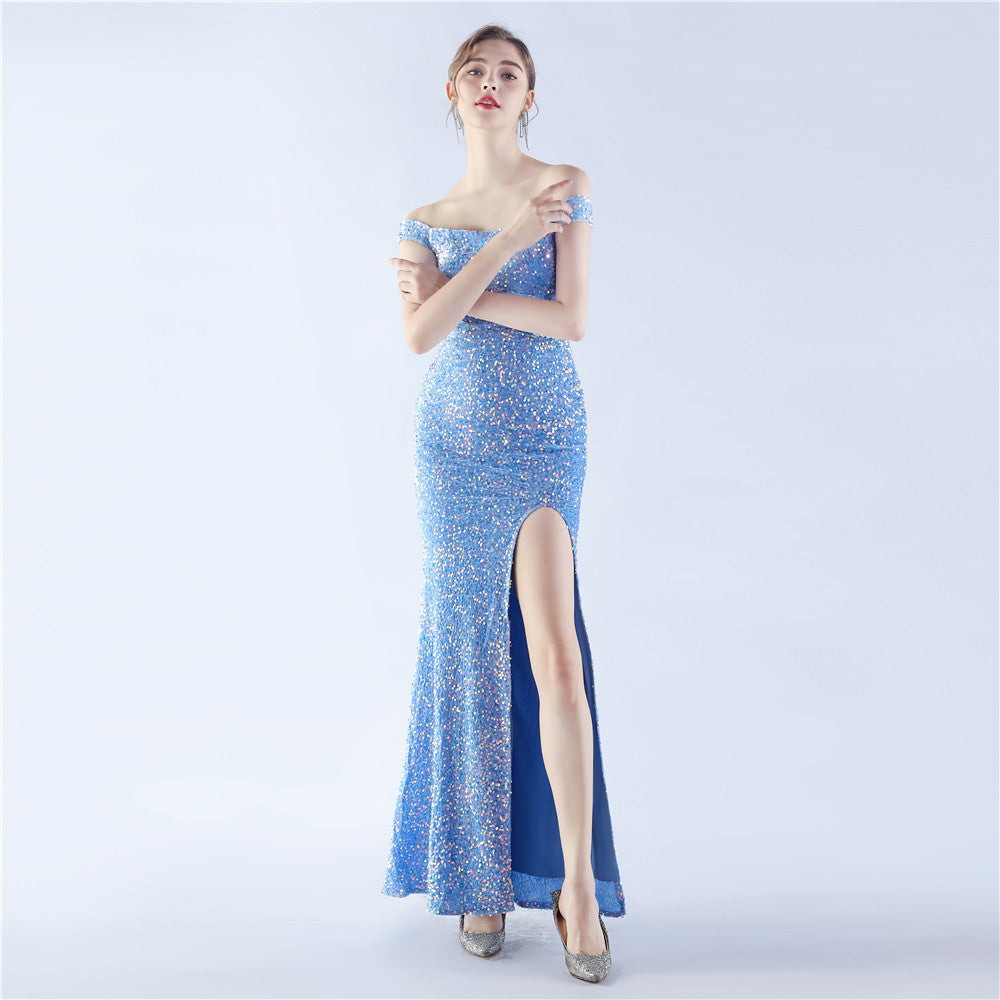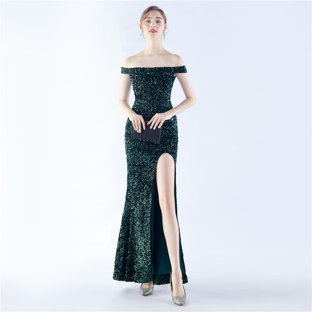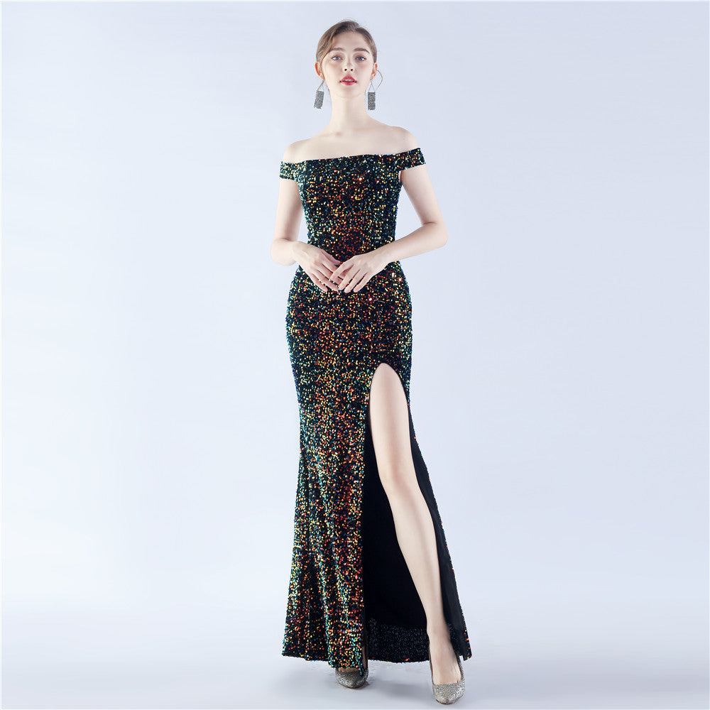 A sleek off shoulder maxi with a slim silhouette. Sequins shimmer along the bodice, with a hidden zipper and a side split.