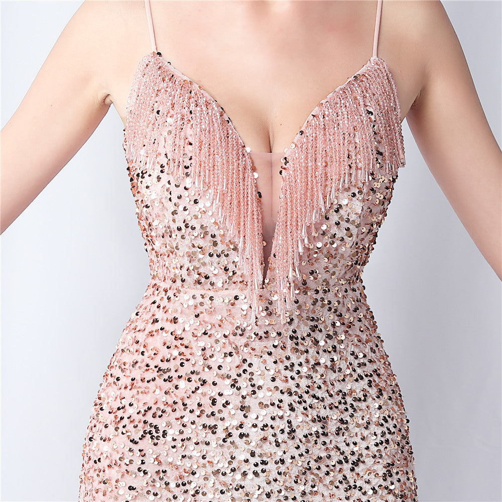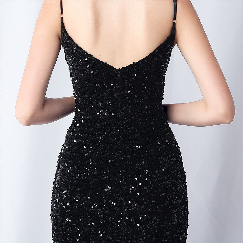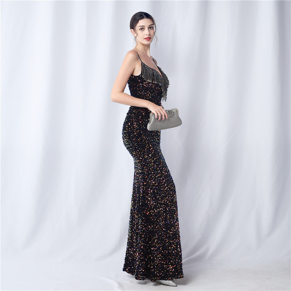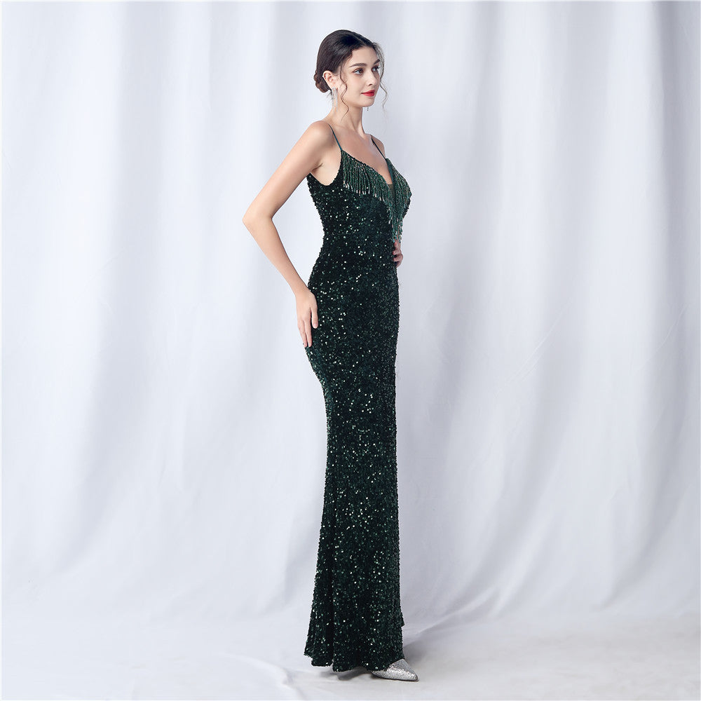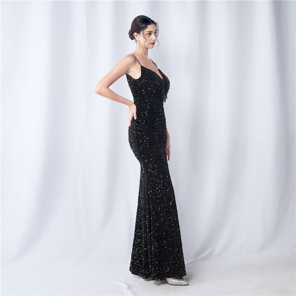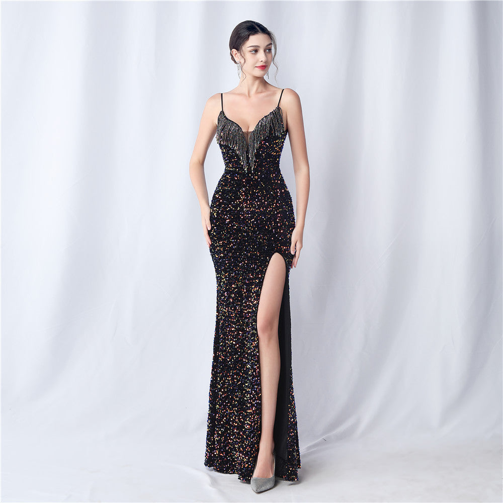An elegant maxi with a slim silhouette. The V-neckline is accented with sequined fringe along the length, finished with a front split and a hidden zipper.
