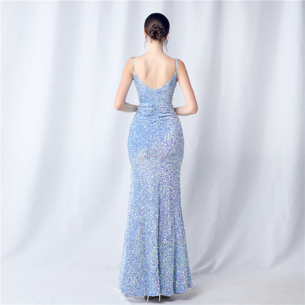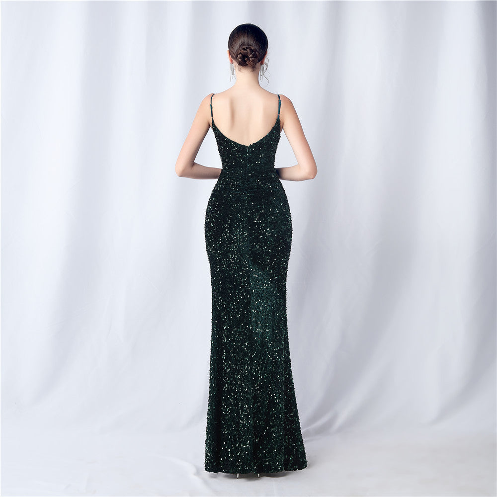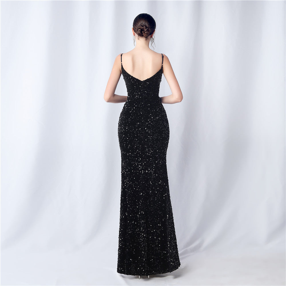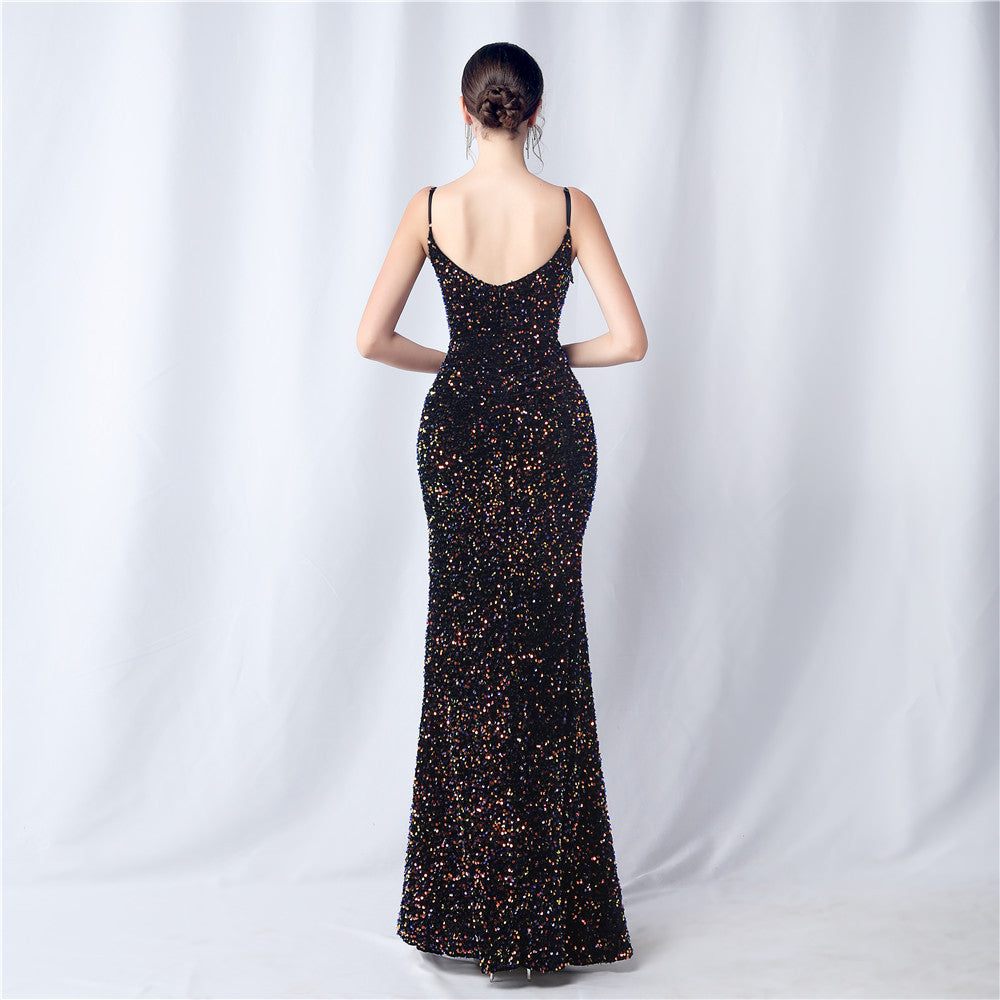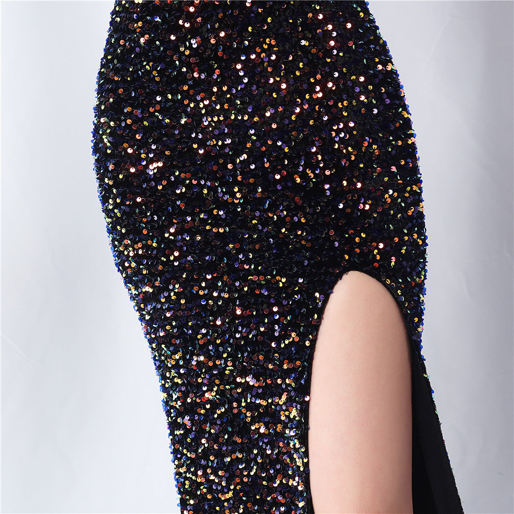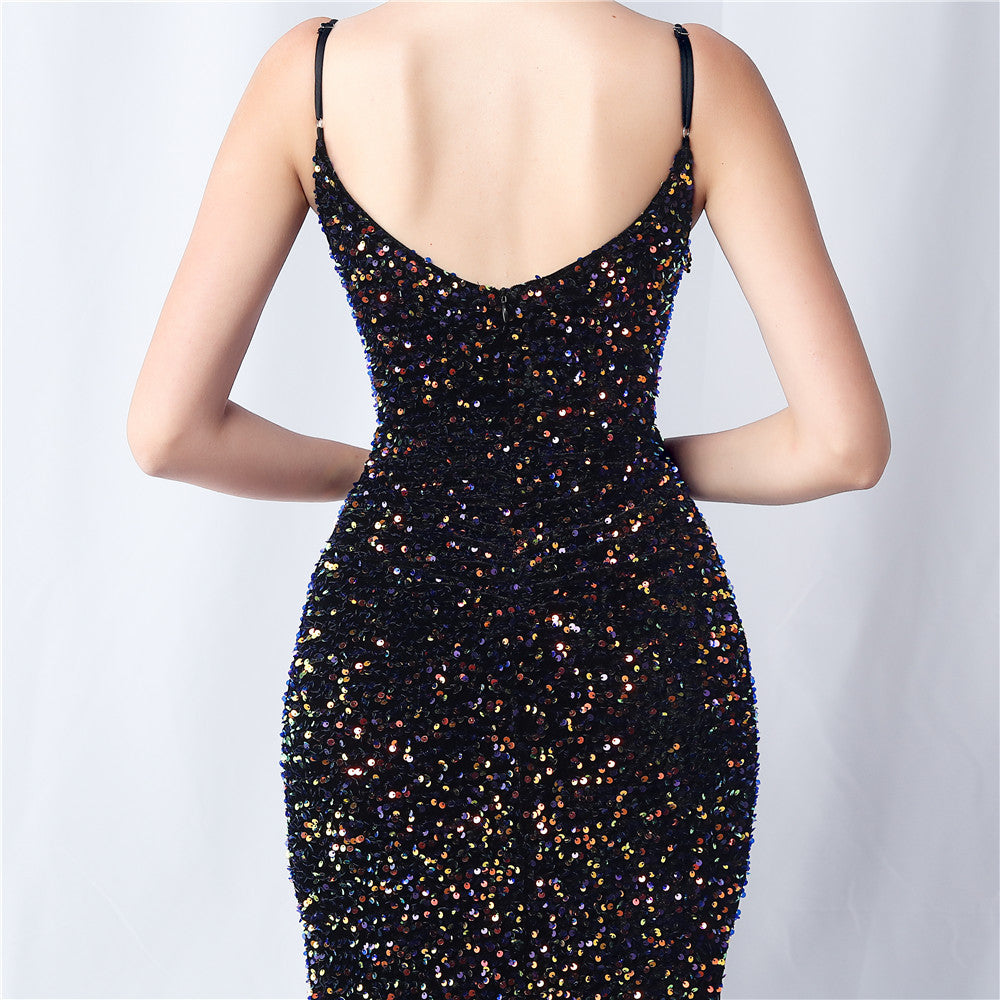 An elegant maxi with a slim silhouette. The V-neckline is accented with sequined fringe along the length, finished with a front split and a hidden zipper.