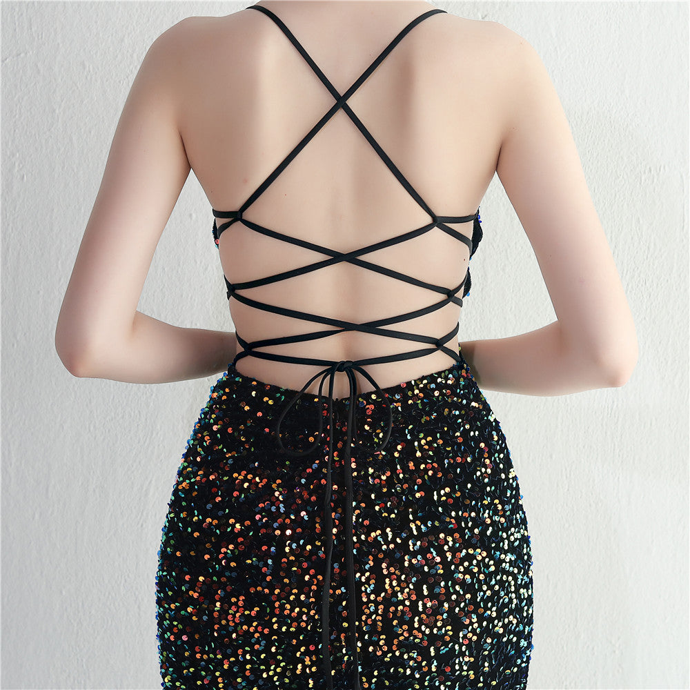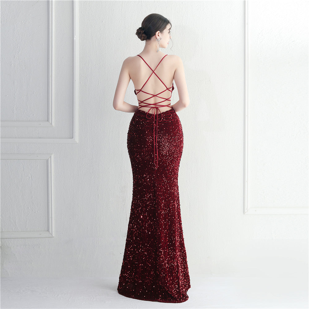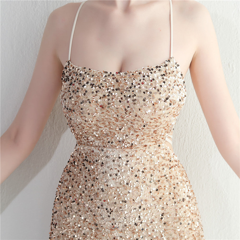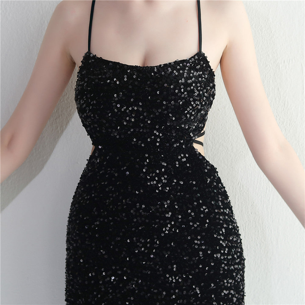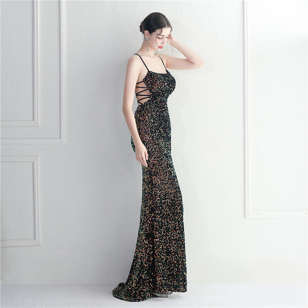 A sleek maxi with a slim silhouette that skims the floor. Spaghetti-strap neckline, a lace-up detail, a side split and subtle sequins finish the look with a clean back.
