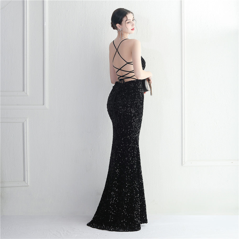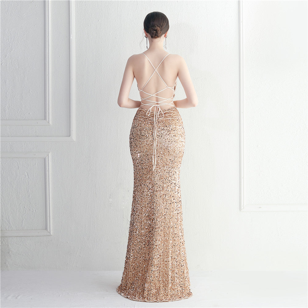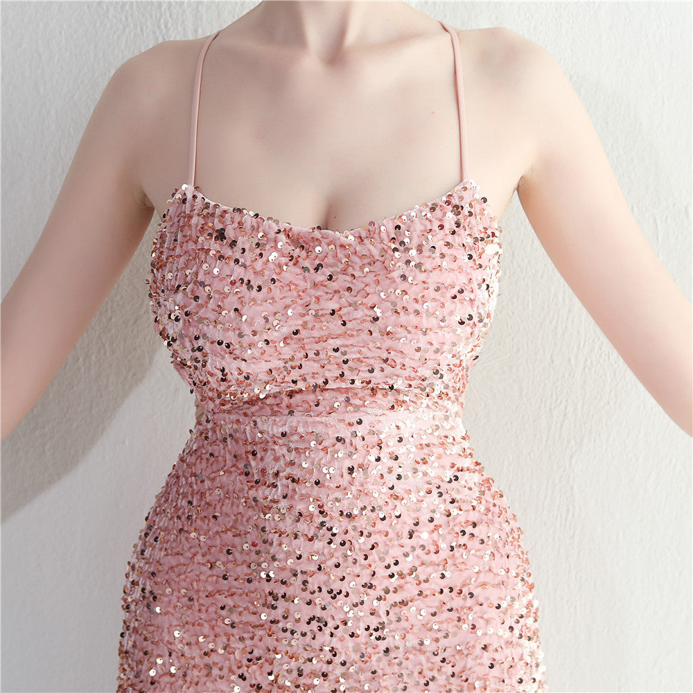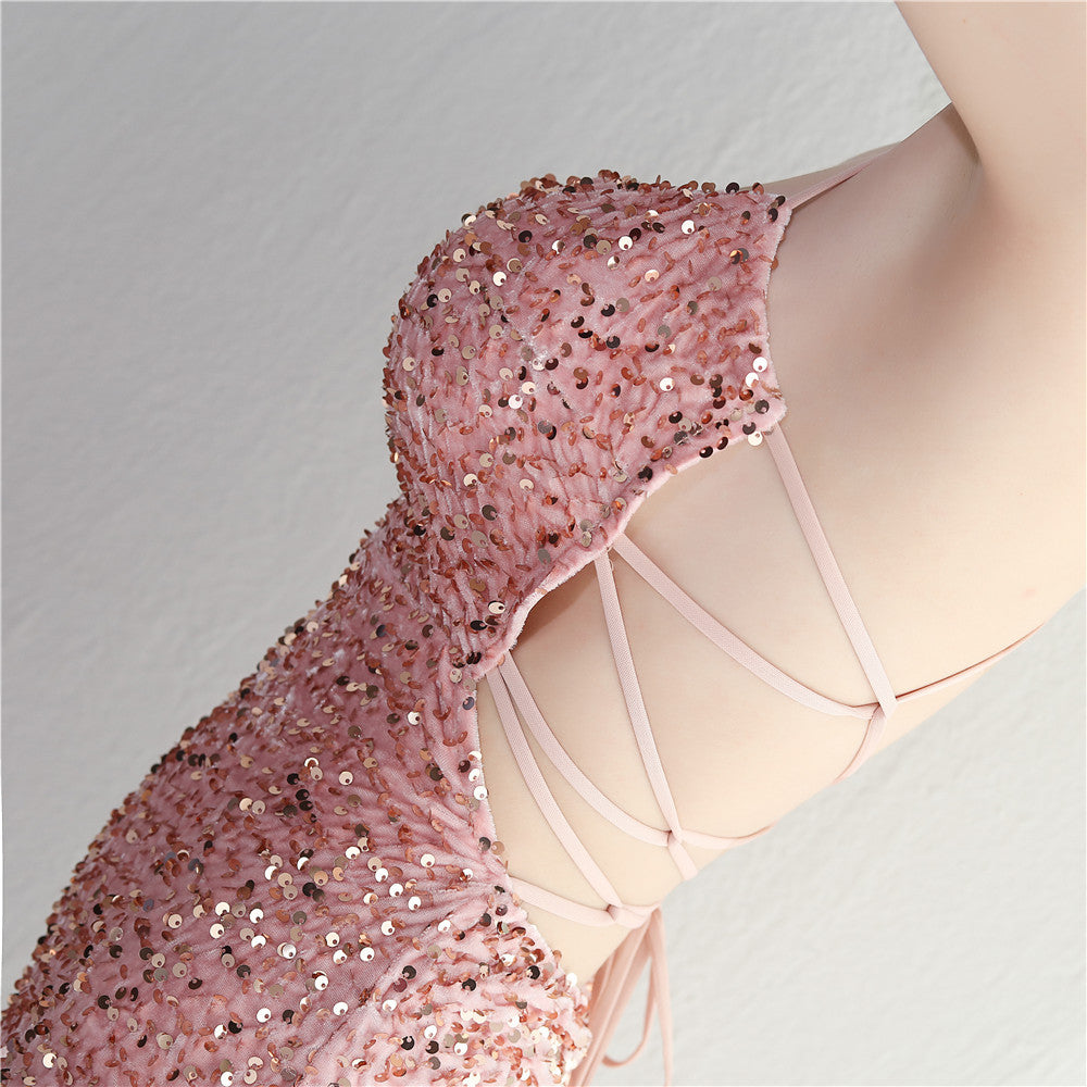 A sleek maxi with a slim silhouette that skims the floor. Spaghetti-strap neckline, a lace-up detail, a side split and subtle sequins finish the look with a clean back.
