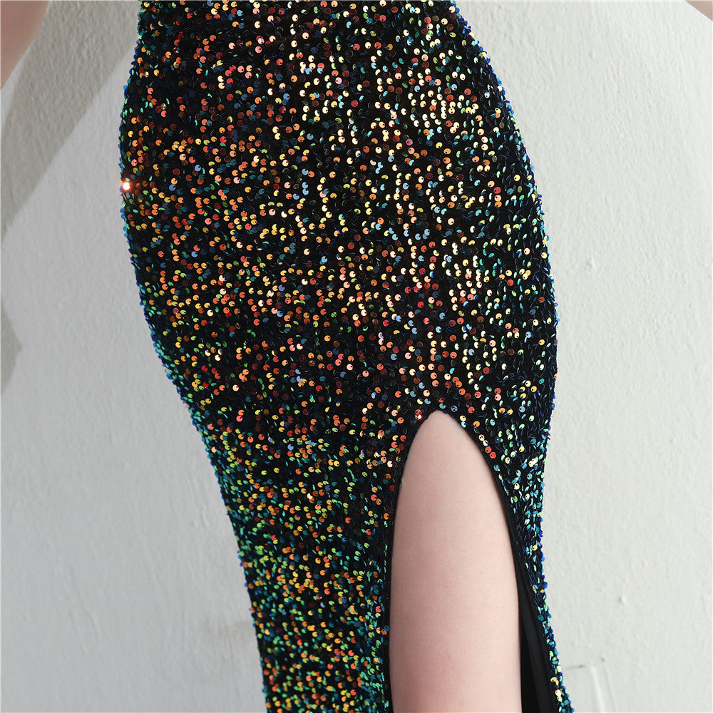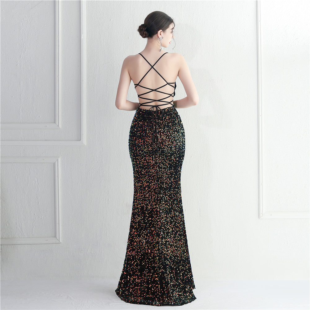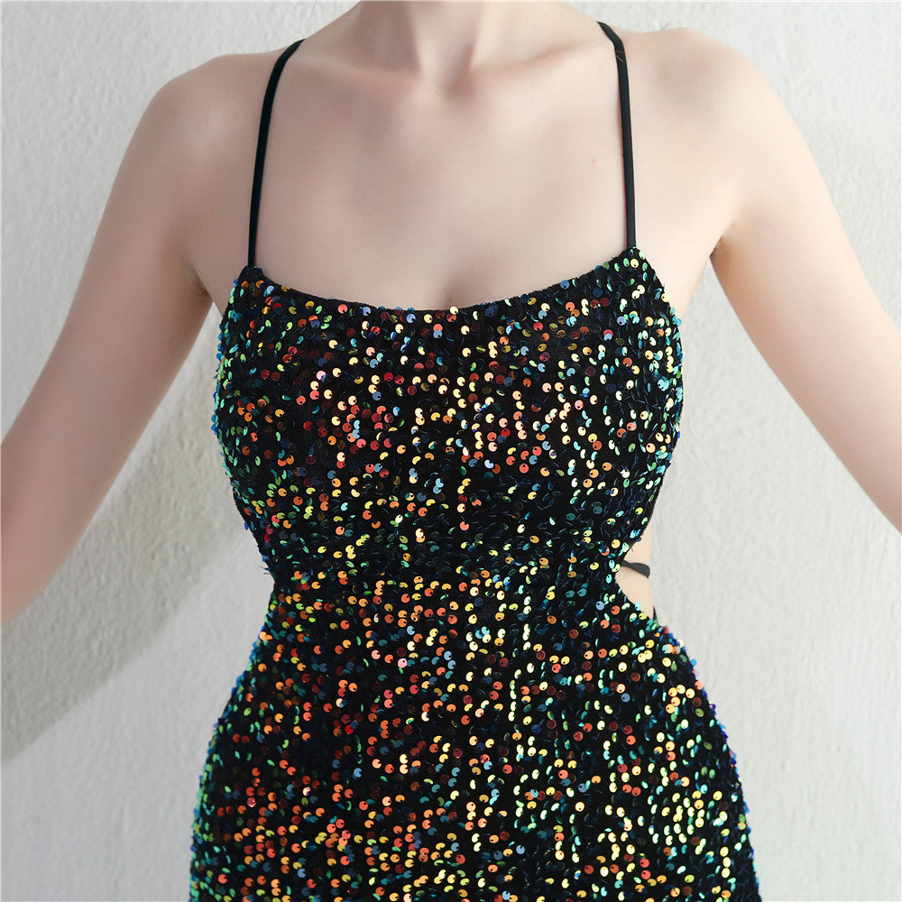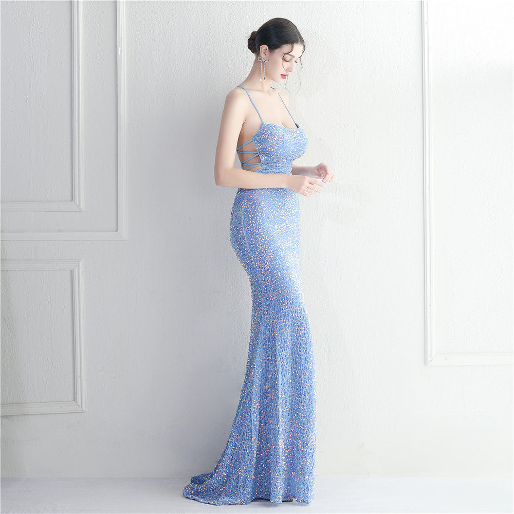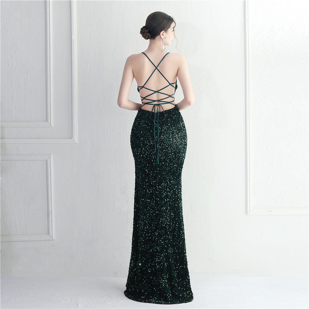A sleek maxi with a slim silhouette that skims the floor. Spaghetti-strap neckline, a lace-up detail, a side split and subtle sequins finish the look with a clean back.