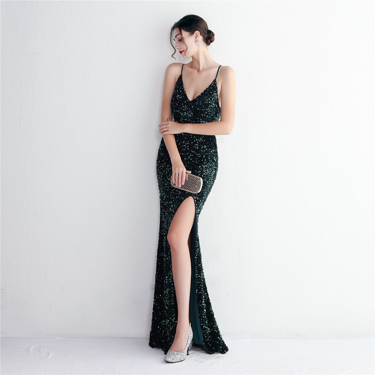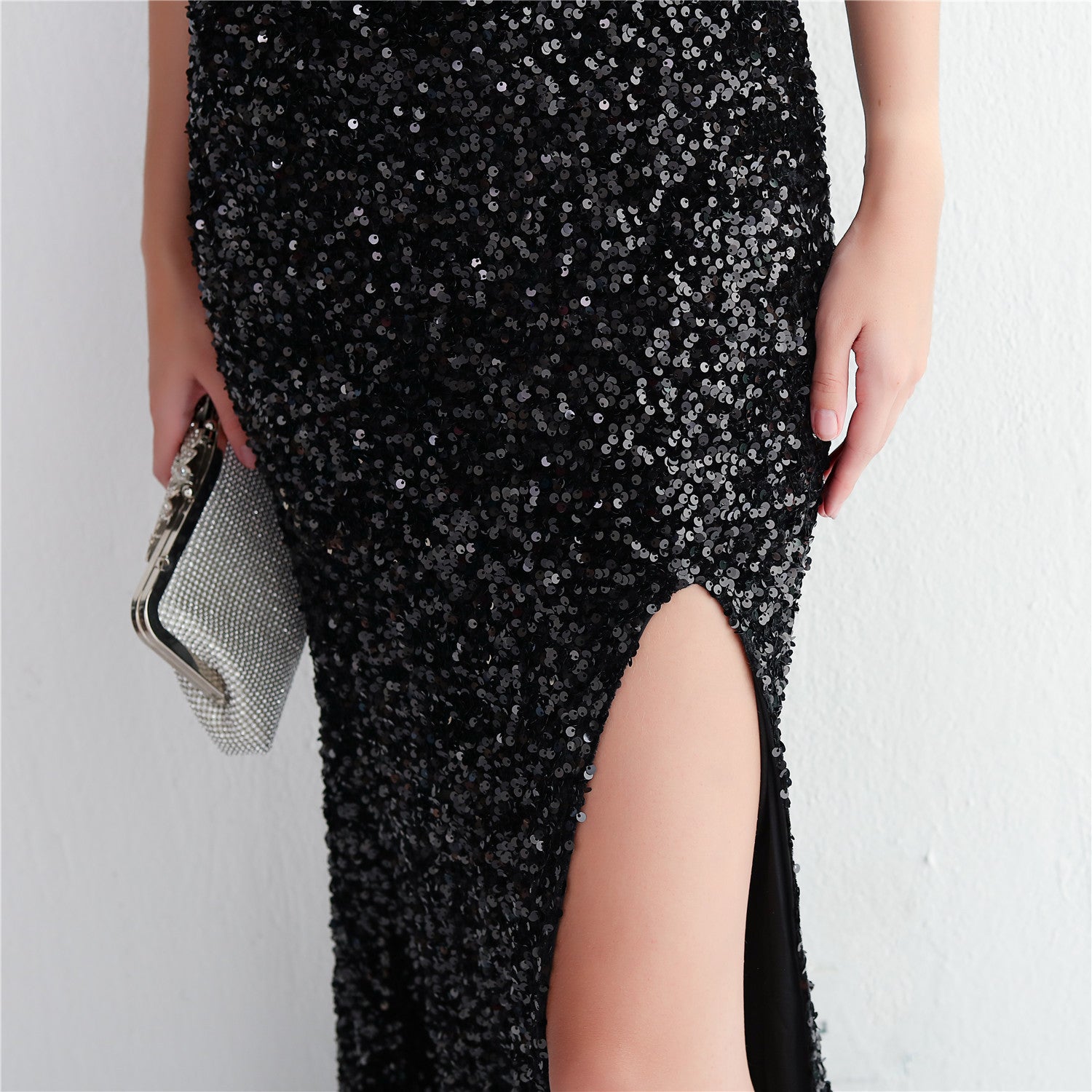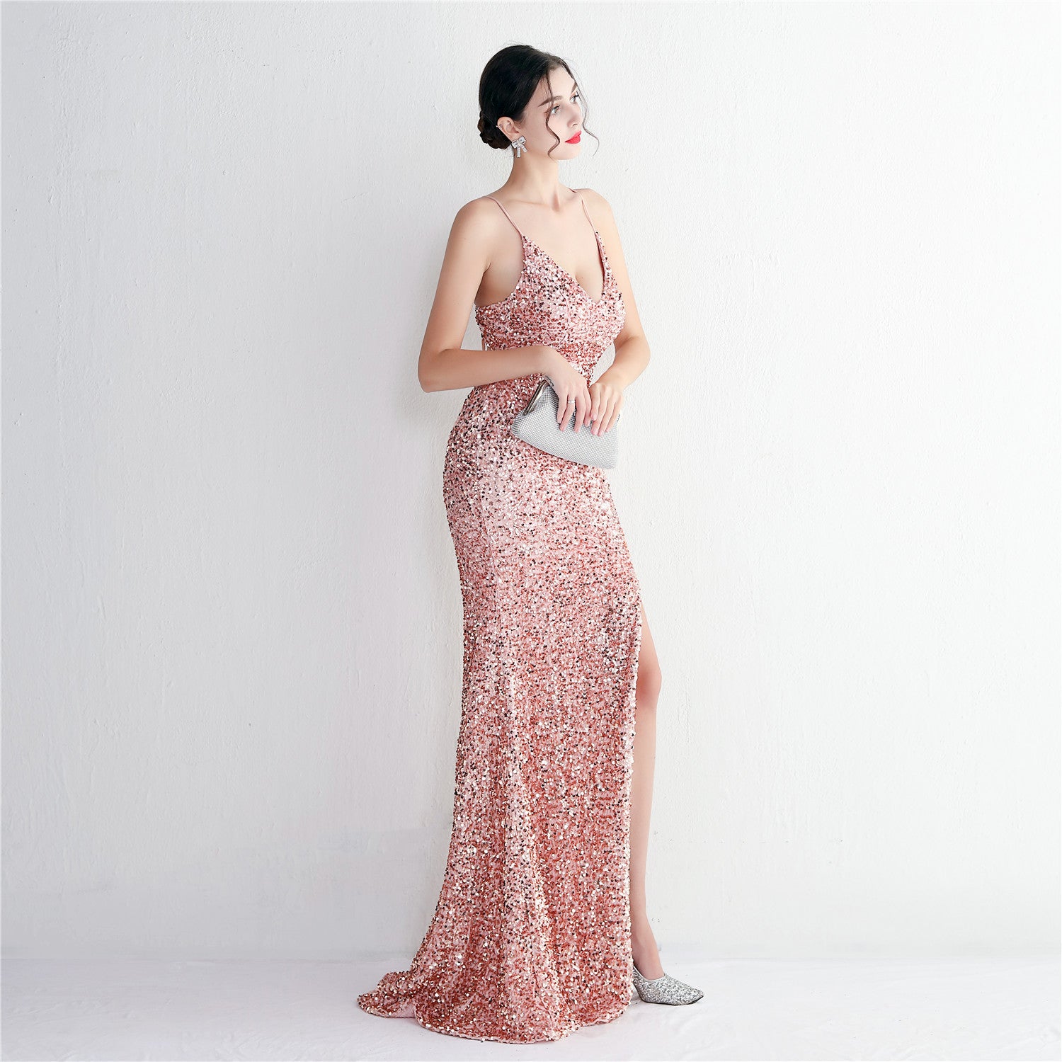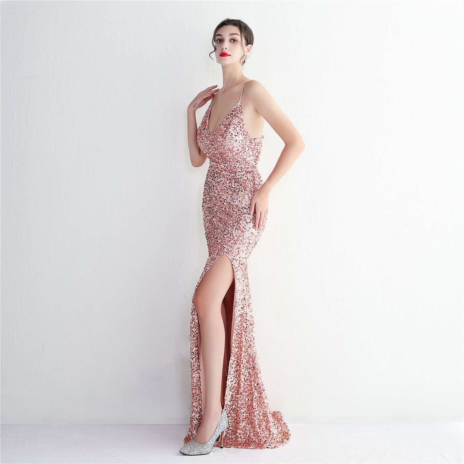 A slim, floor-length silhouette defines this sequined maxi. It features a V-neckline and a sleeveless cut with subtle sequin embellishment.