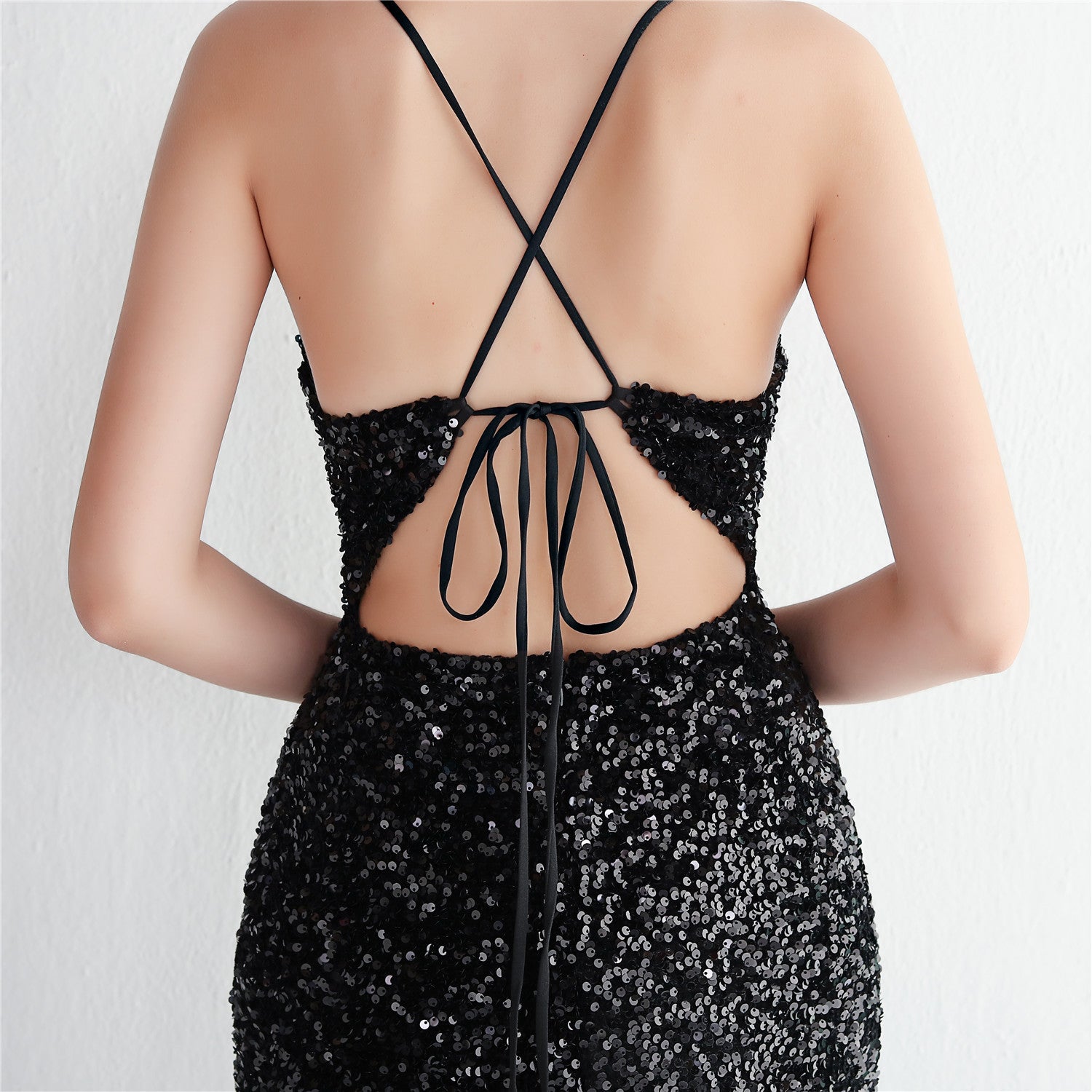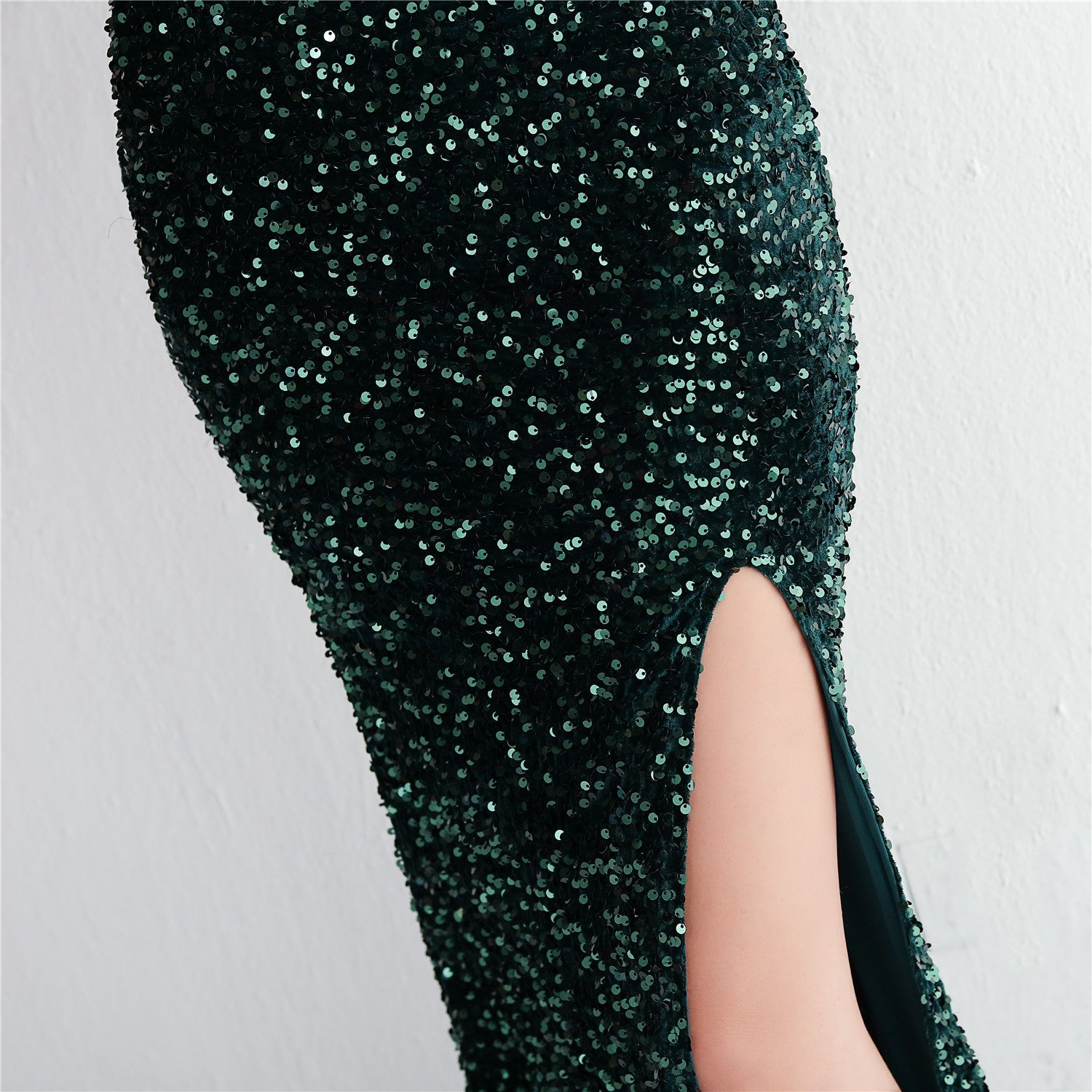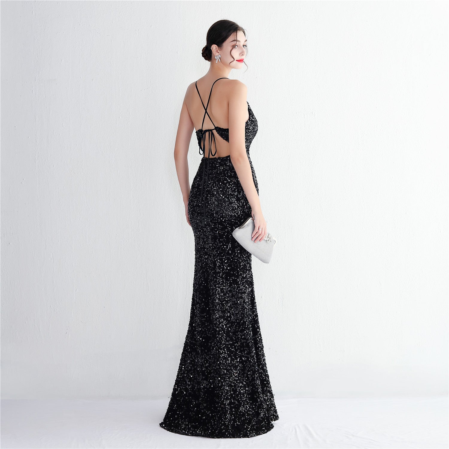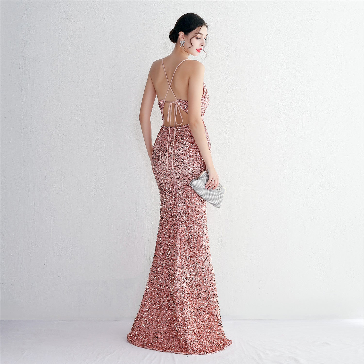 A slim, floor-length silhouette defines this sequined maxi. It features a V-neckline and a sleeveless cut with subtle sequin embellishment.