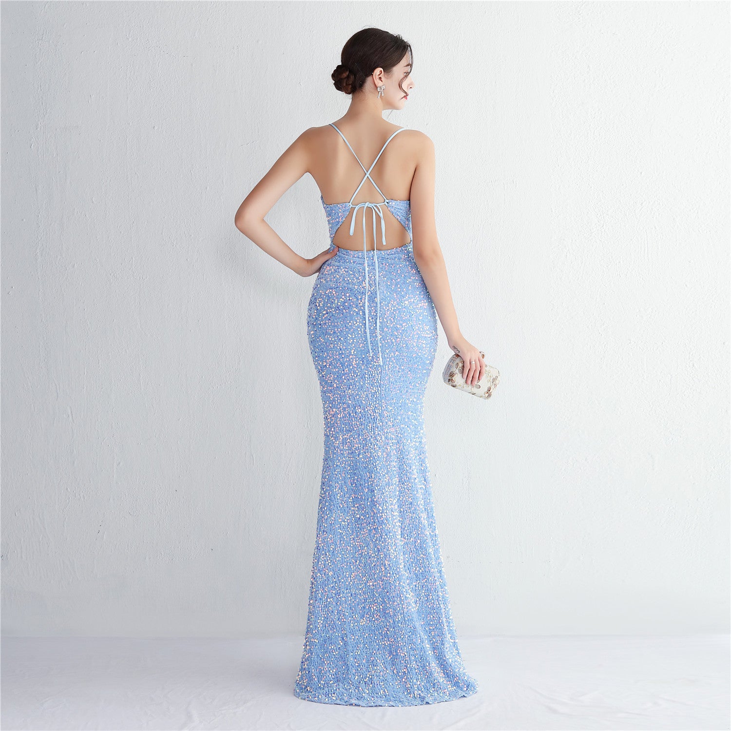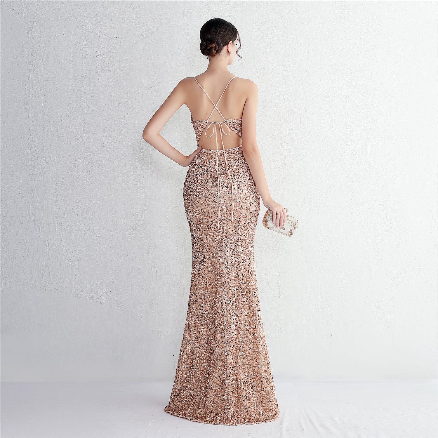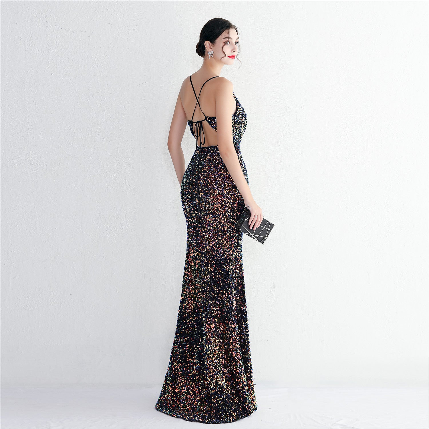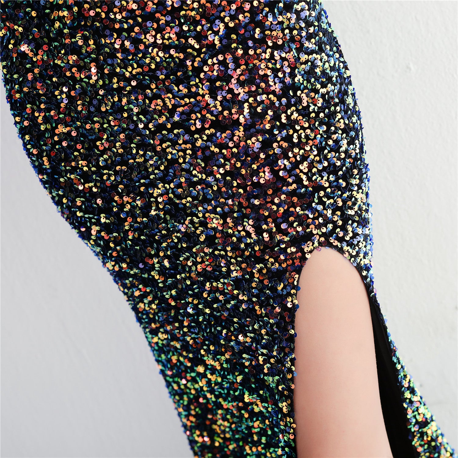 A slim, floor-length silhouette defines this sequined maxi. It features a V-neckline and a sleeveless cut with subtle sequin embellishment.