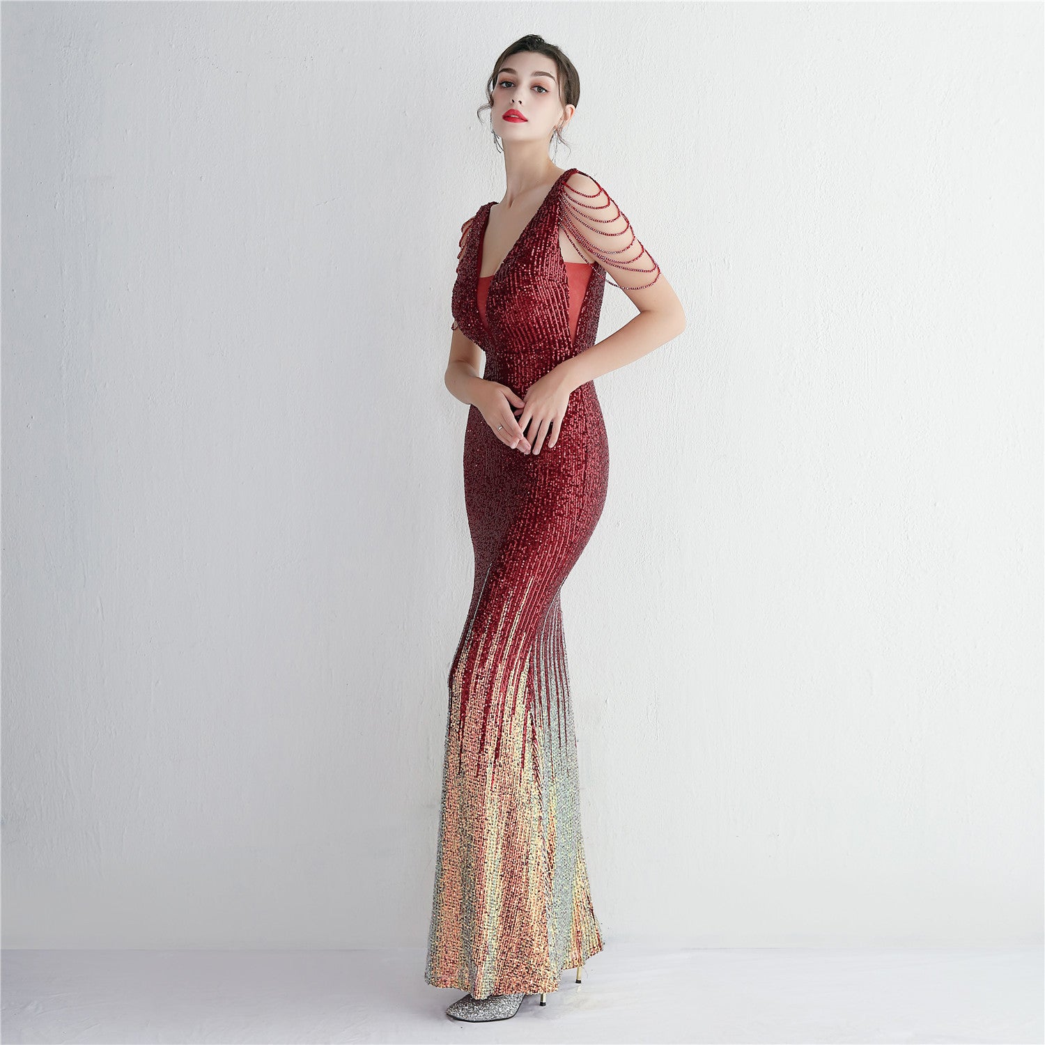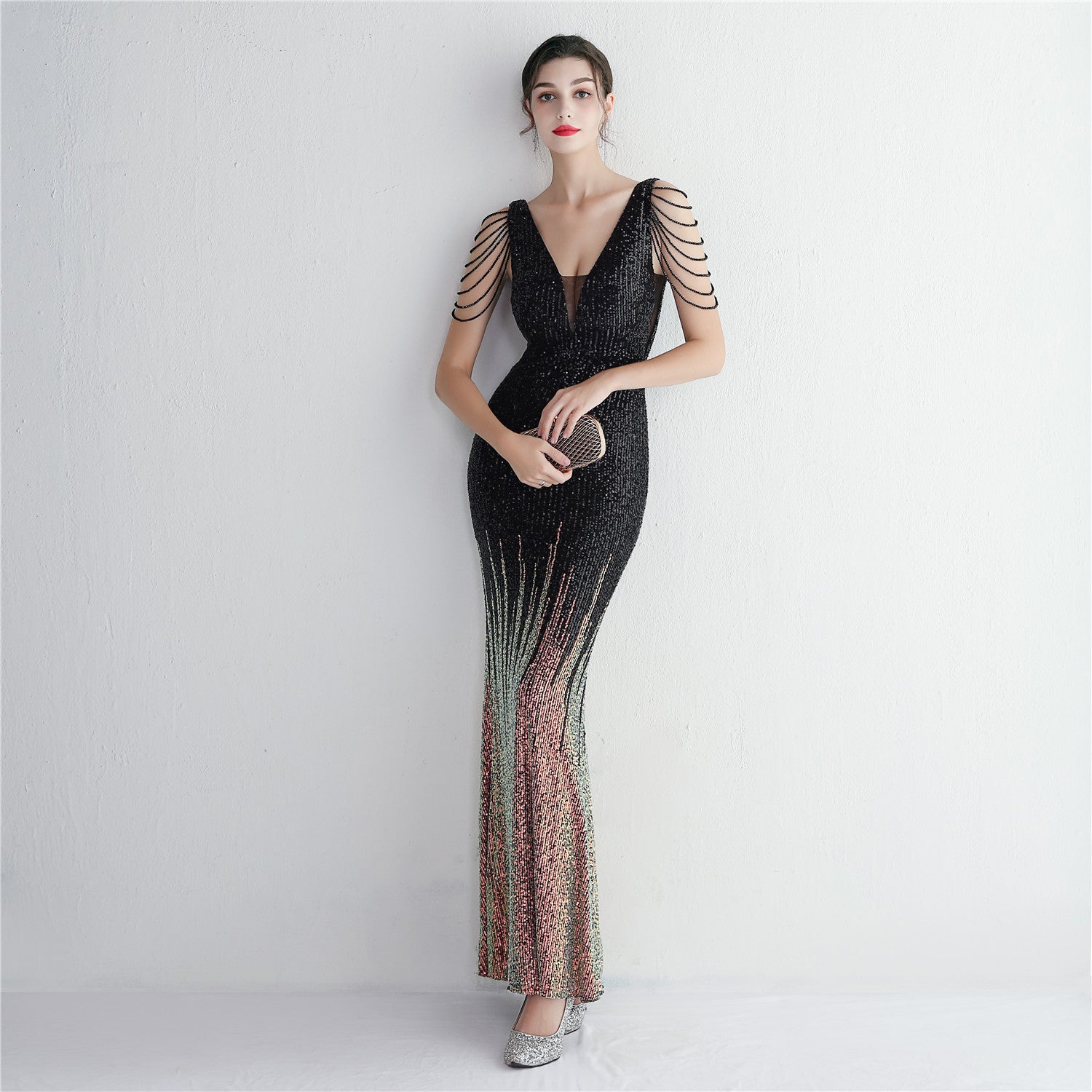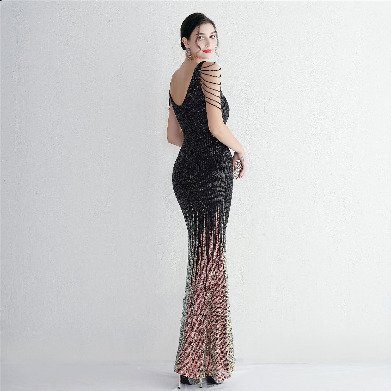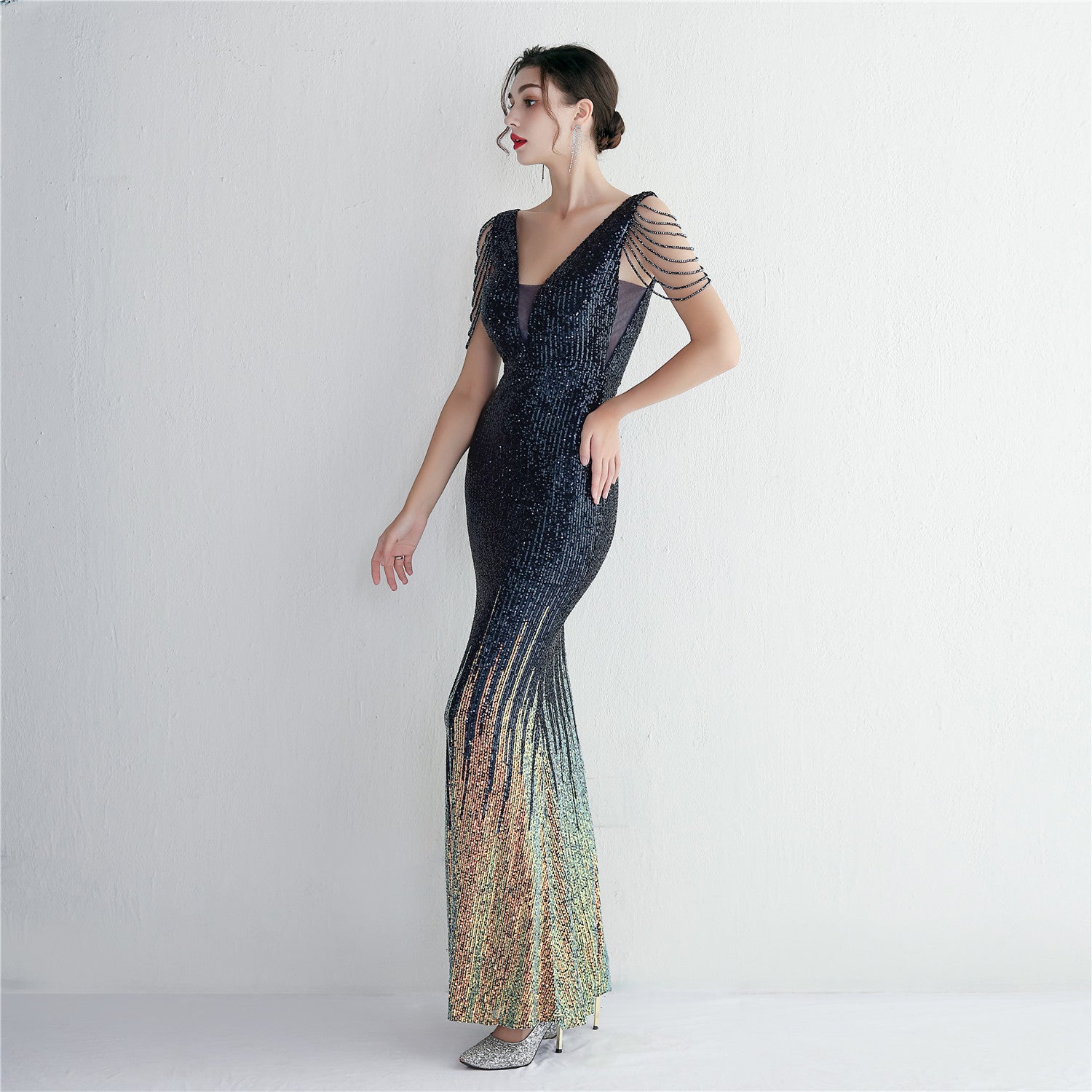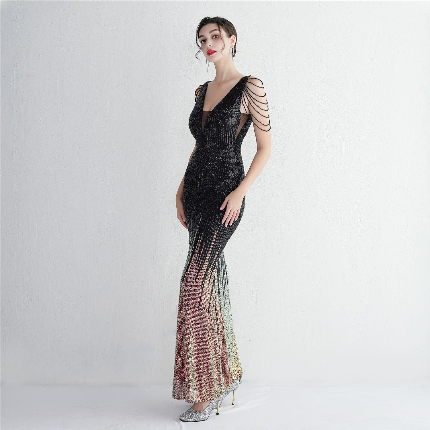 An ombre sequin maxi creates a slim, streamlined silhouette. A V-neckline with fringe accents adds subtle shimmer along the length.