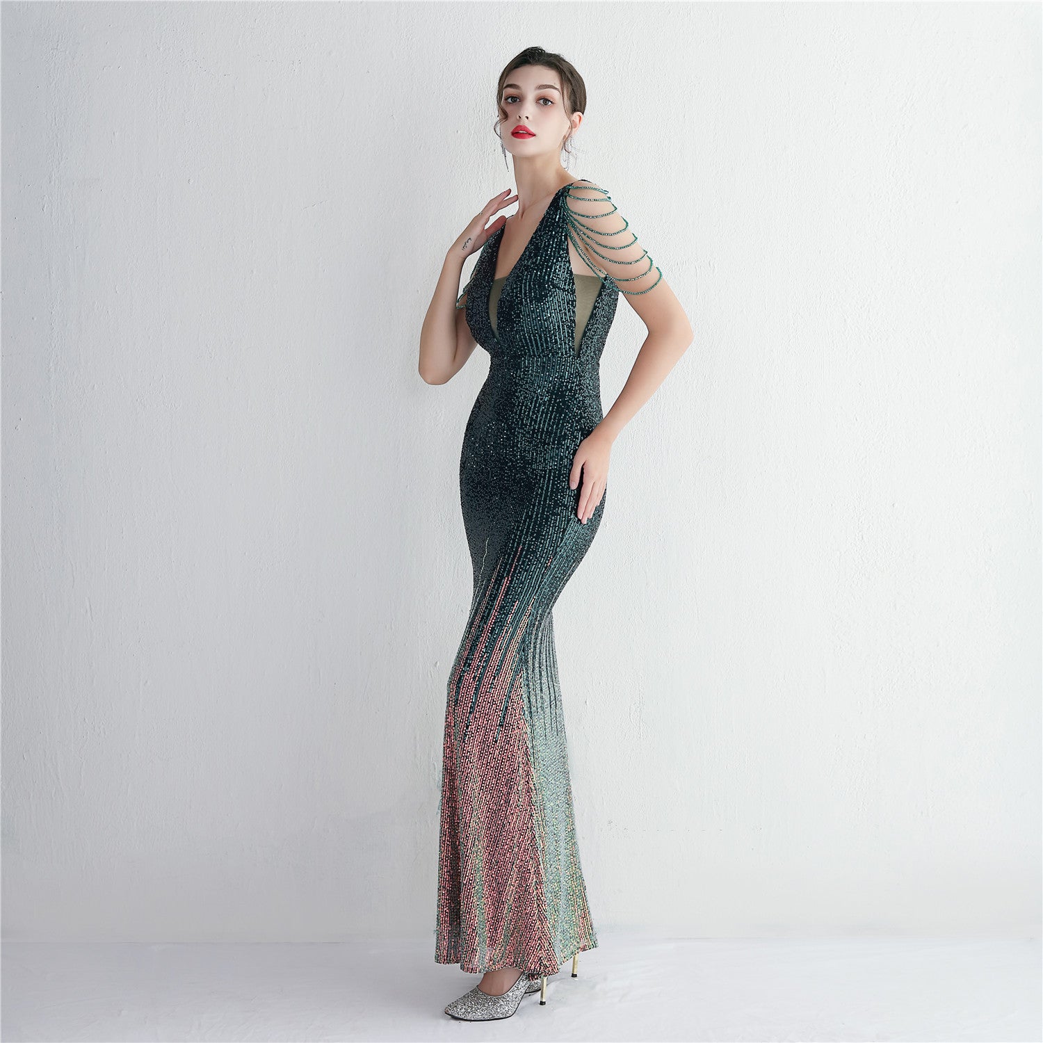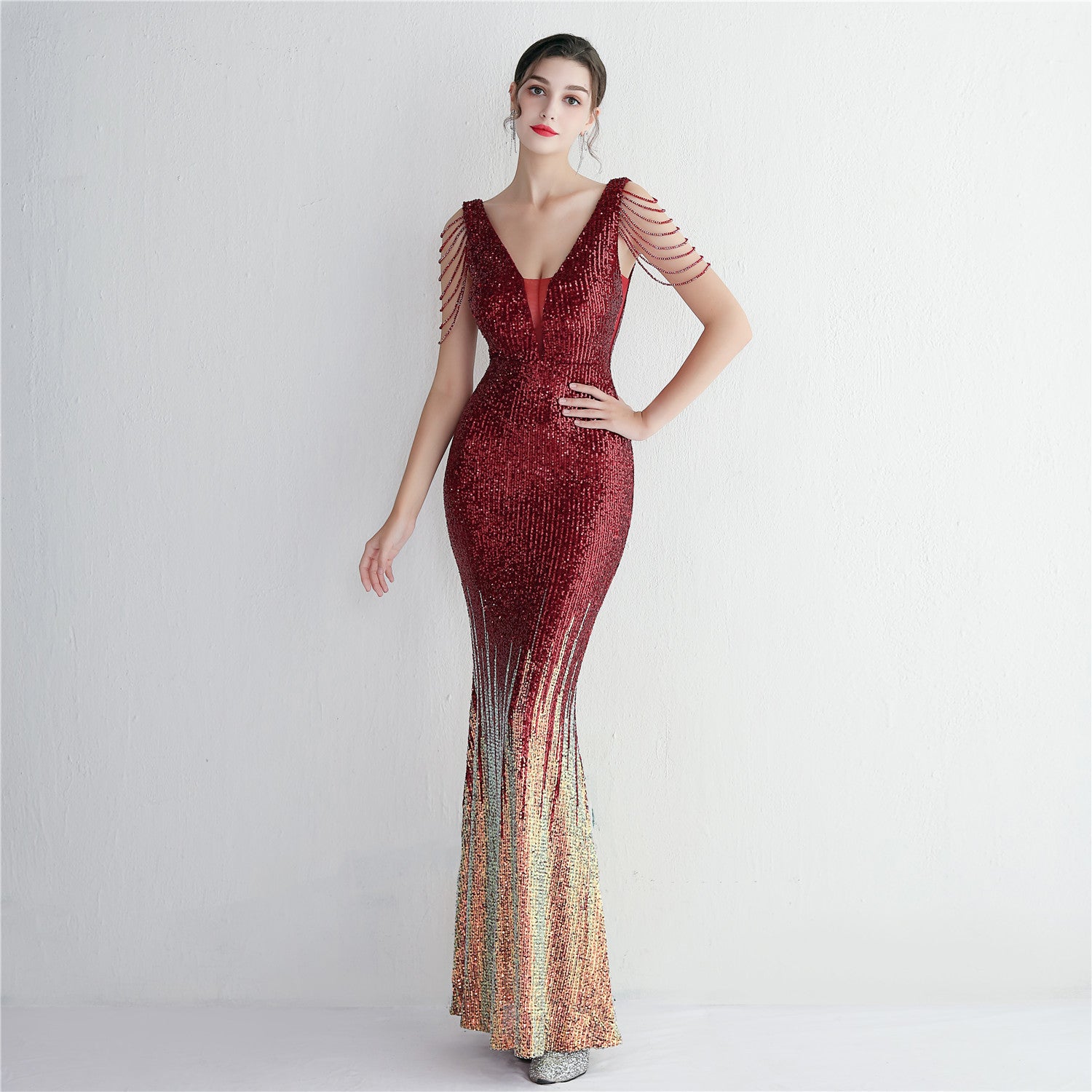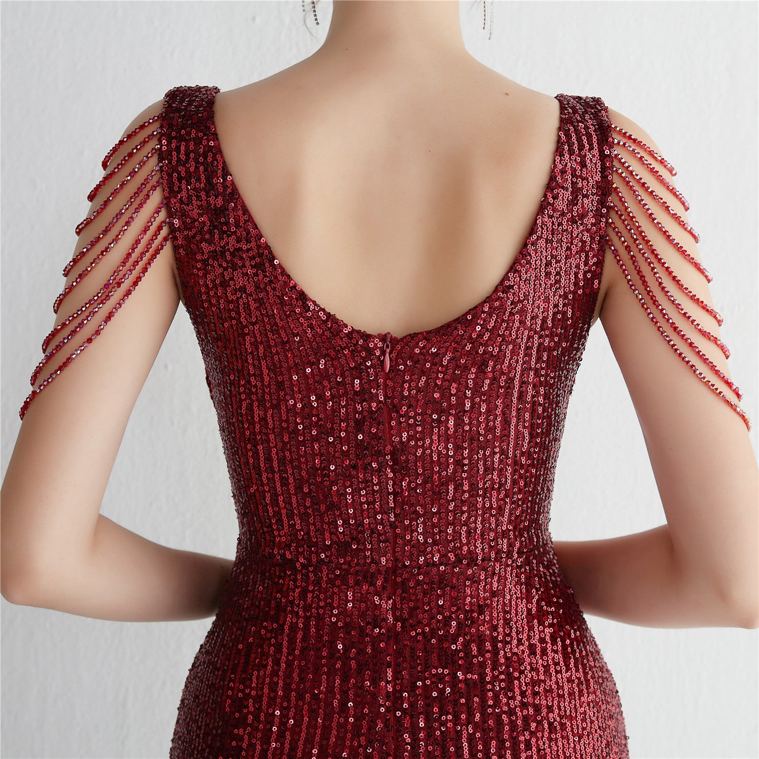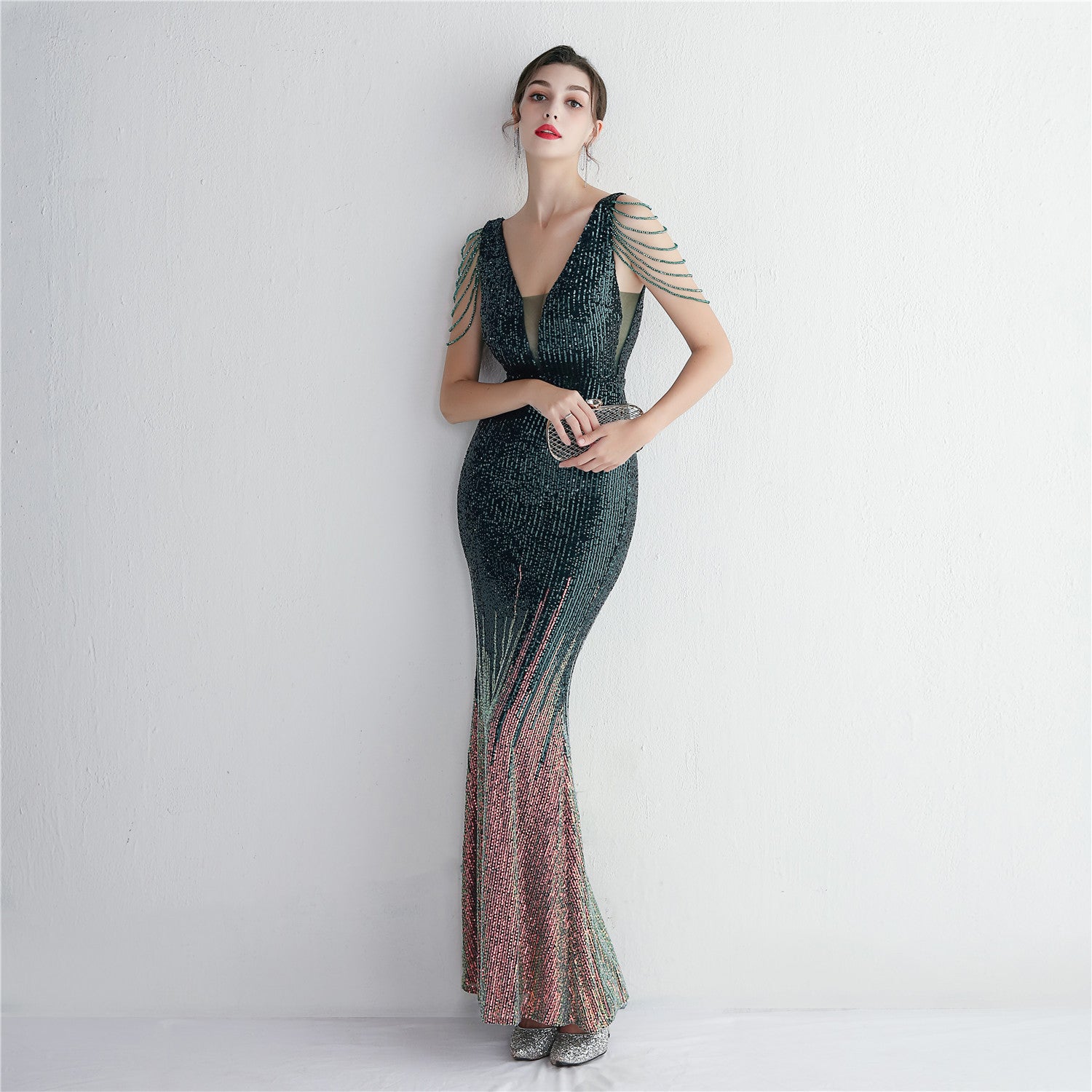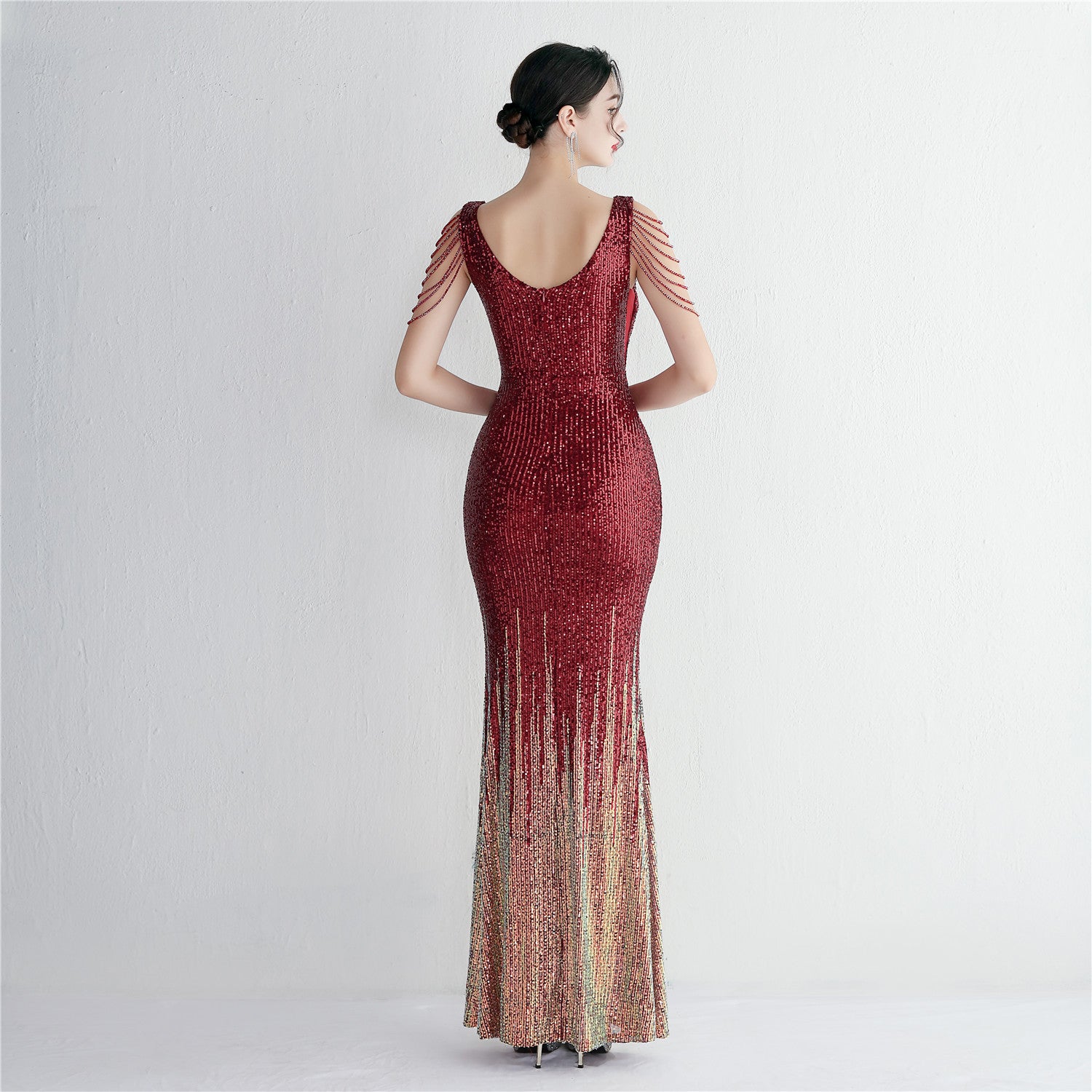 An ombre sequin maxi creates a slim, streamlined silhouette. A V-neckline with fringe accents adds subtle shimmer along the length.