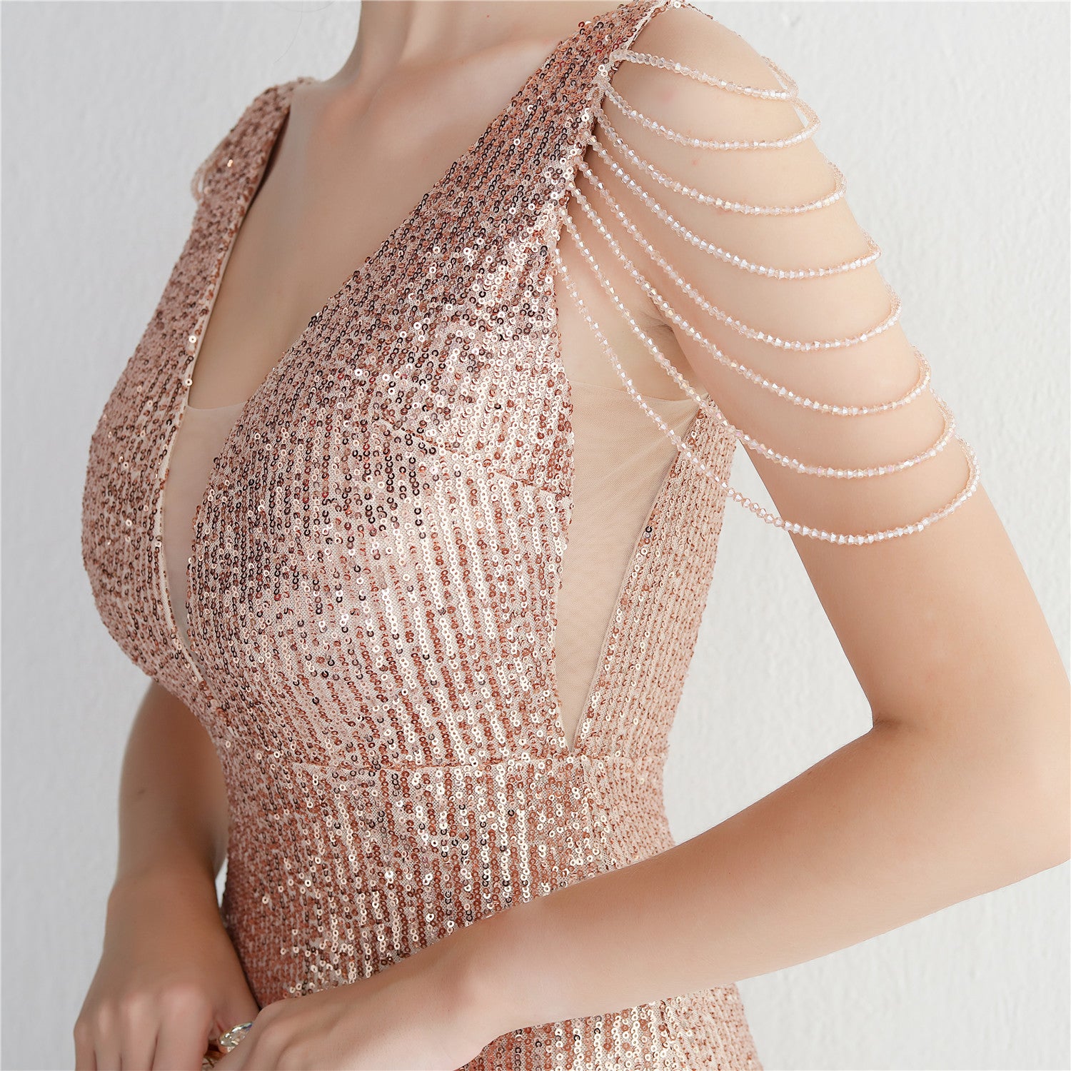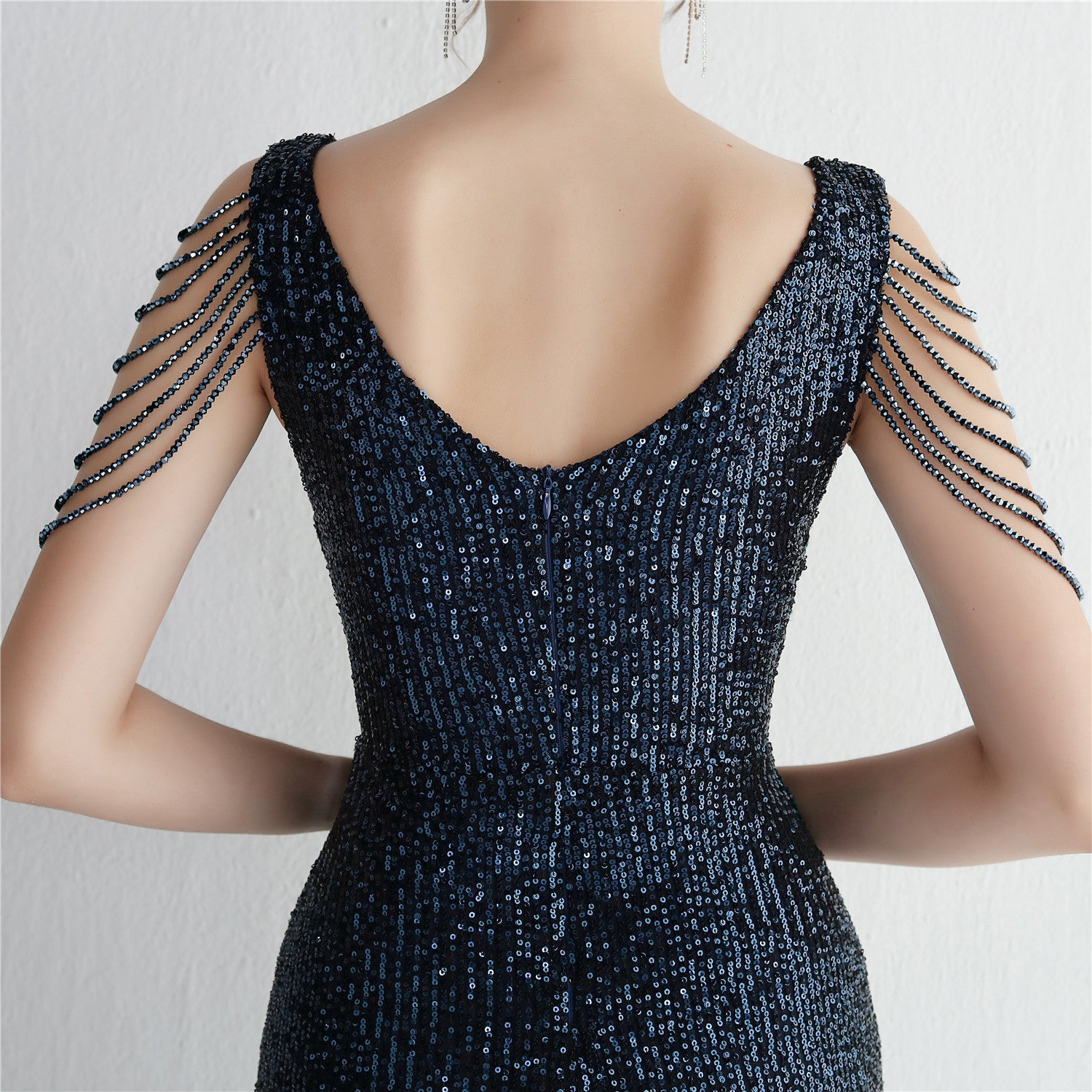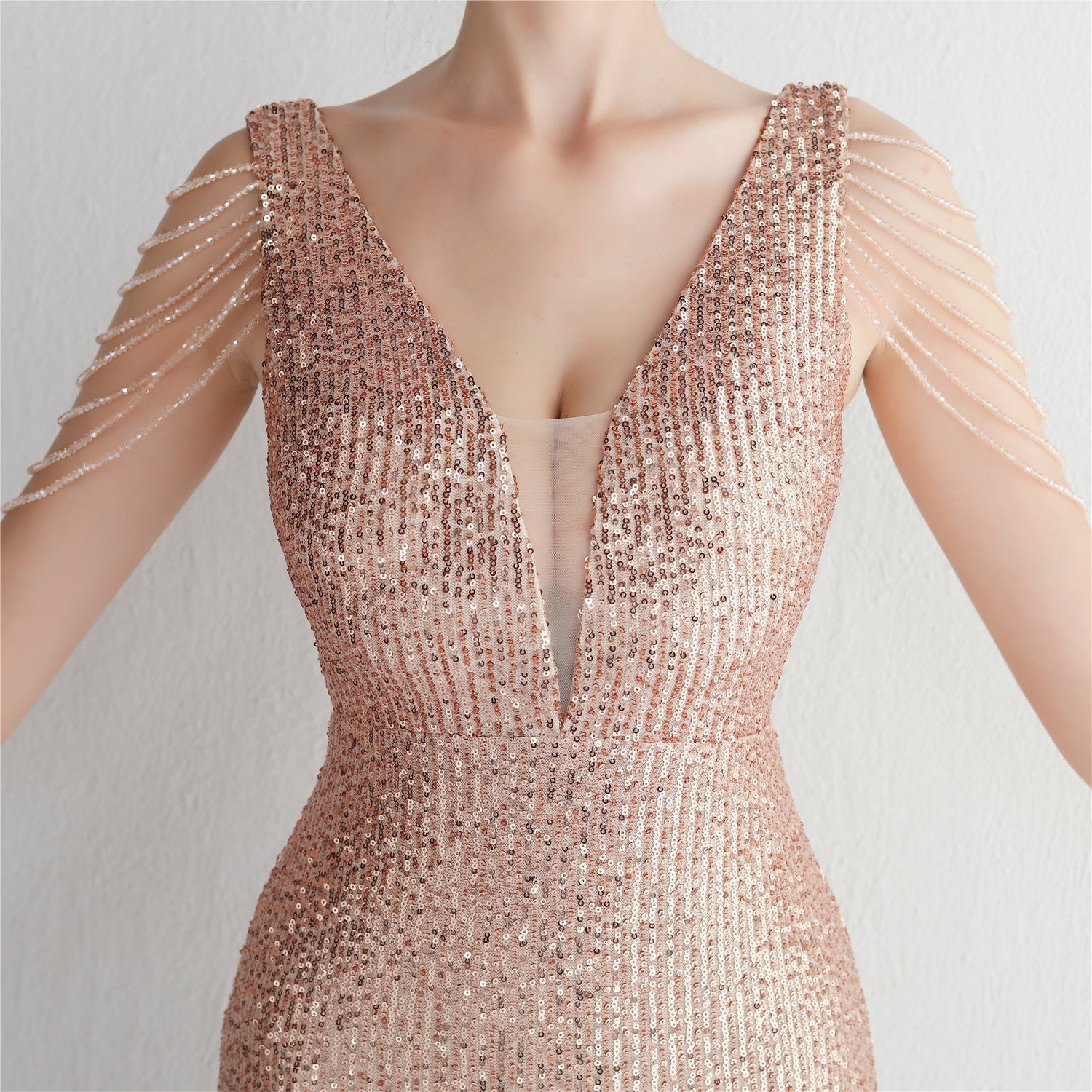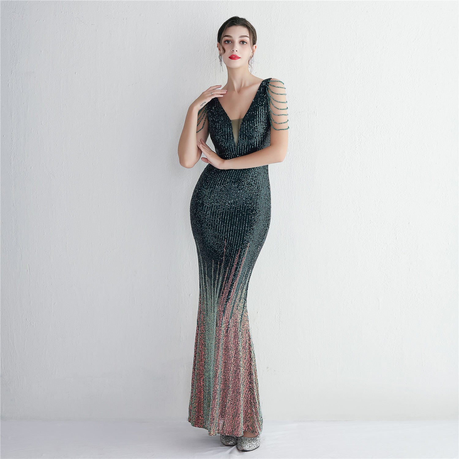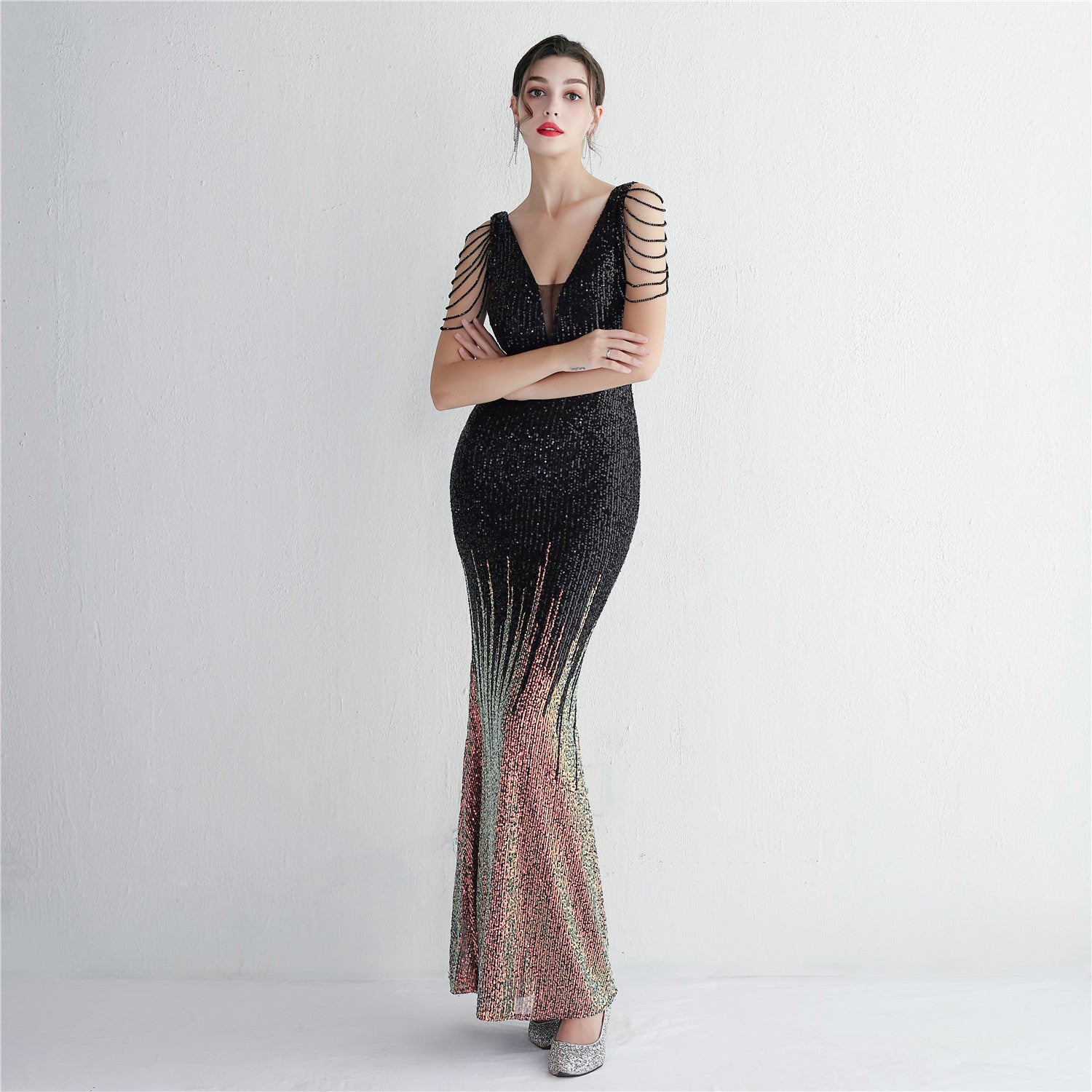 An ombre sequin maxi creates a slim, streamlined silhouette. A V-neckline with fringe accents adds subtle shimmer along the length.