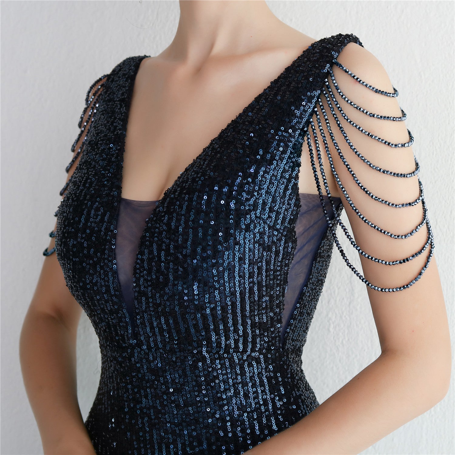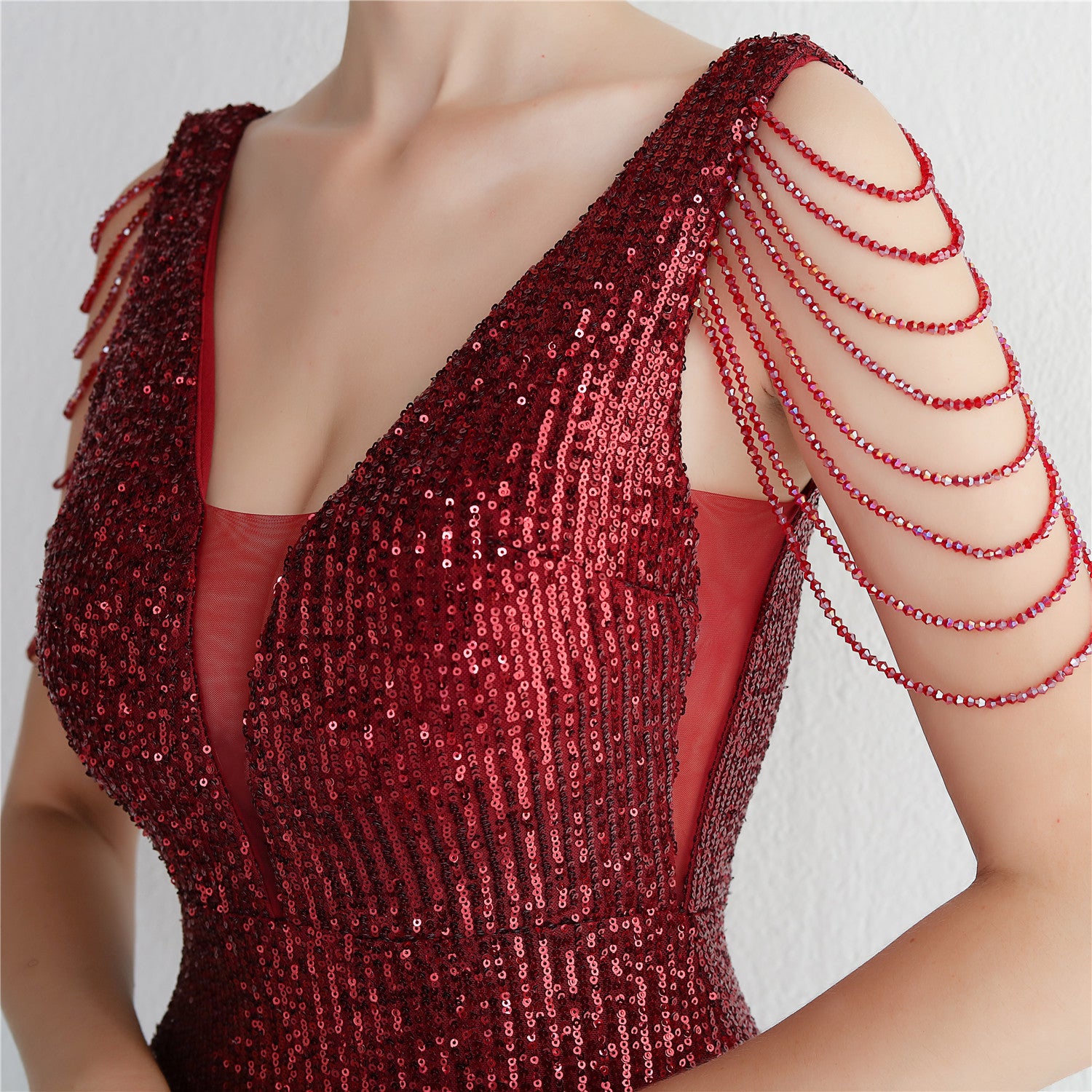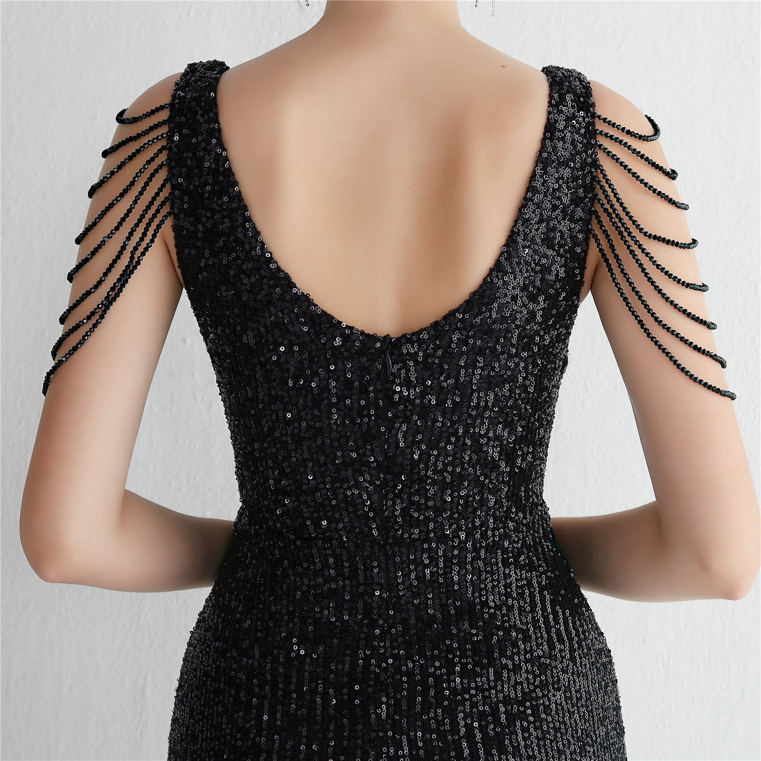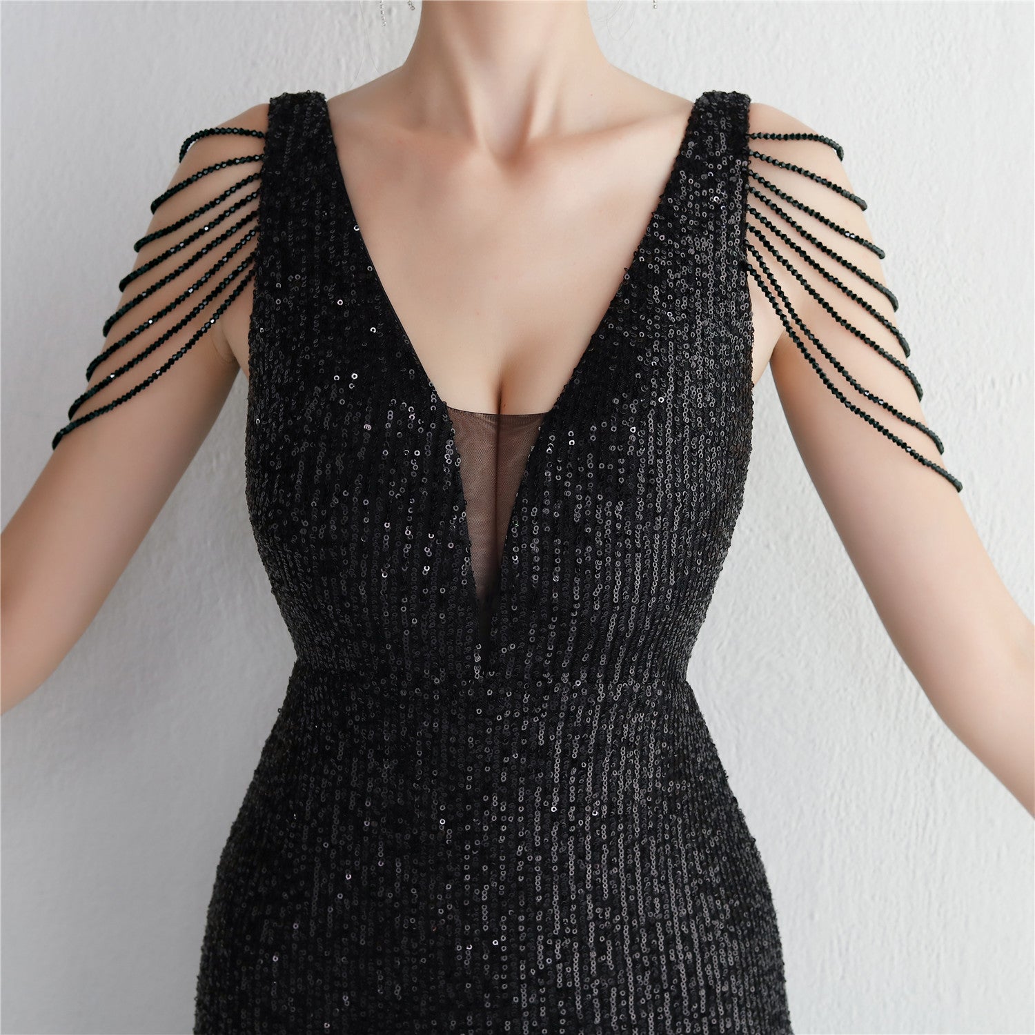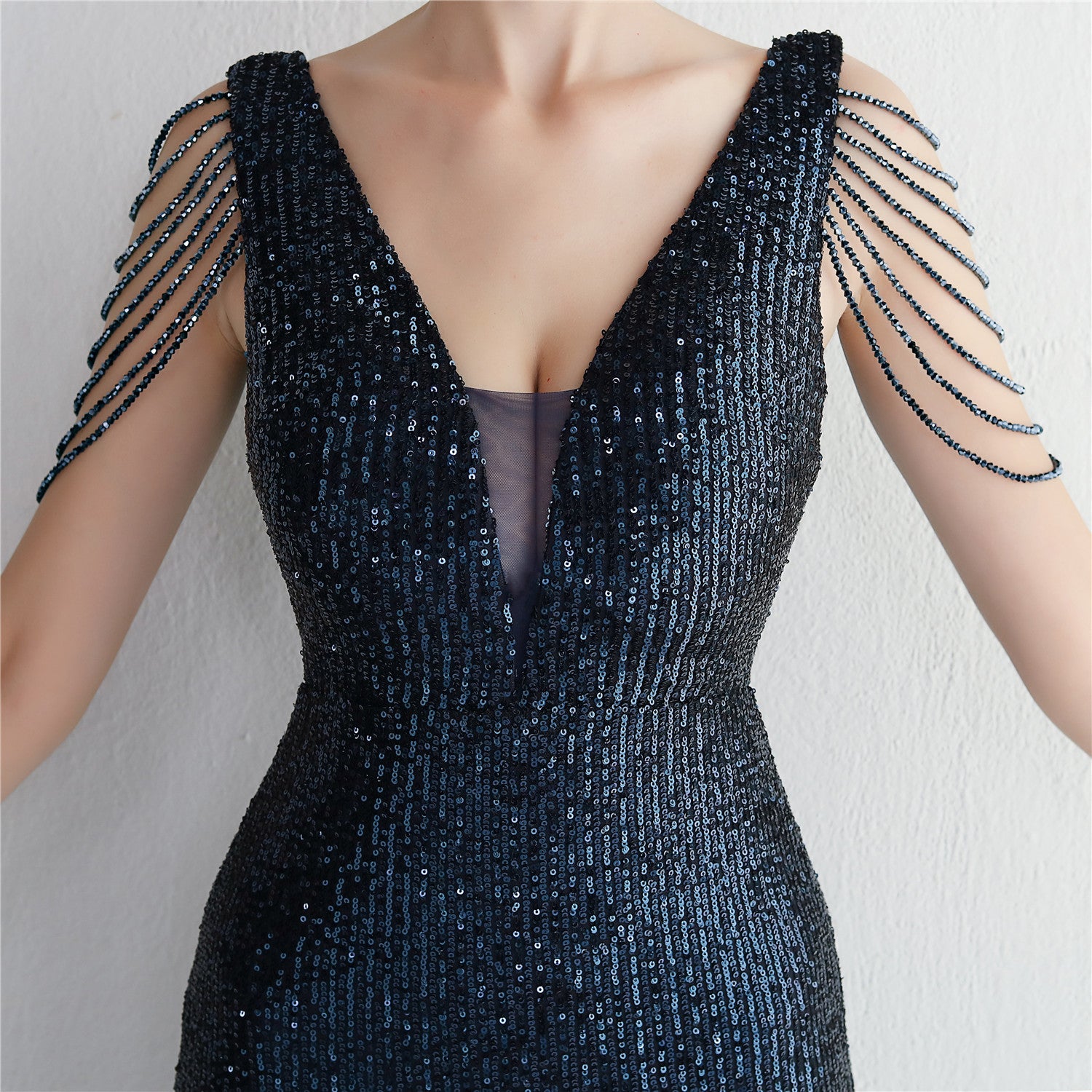 An ombre sequin maxi creates a slim, streamlined silhouette. A V-neckline with fringe accents adds subtle shimmer along the length.