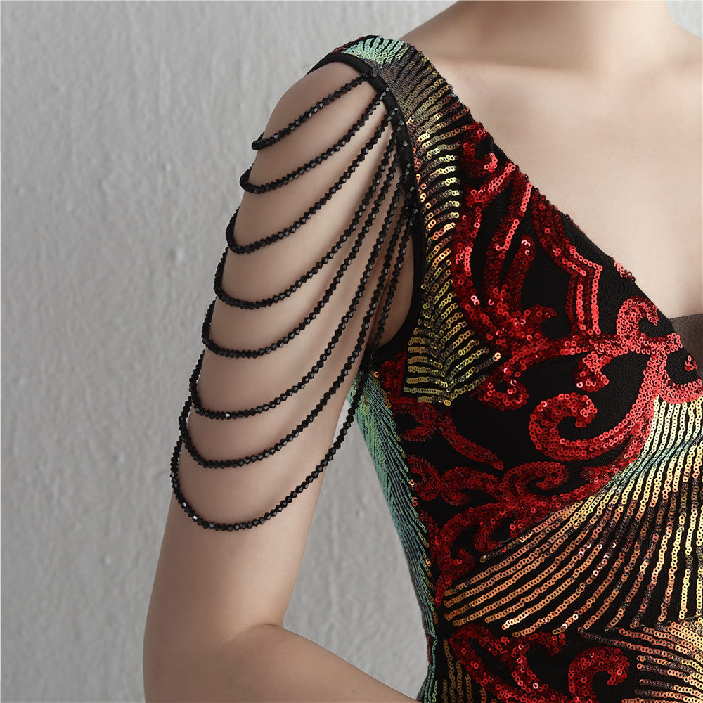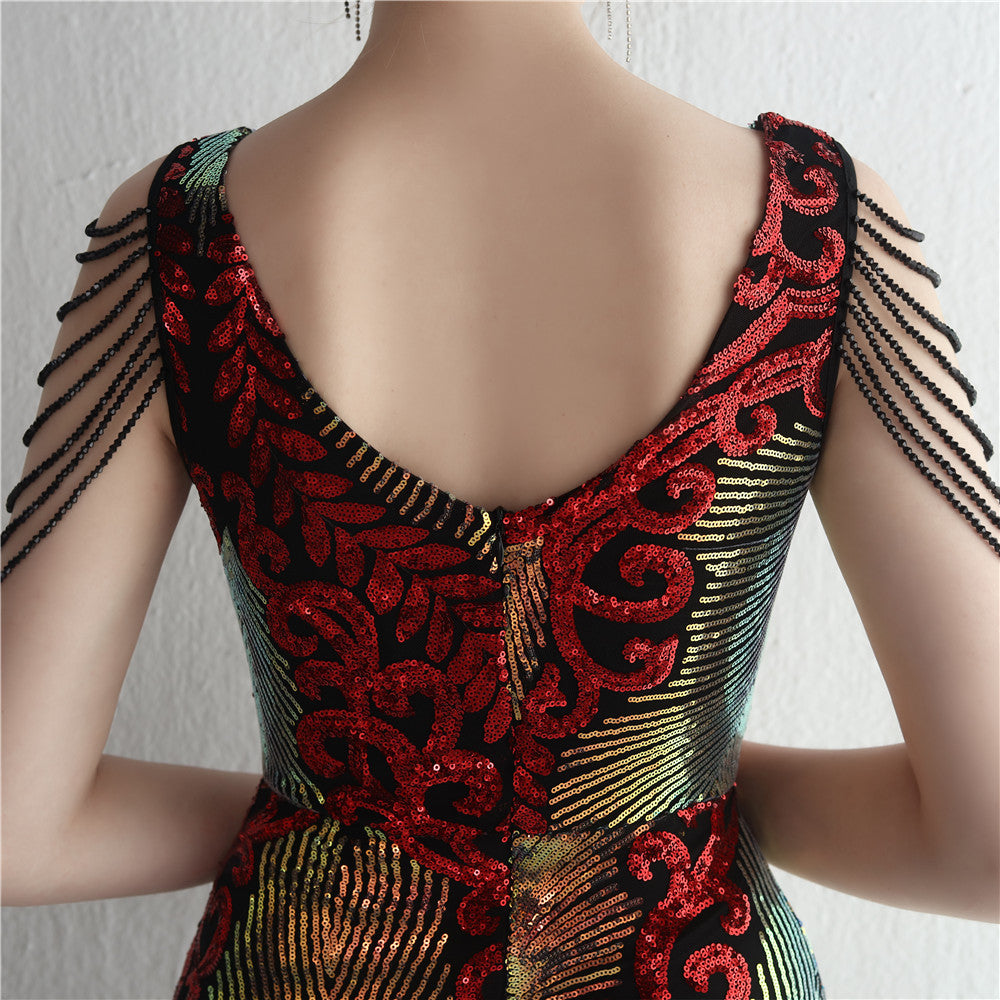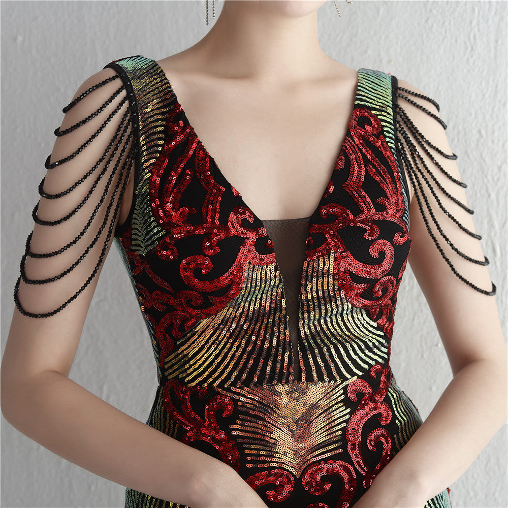 An elegant maxi with a slim silhouette. The V-neckline features sequin and rhinestone embellishment that cascades to a fishtail hem.