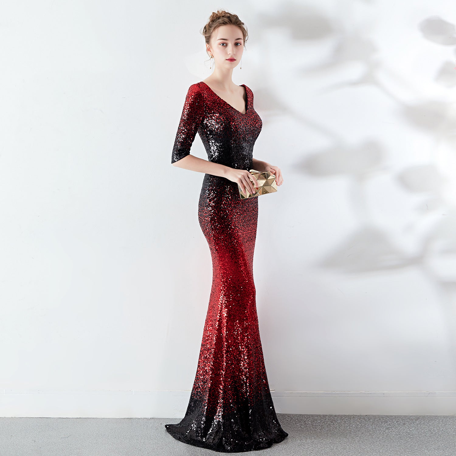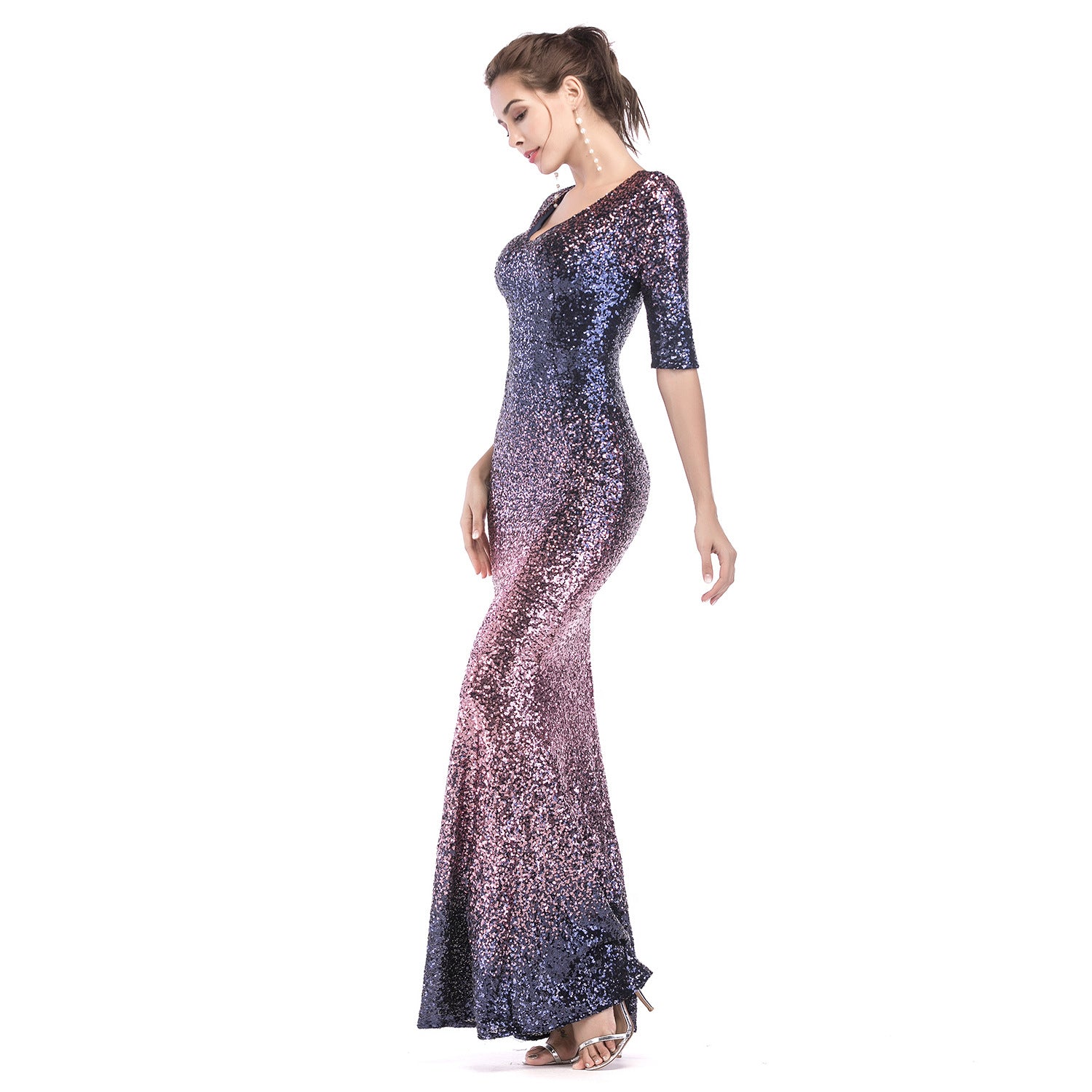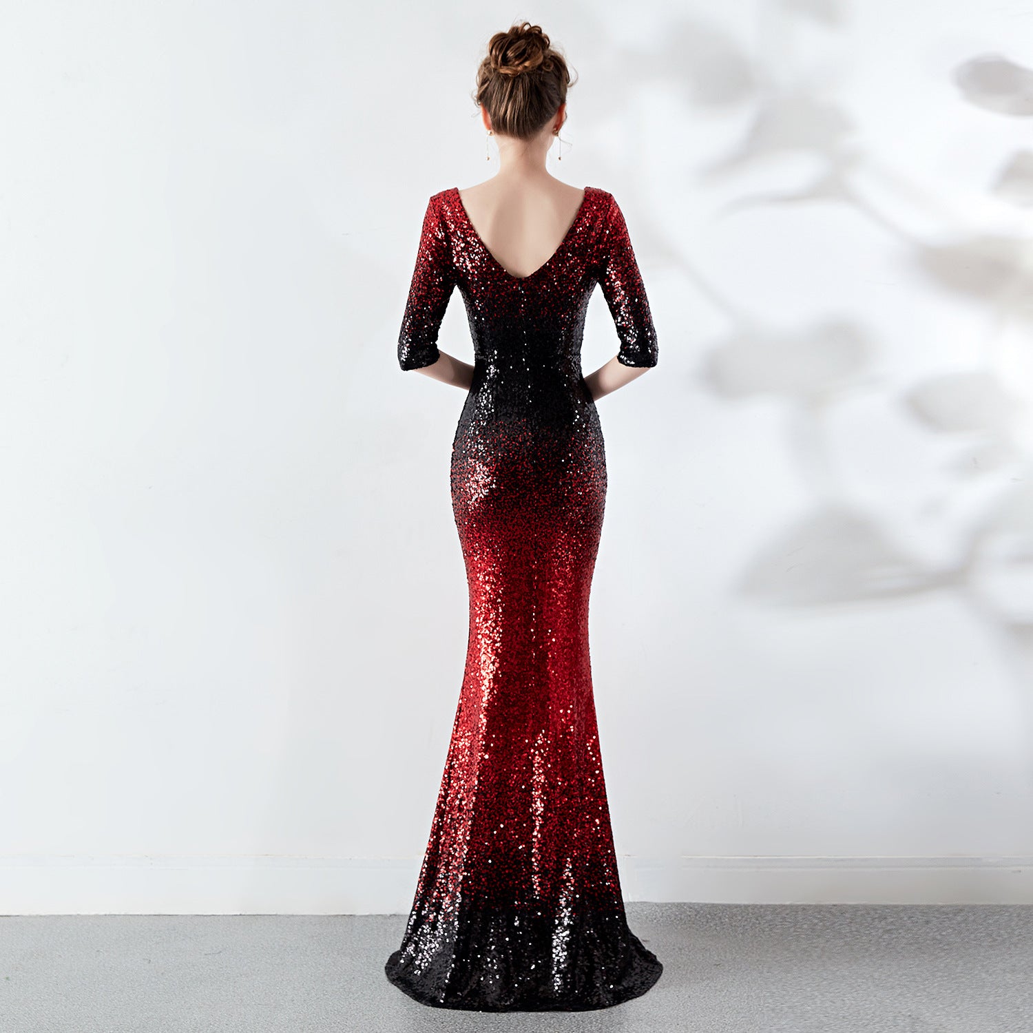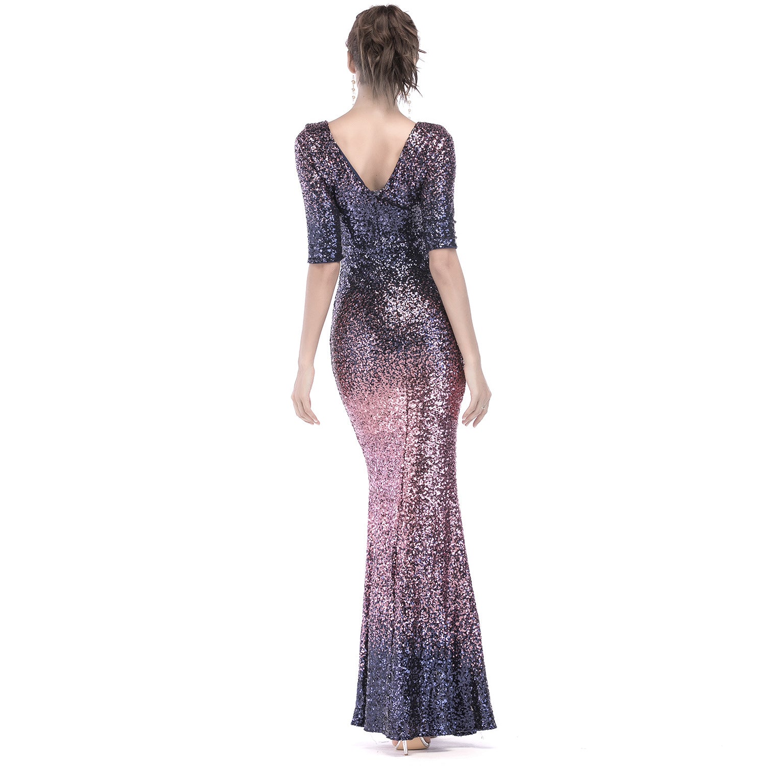 A sequined ombre fishtail maxi dress with a slim silhouette. It features a V-neck and shimmering sequin embellishment along the ombre fade.