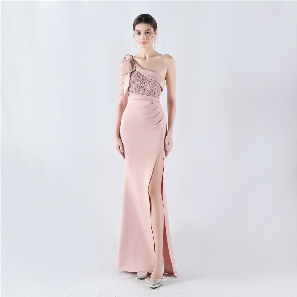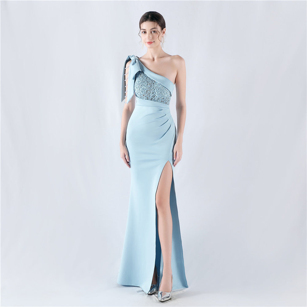 This maxi dress presents a clean, sculpted silhouette with a one-shoulder neckline. An asymmetric hem and subtle embroidery, folding details and a front split complete the refined design.
