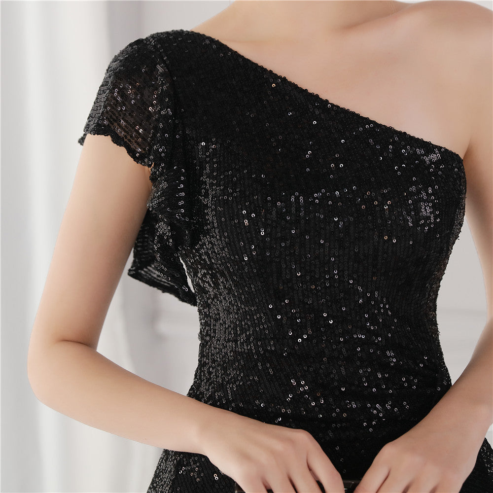 An asymmetric, one-shoulder maxi dress with a clean, slim silhouette. It features sequin embellishment and a high side split.
