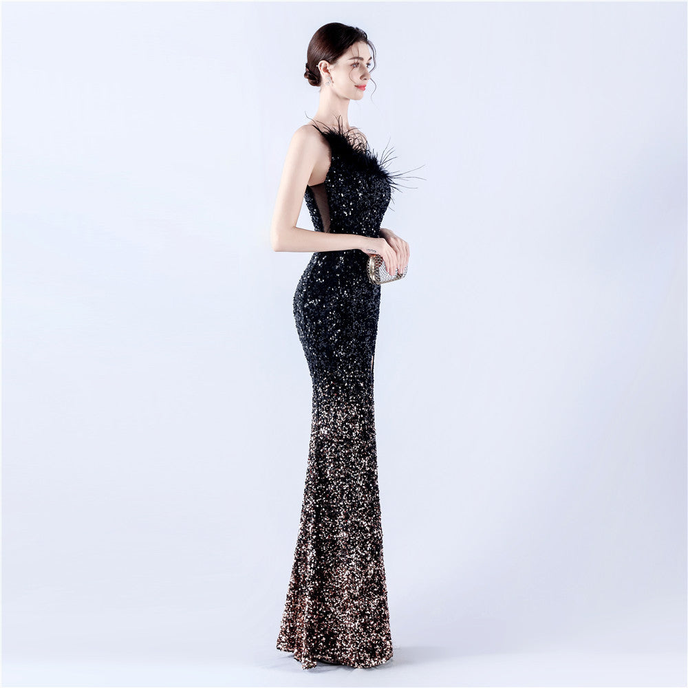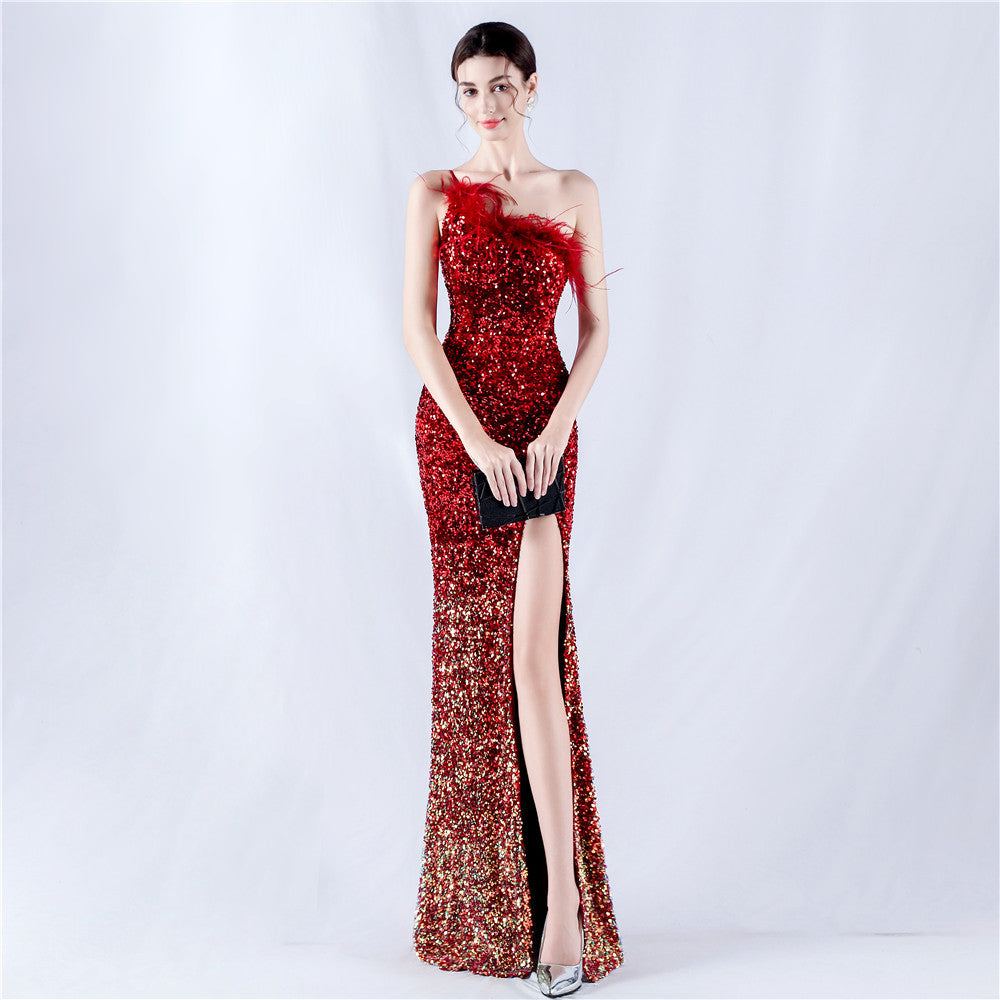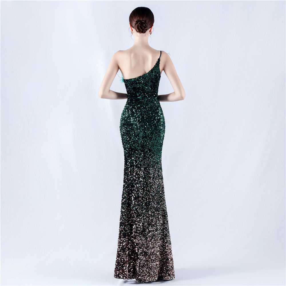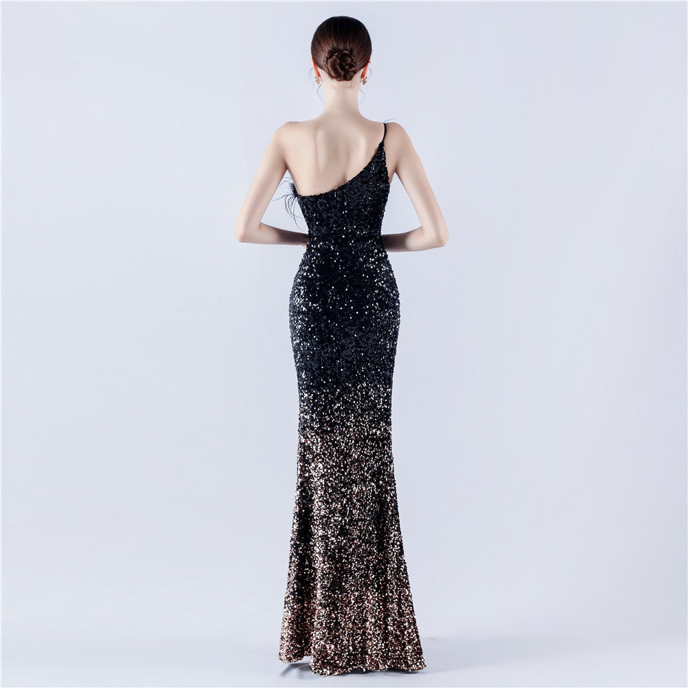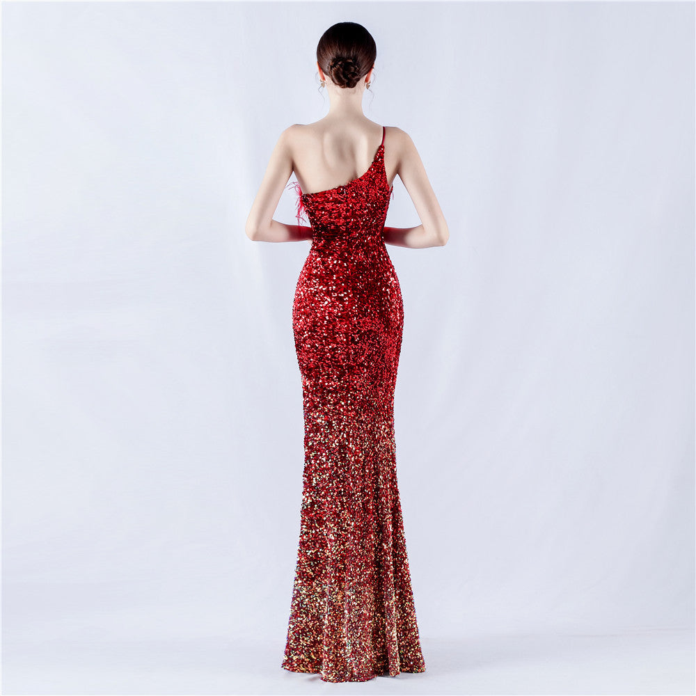 A slim, one-shoulder maxi with a floor-length silhouette. Feathered sequin embellishment accents the asymmetrical neckline and split, finished with a concealed zipper.