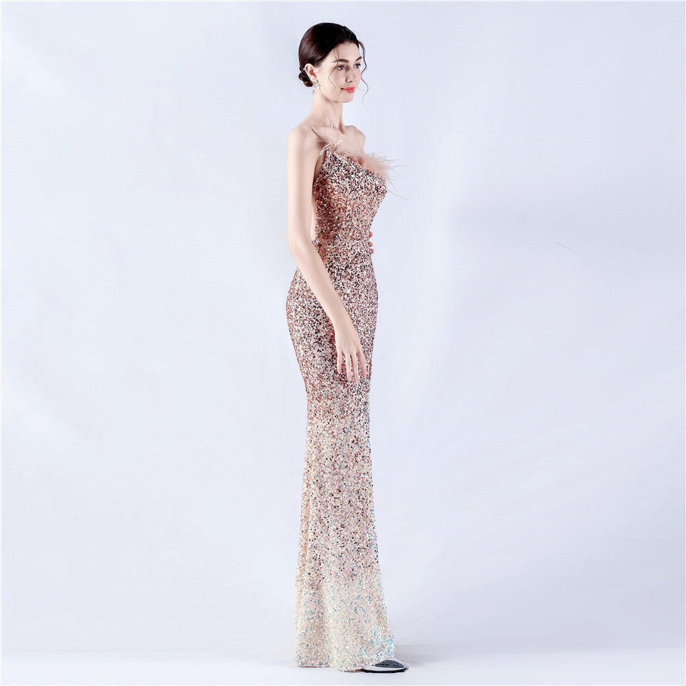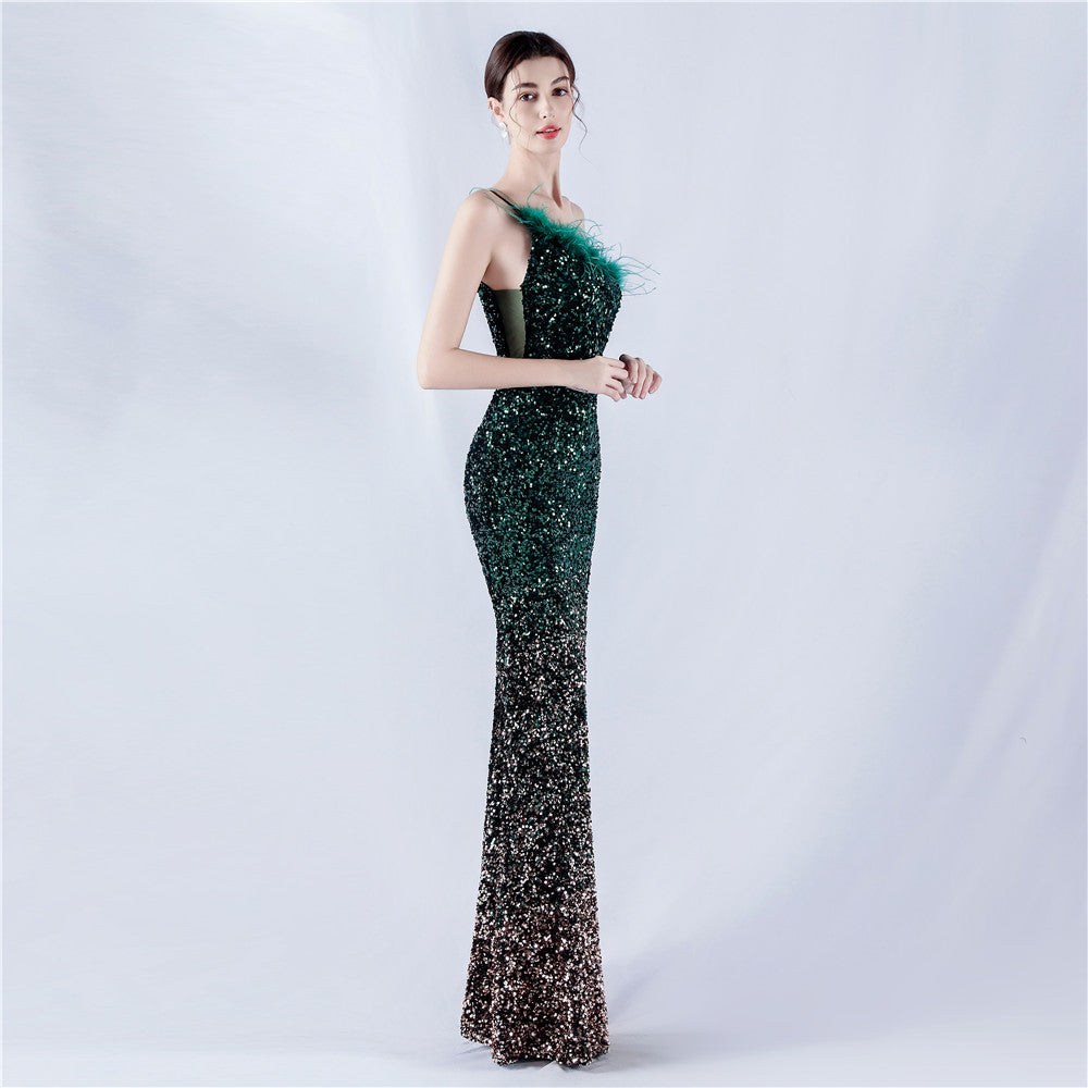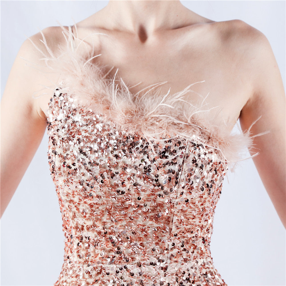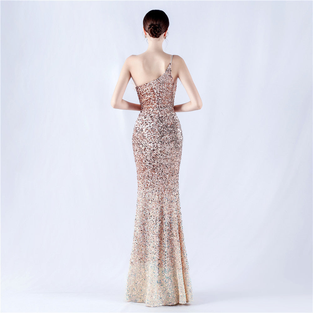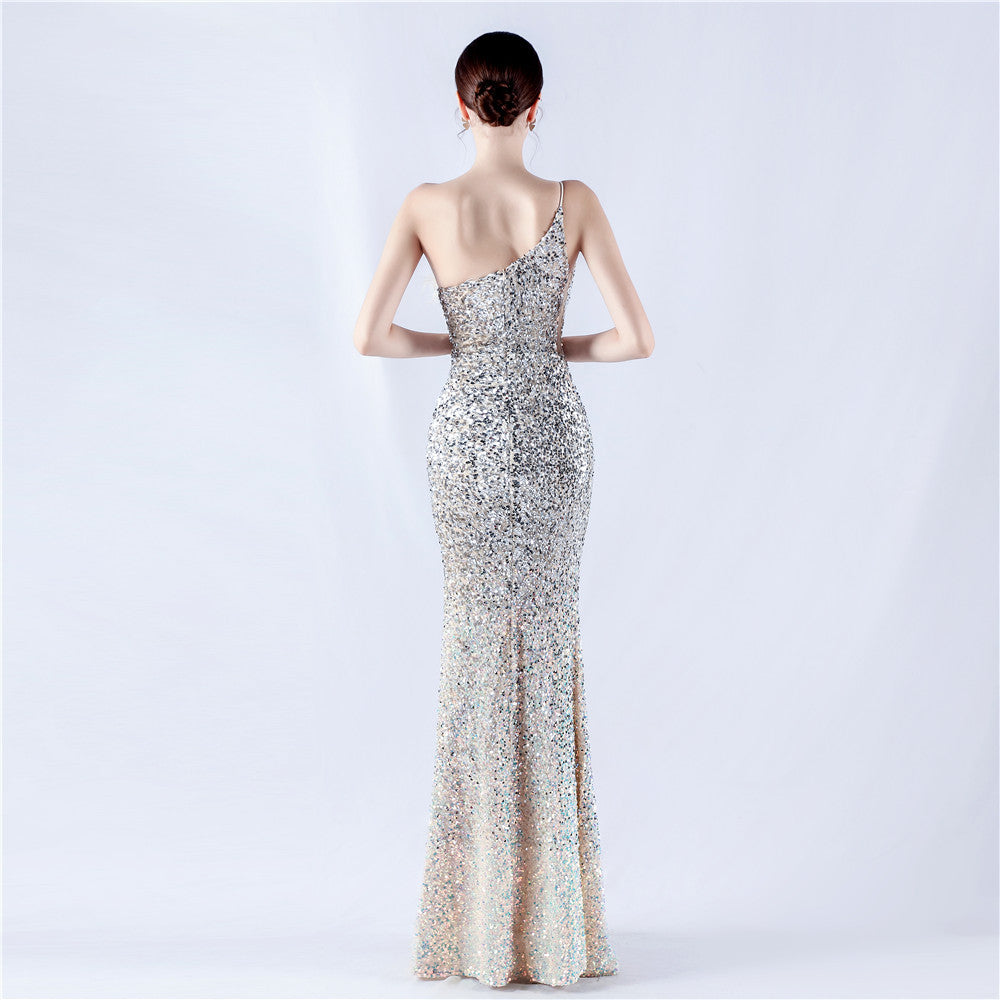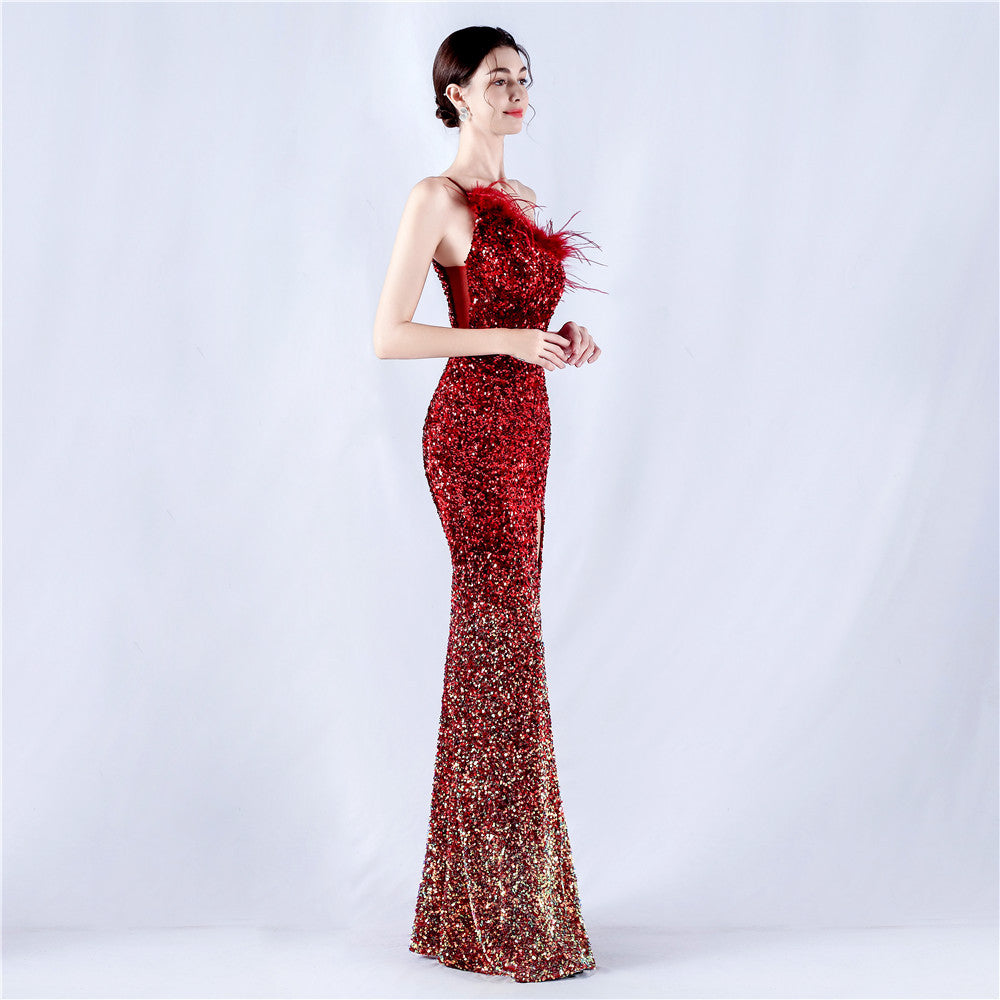 A slim, one-shoulder maxi with a floor-length silhouette. Feathered sequin embellishment accents the asymmetrical neckline and split, finished with a concealed zipper.