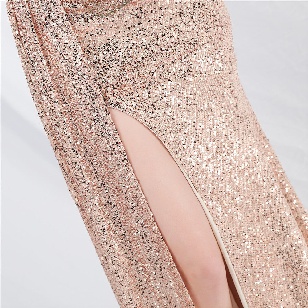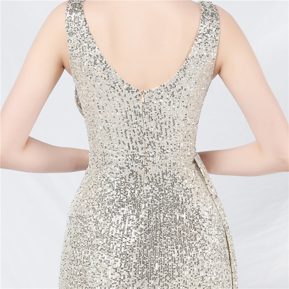 An elegant maxi with a clean A-line silhouette. It features a V-neck, a sleeveless bodice, and a subtle side split with sequin embellishment.