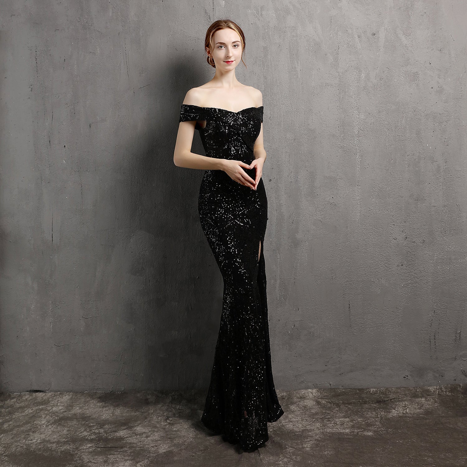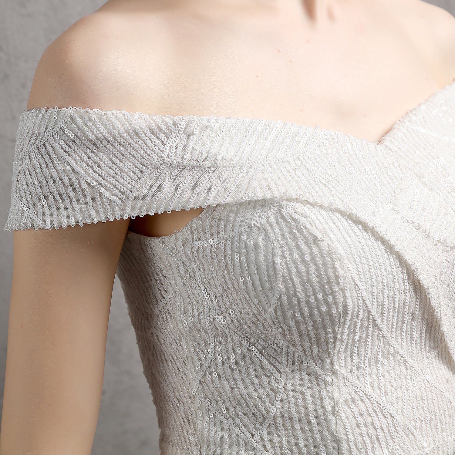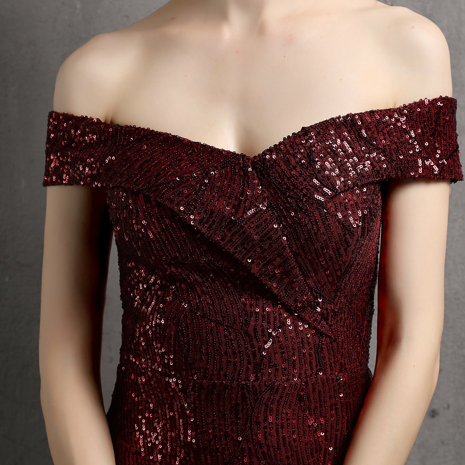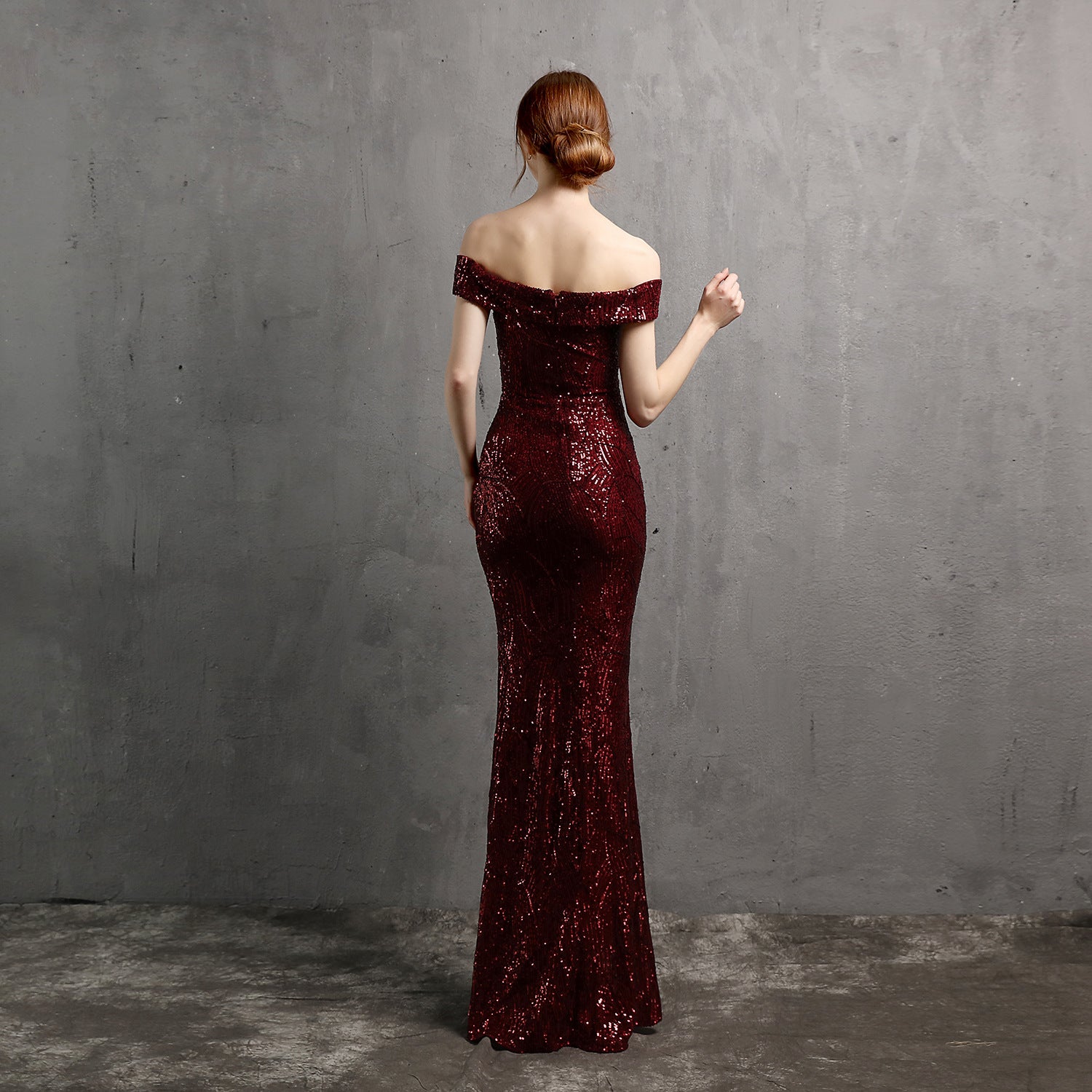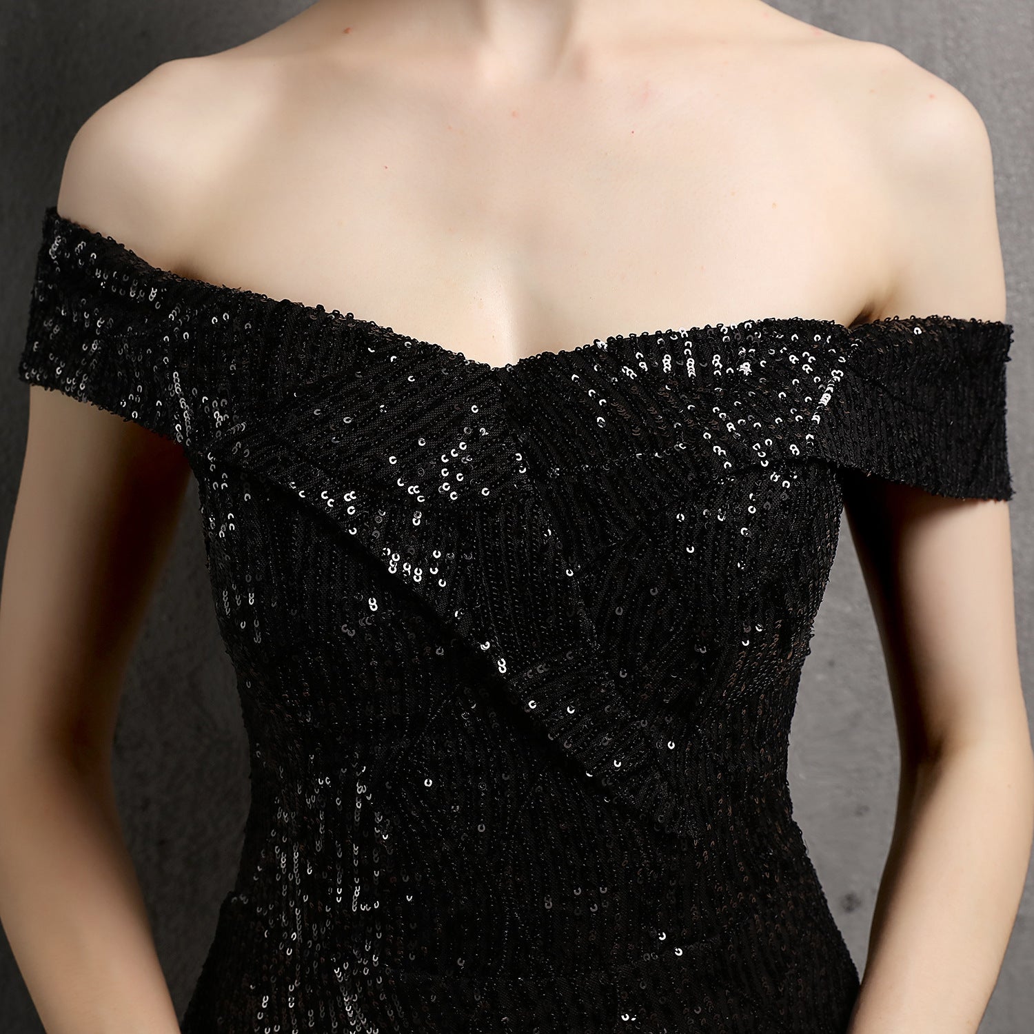 A streamlined off-shoulder maxi with an asymmetric hem and a slim silhouette. Sequins shimmer along the body, and a hidden zipper completes the look.