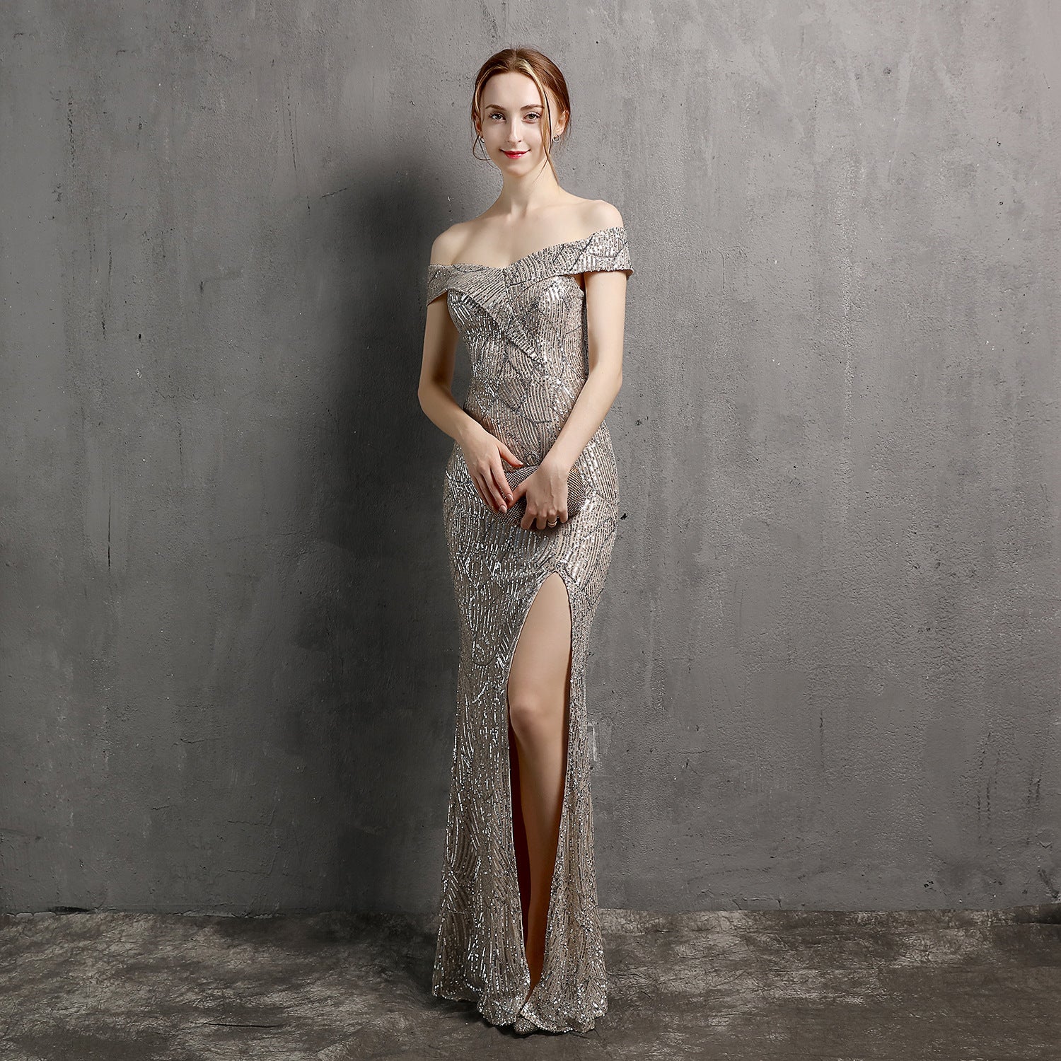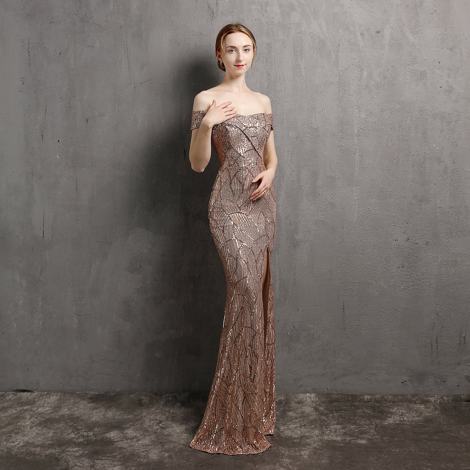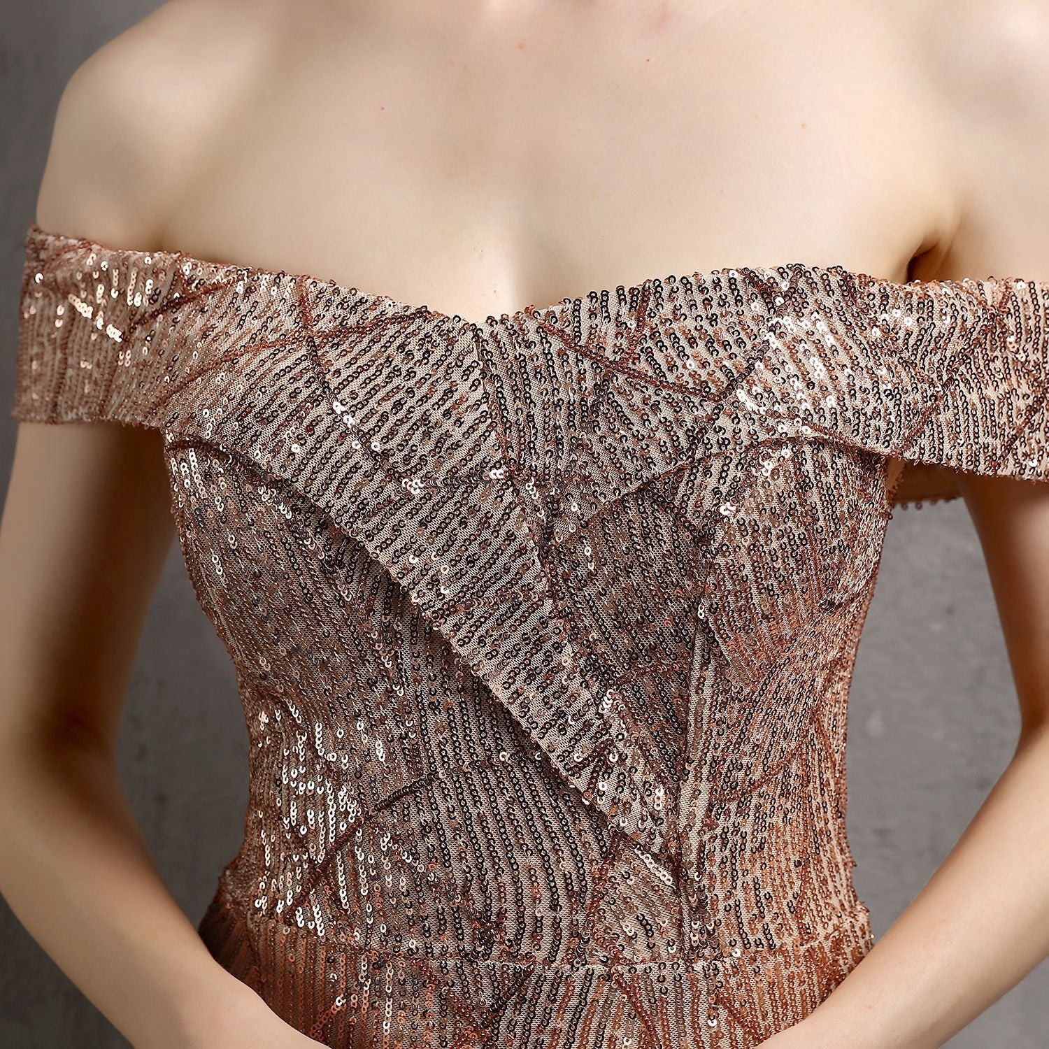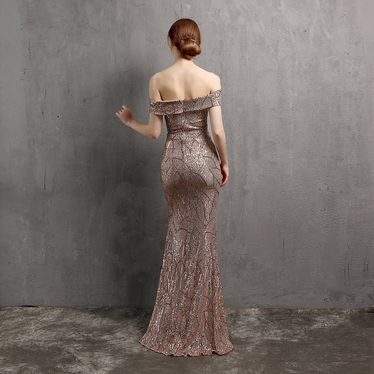 A streamlined off-shoulder maxi with an asymmetric hem and a slim silhouette. Sequins shimmer along the body, and a hidden zipper completes the look.
