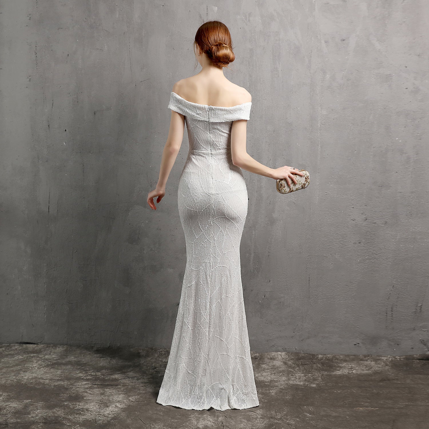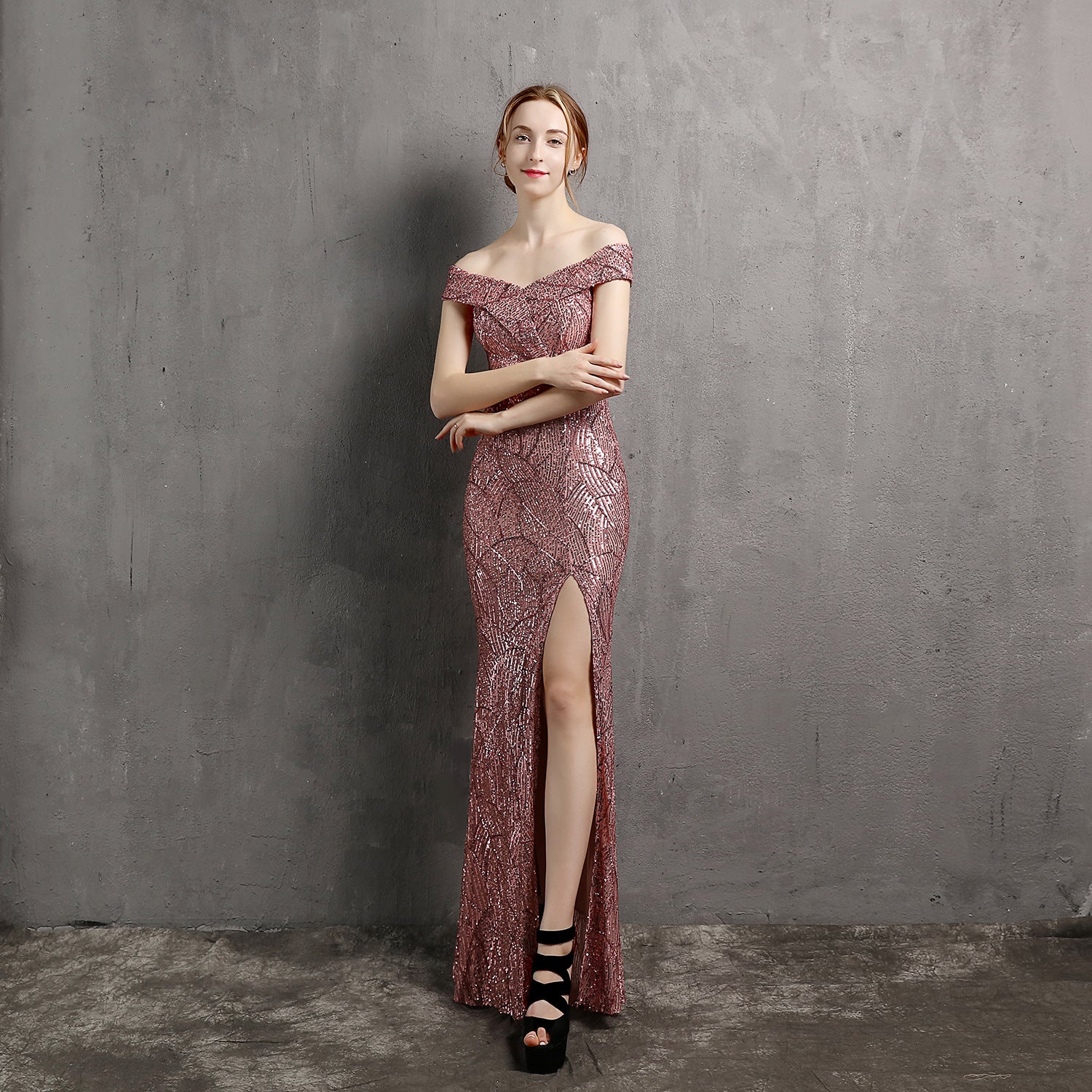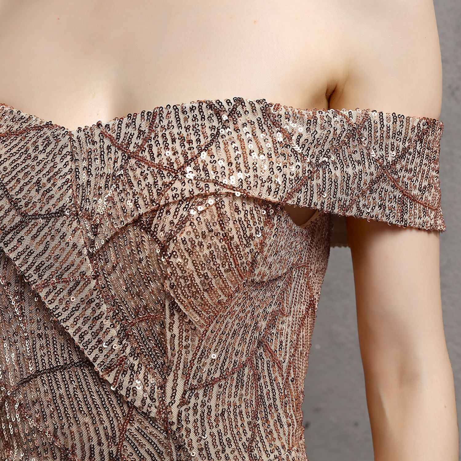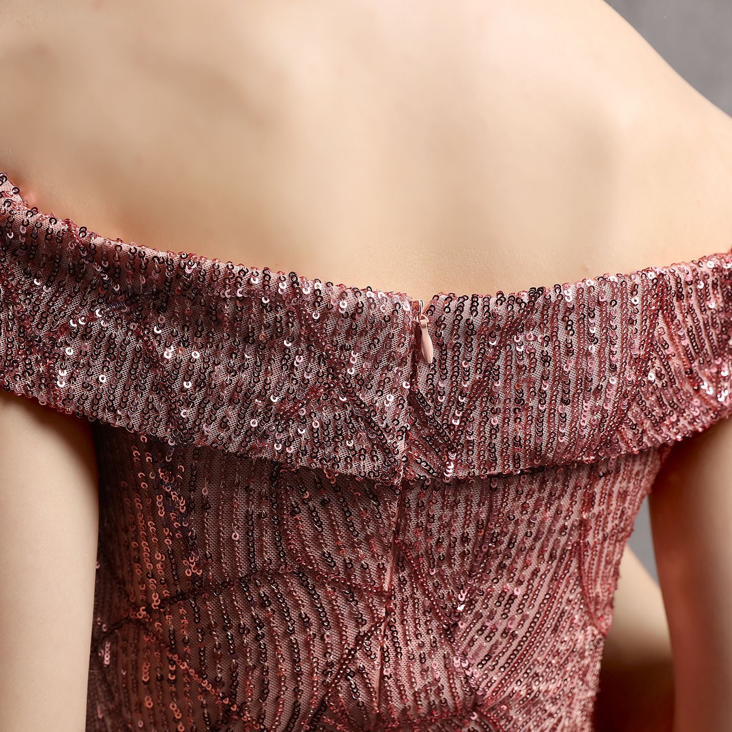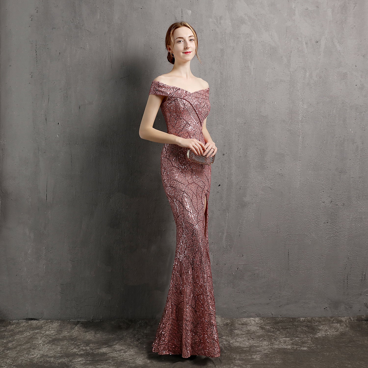A streamlined off-shoulder maxi with an asymmetric hem and a slim silhouette. Sequins shimmer along the body, and a hidden zipper completes the look.