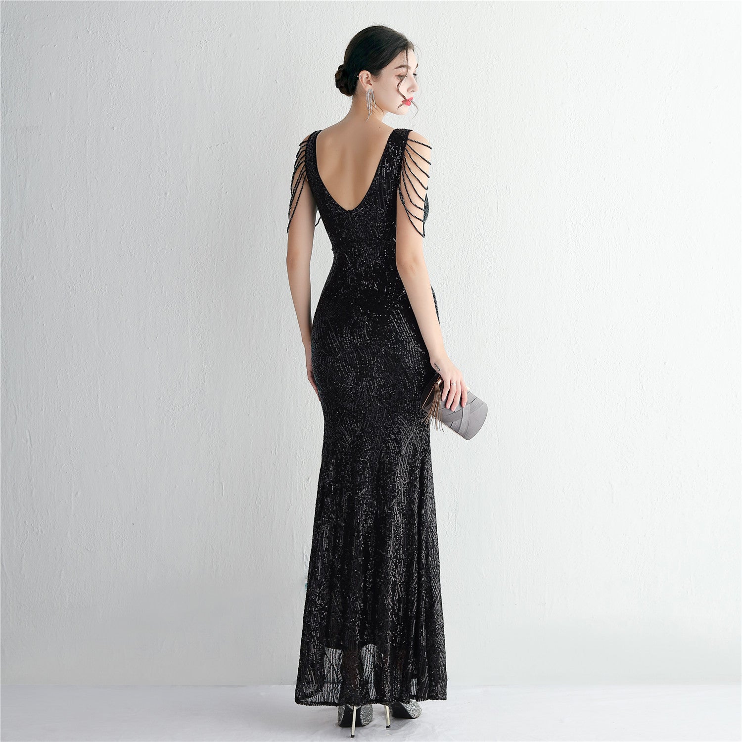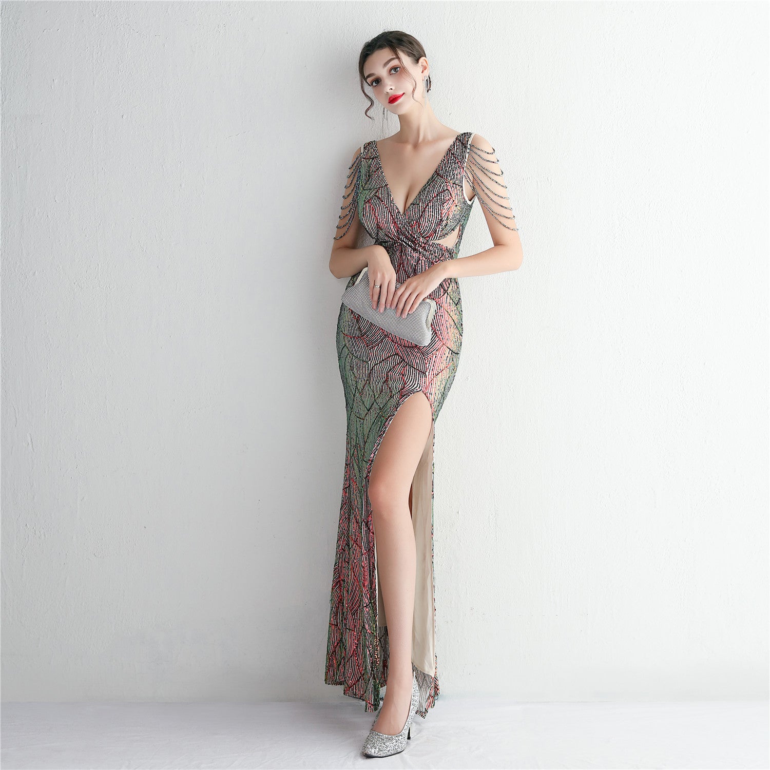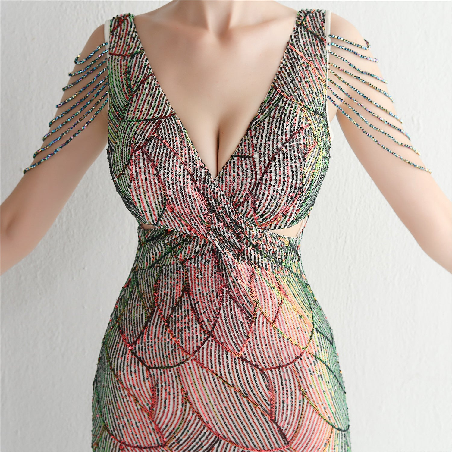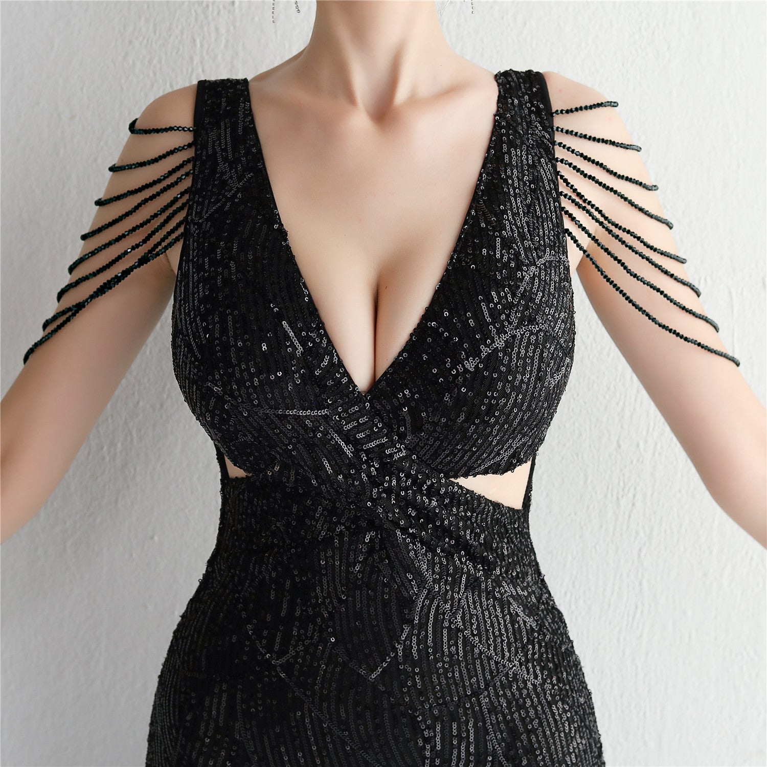 An elegant, slim-cut maxi with a fishtail silhouette. The V-neckline features sequins, fringe and cutouts.