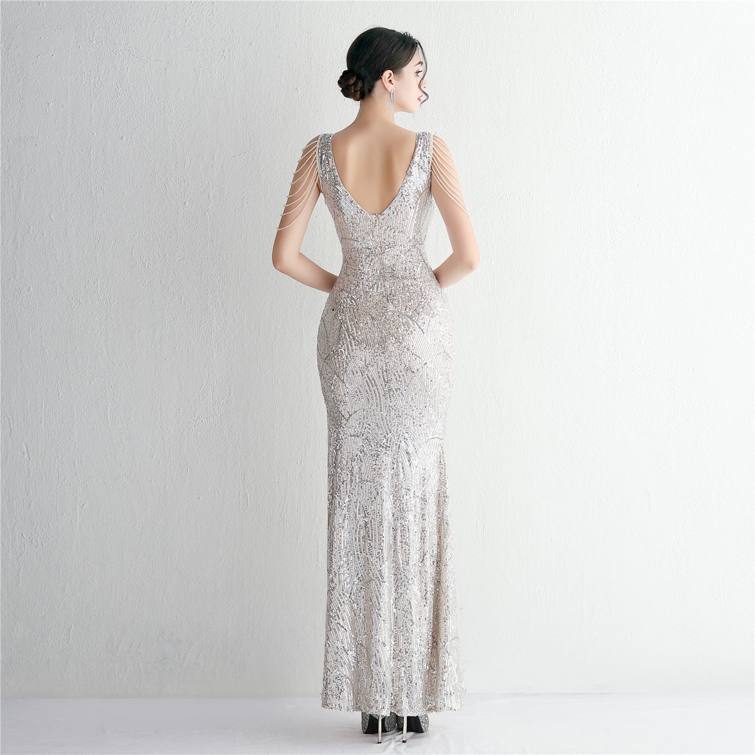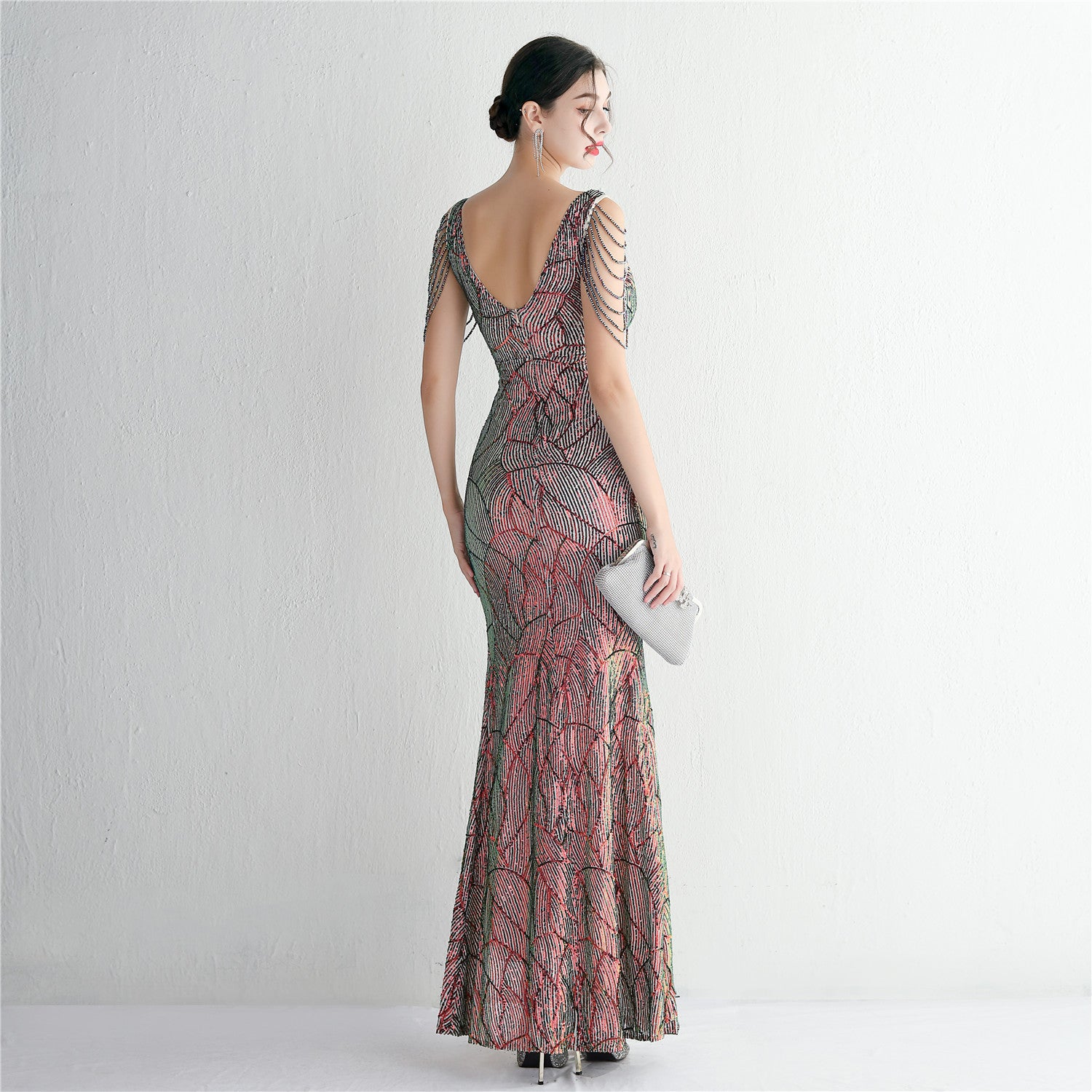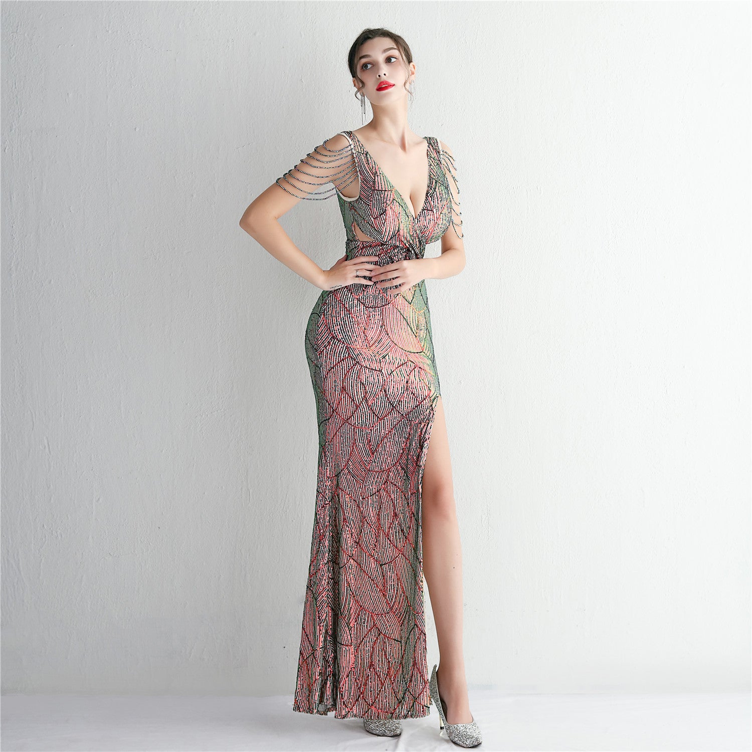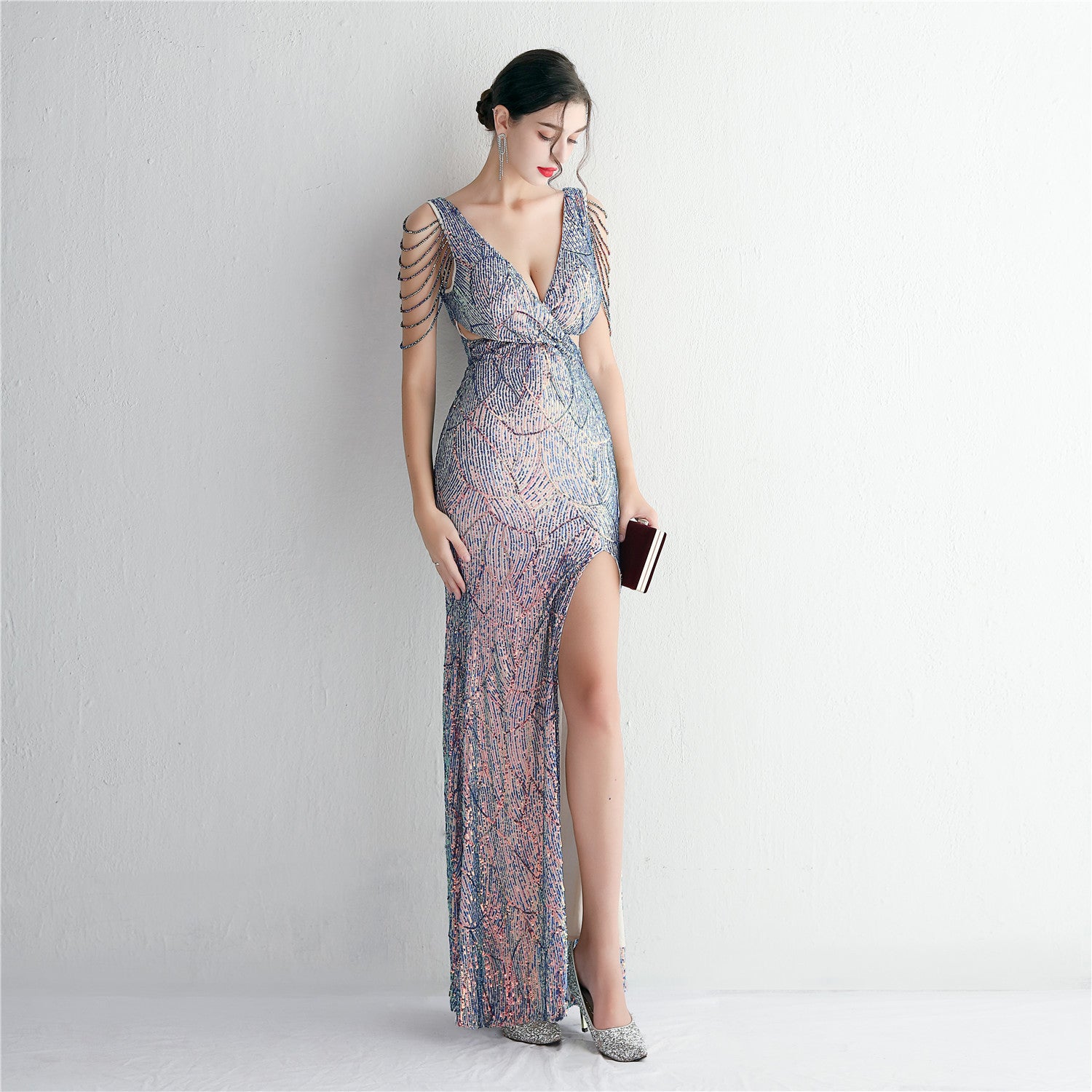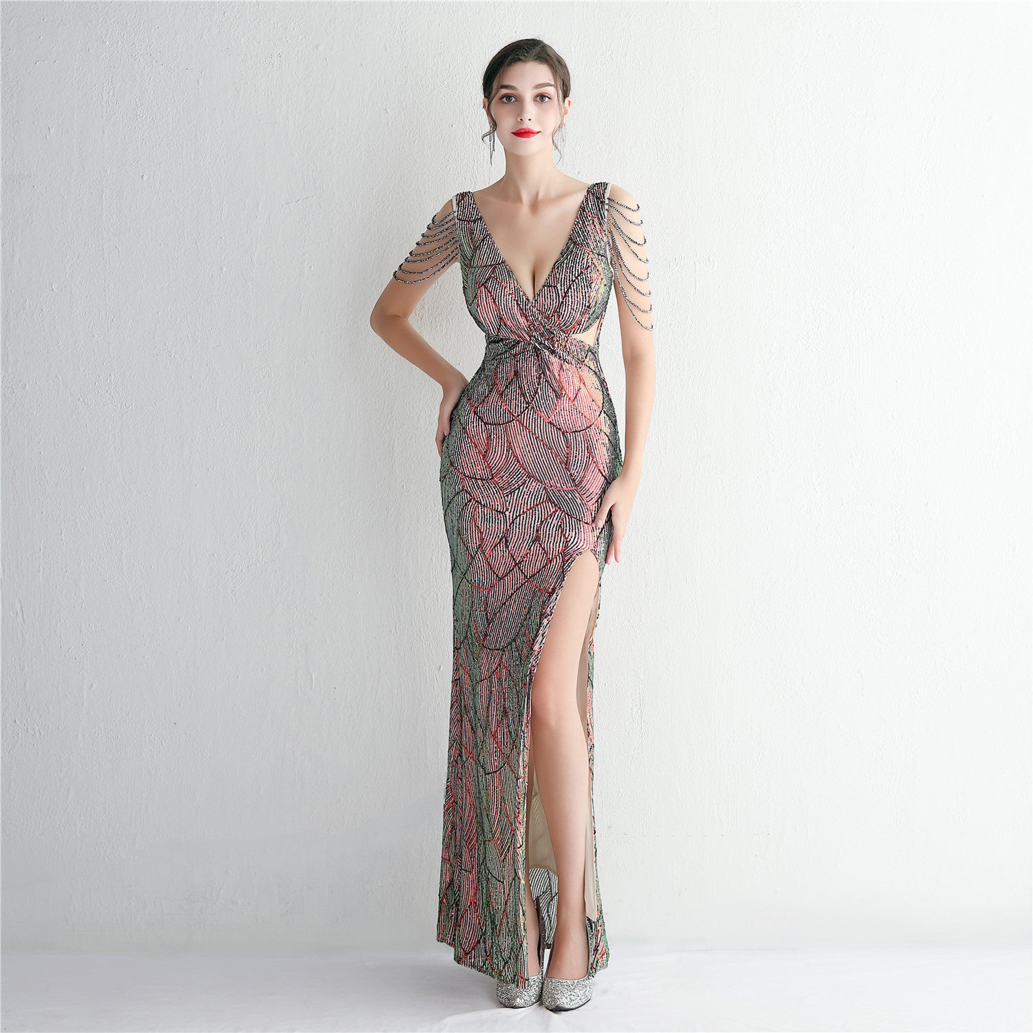 An elegant, slim-cut maxi with a fishtail silhouette. The V-neckline features sequins, fringe and cutouts.