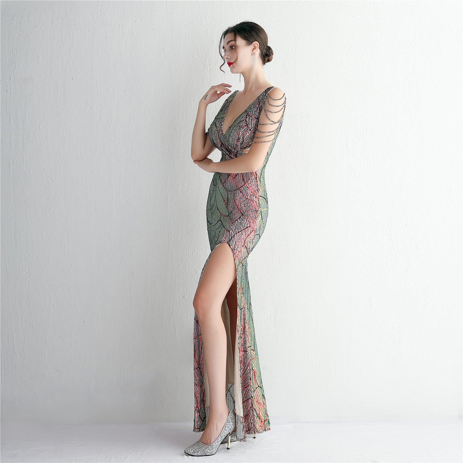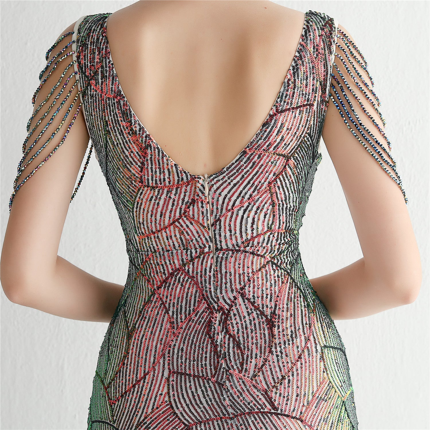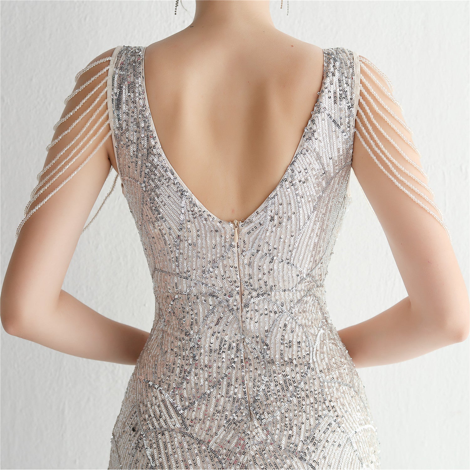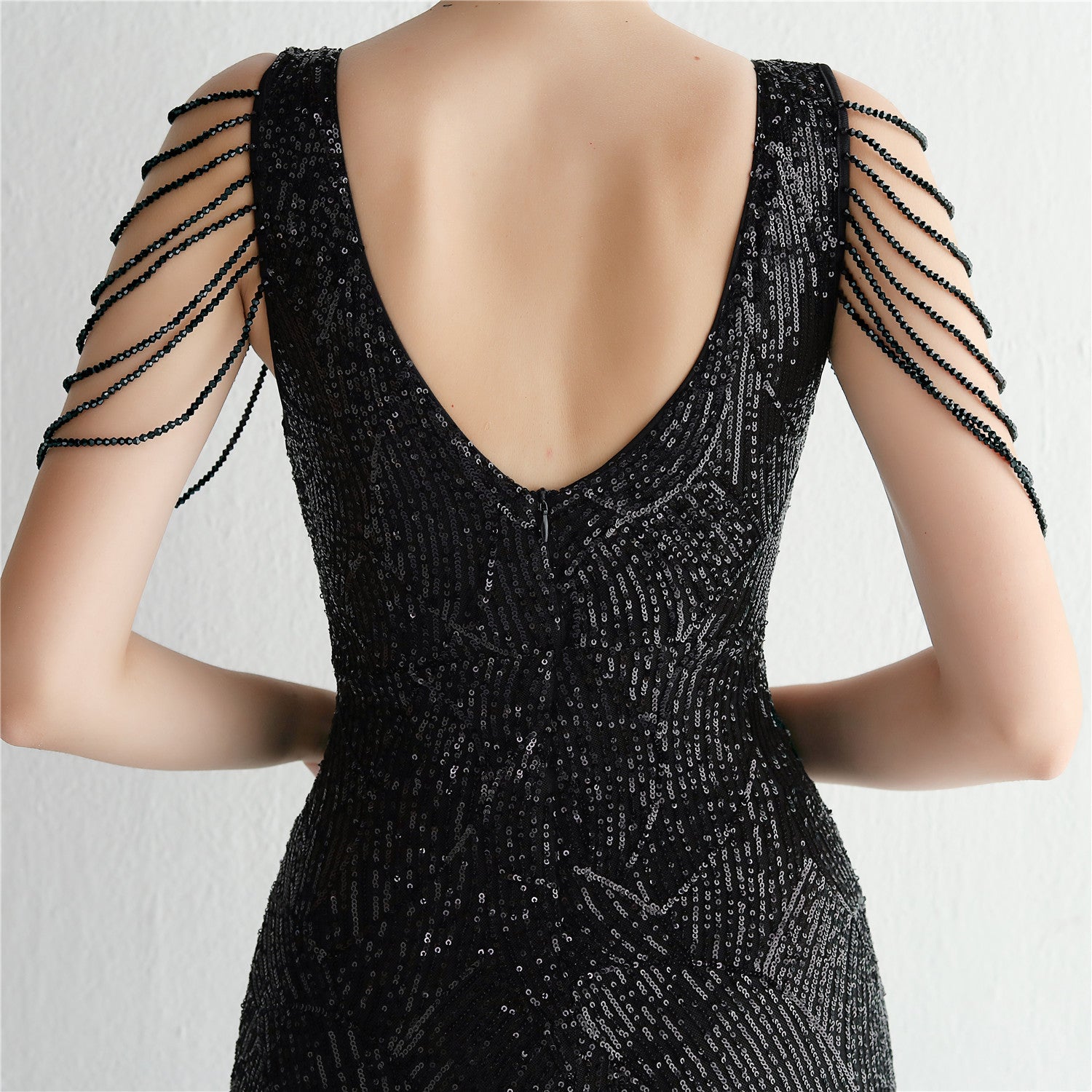 An elegant, slim-cut maxi with a fishtail silhouette. The V-neckline features sequins, fringe and cutouts.